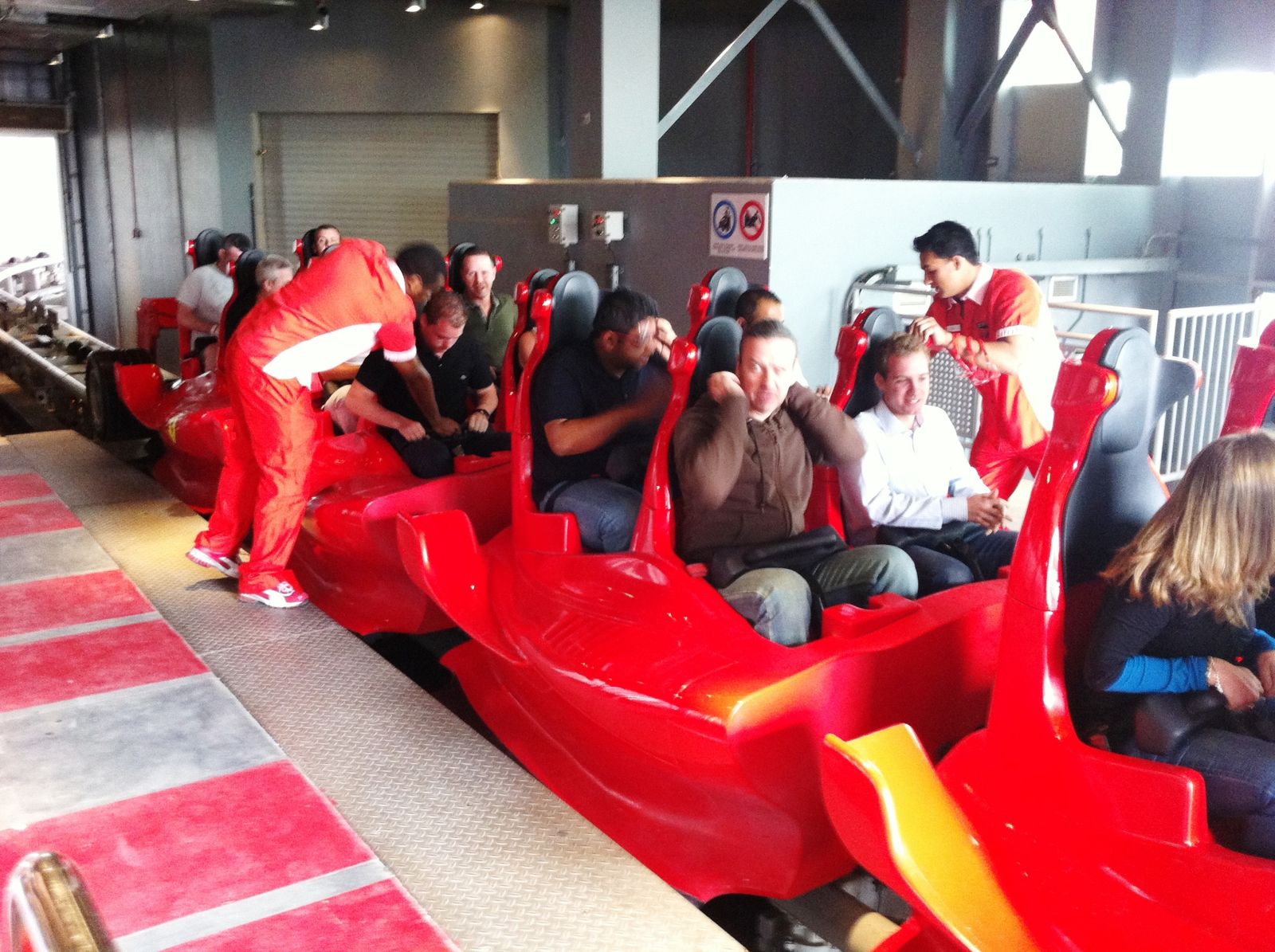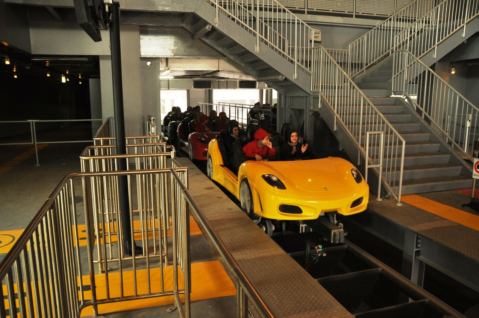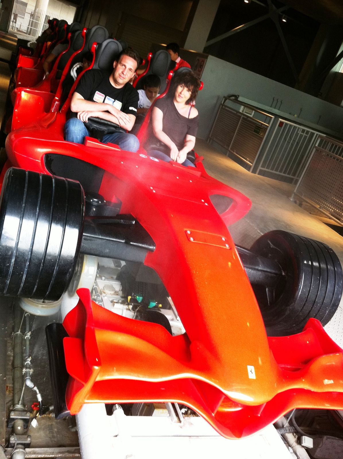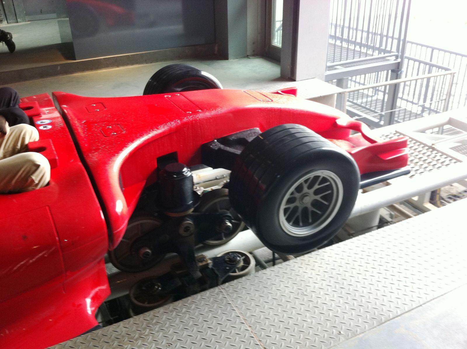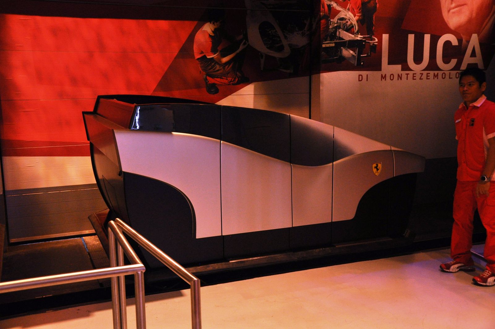 Hier bekommt man einen einigermaßen witzigen Film gezeigt, in welchem ein Angestellter, welcher heute seinen ersten Arbeitstag bei Ferrari in Maranello hat, zu einer Testfahrt mit Fernando Alonso eingeladen wird, der natürlich ordentlich Gas gibt. Dabei bewegen sich die Sitze, damit man den Speed und die Kurven mitfühlen kann. Allerdings neigen sich die Sitze in die falsche Richtung. Meiner Meinung nach müssten sich diese in einer Rechtskurve nach links bewegen, aber sie folgen eher der Bewegung der Mitfahrer und schwenken ebenfalls nach rechts.