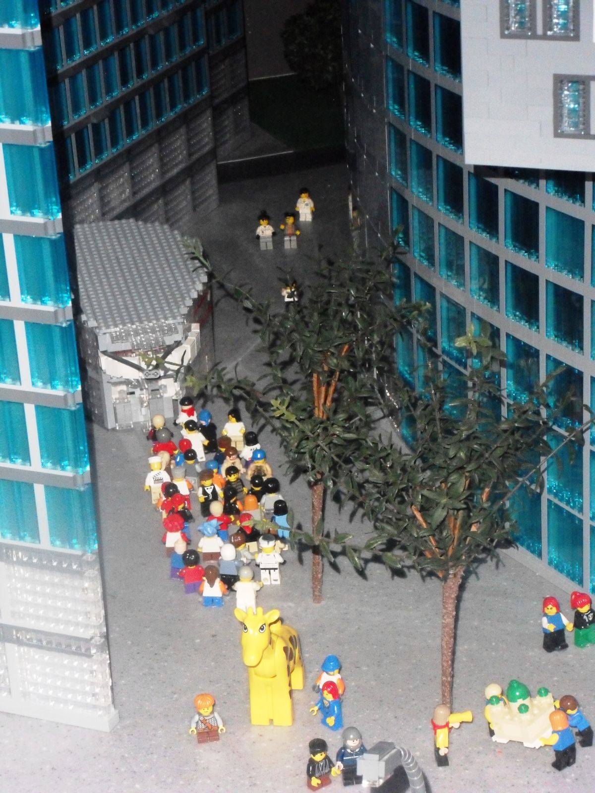 Der Eingang befindet sich, gut versteckt zwischen den vielen Kinos, am Potsdamer Platz. Hier befindet sich aber auch wirklich nur der Eingang, das Legoland befindet sich eine Etage tiefer unter der Erde. Nur eine Giraffe zeigt den Weg zur Merlin-Attraktion.