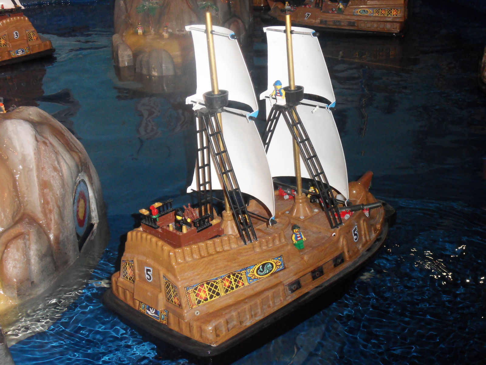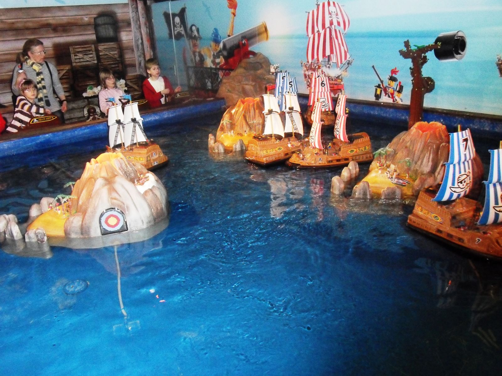 Im nächsten Raum stand die neueste „Attraktion“. Hinter der Piratenschlacht verbirgt sich nichts weiter als ein Wasserbecken, auf dem man ein paar Schiffe lenken kann. Als einzige Innovation wurden ein paar schwimmende Felsen mit Zielscheiben installiert, die bei einer Bootsberührung eine Wasserfontäne in die Luft pusten.