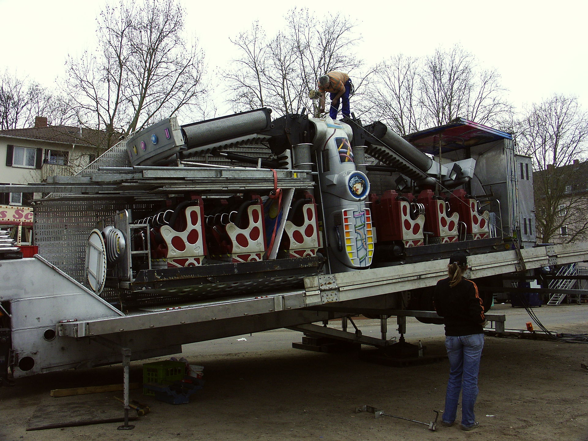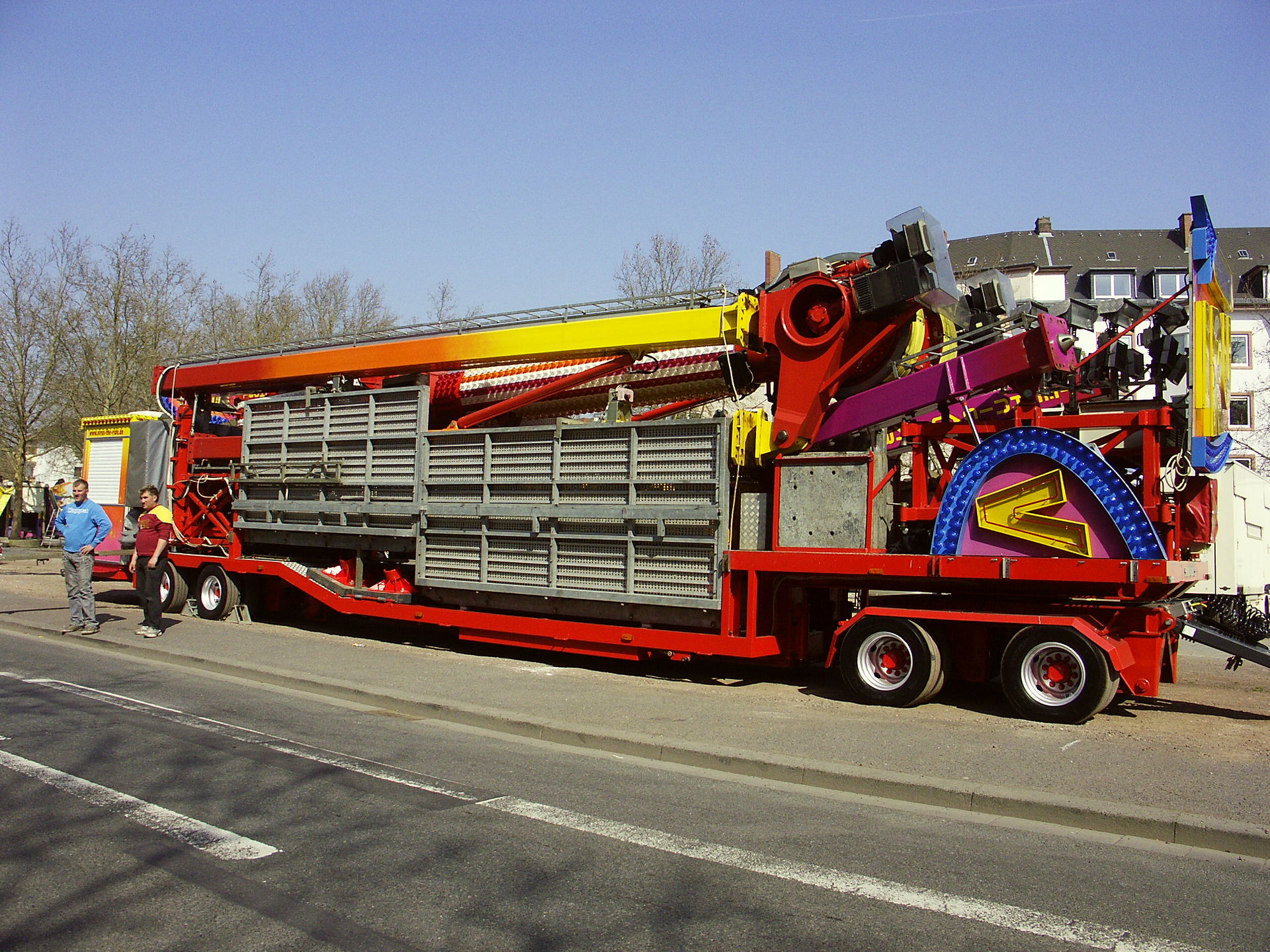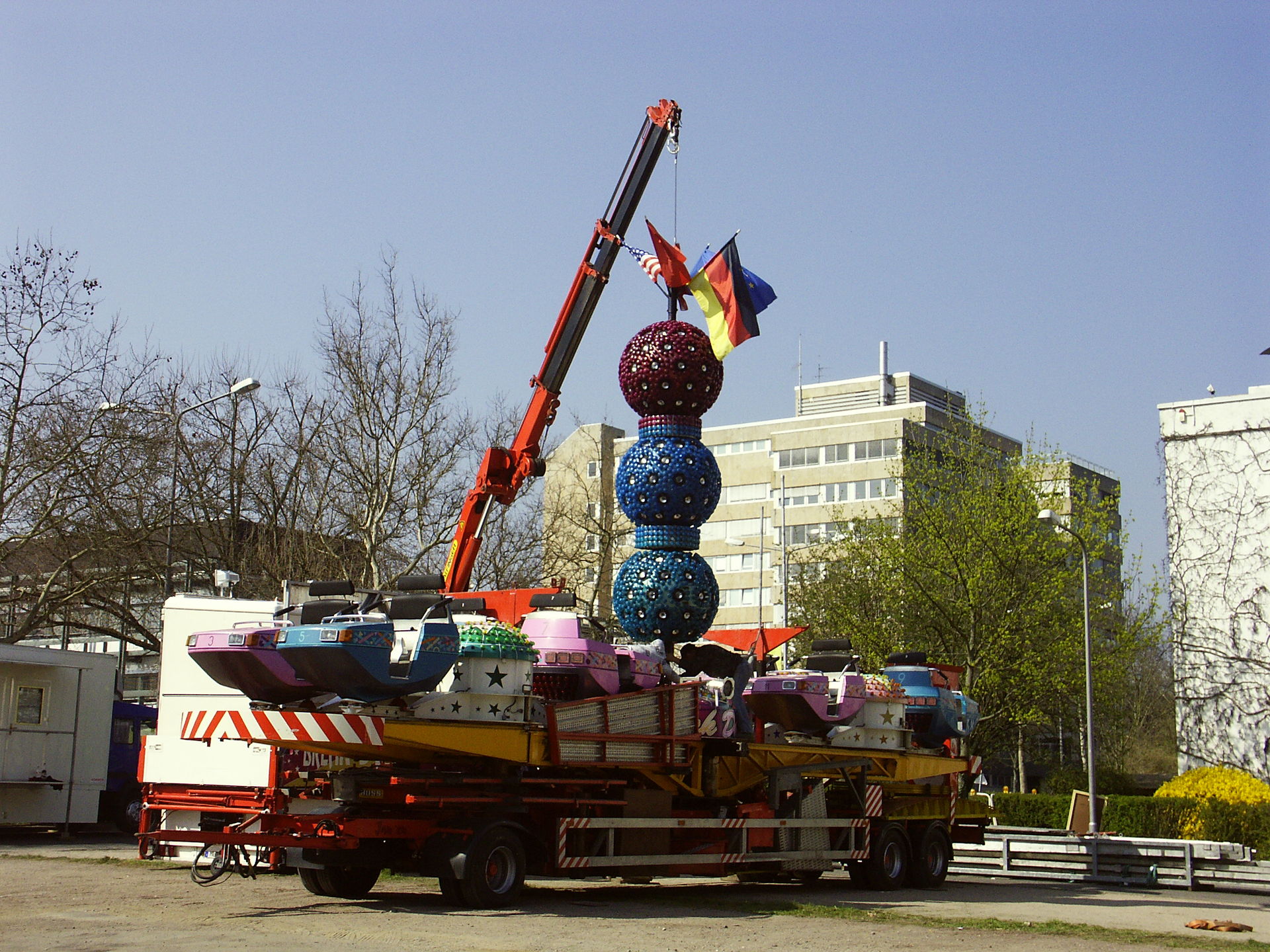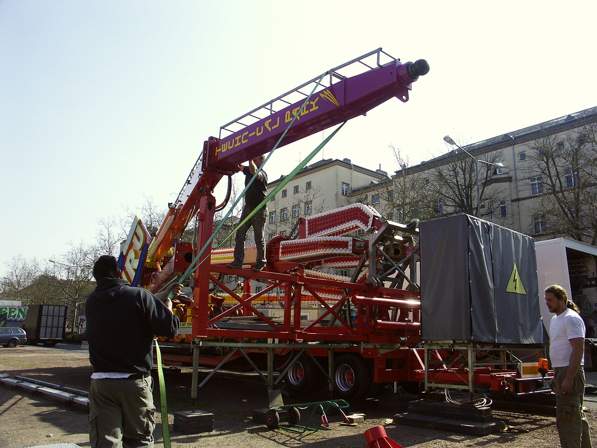 Die vor der Inbetriebnahme durchgeführte Sonderprüfung und TÜV-Abnahme waren ohne Beanstandung. Somit konnte der Premiereplatz angefahren werden, auch ohne Kugel und Polyp. In absehbarer Zeit wird auf die Mitte was neues kommen. Wichtig ist, er ist fahrbereit und die vertraglichen Plätze können angefahren werden. Die Familie Nickel hat hier eine ware Meisterleistung vollbracht.