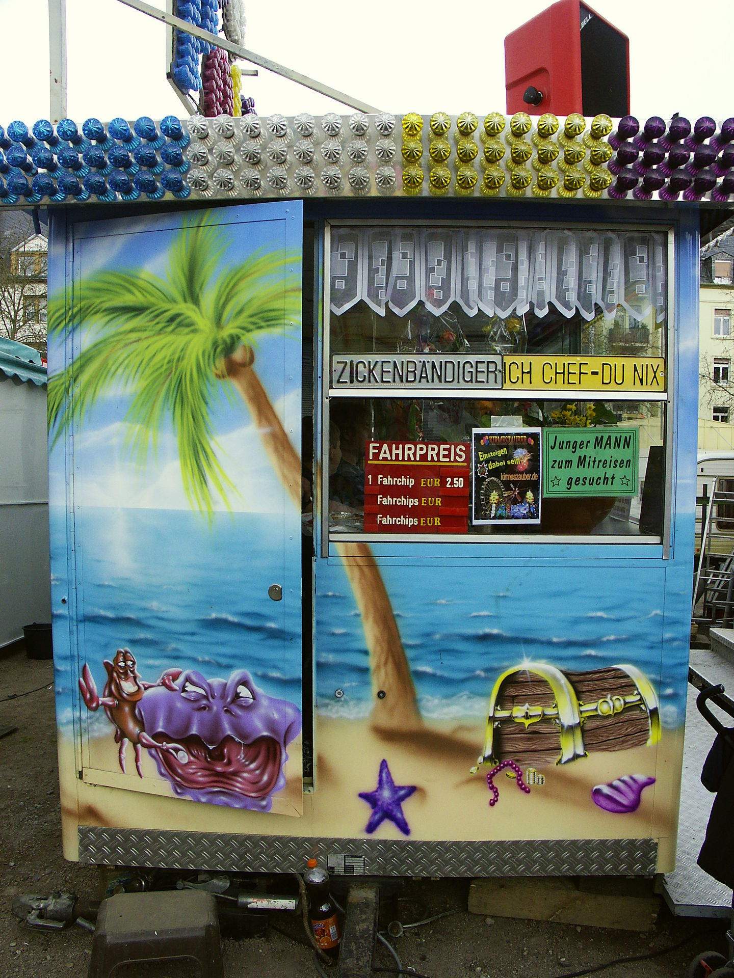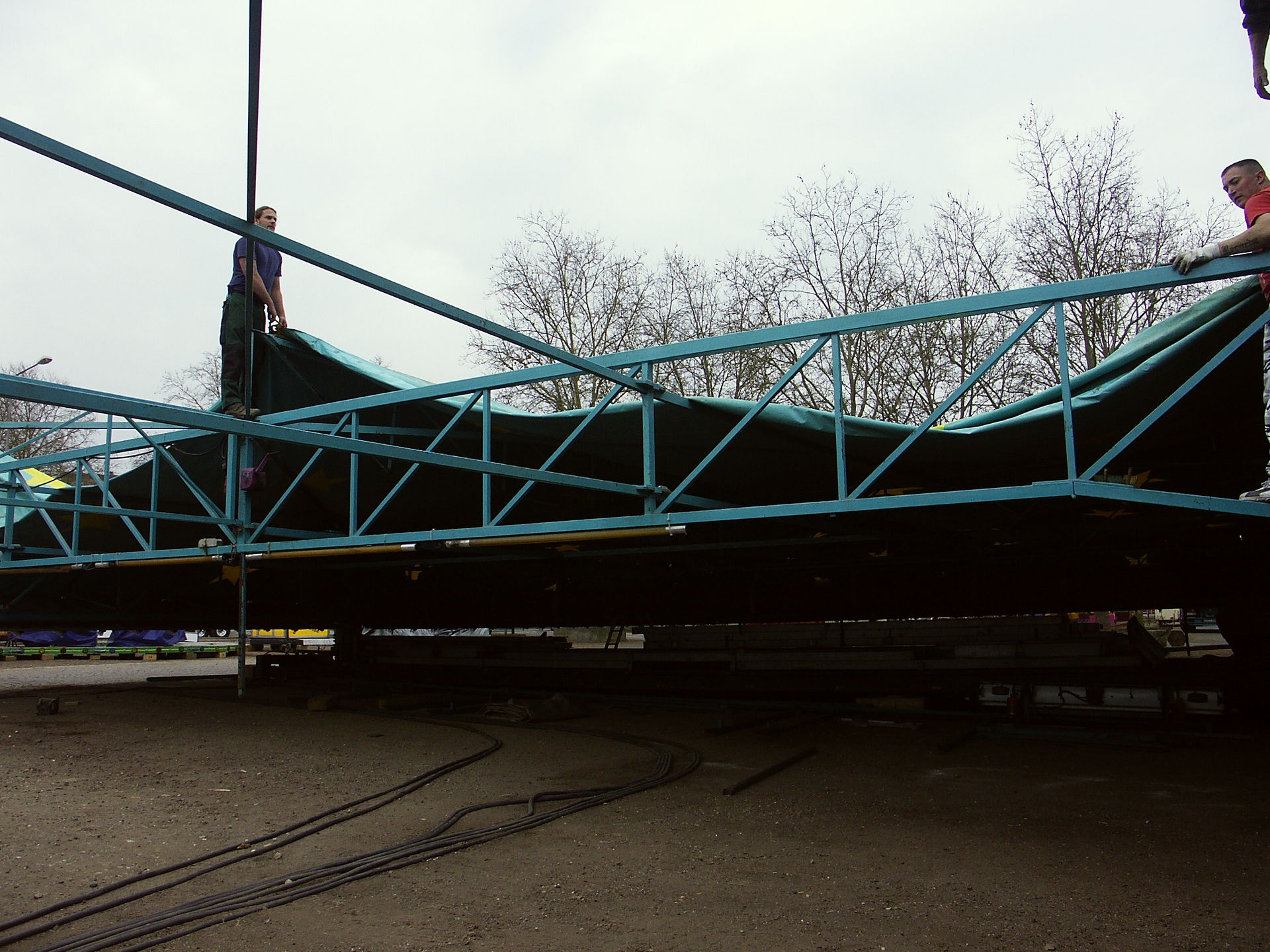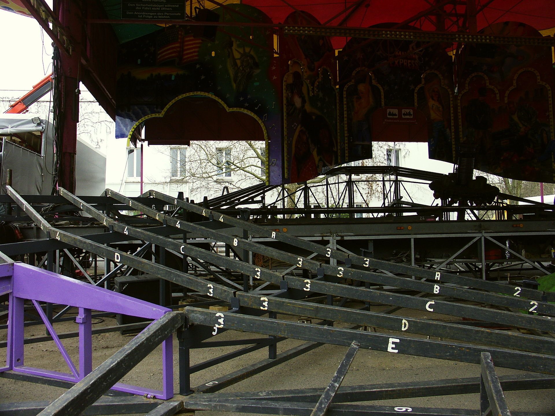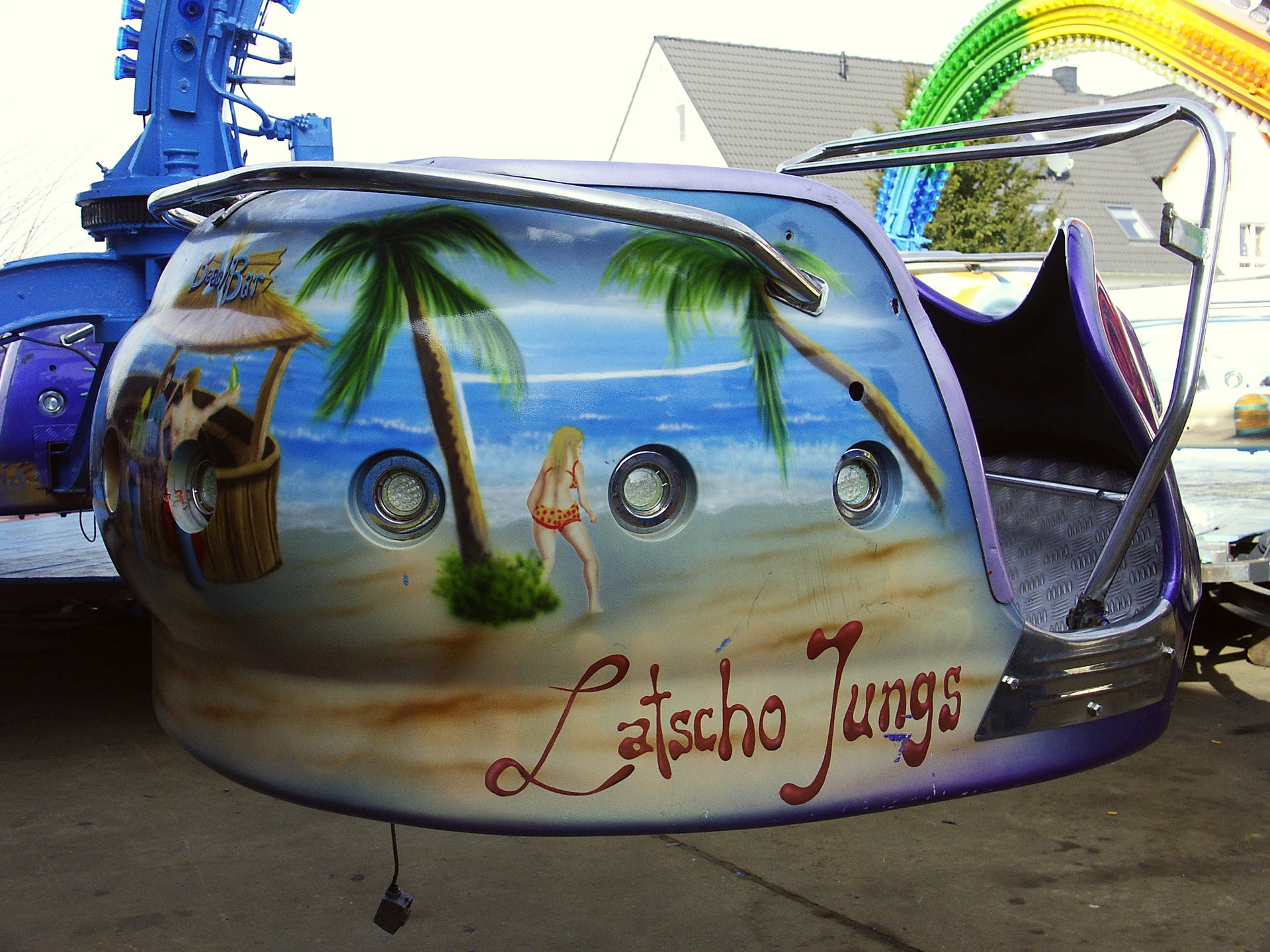 Die traditionelle Kugel mit dem Polypen, auf dem Mittelteil, sind durch den Transportunfall so stark beschädigt, daß sie nicht mehr verwendet werden können. Eine kurzfristige Erneuerung war nicht möglich, da die Familie Nickel ihren Schwerpunkt auf die Überarbeitung der Technik gelegt hat. Insbesonders wurden alle Motoren und Lager erneuert. Auch ein neuer Packwagen mußte gebaut werden, da Levy den eigentlichen Packwagen für seinen Flipper im Einsatz hat.