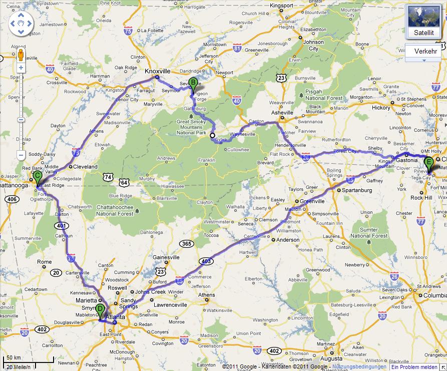 Es ginge konkret darum, ob wir direkt von Charlotte, SC (Carowinds) nach Atlanta, GA (Six Flags Over Georgia) durchfahren, oder dazwischen noch einen Abstecher in die Berge nach Pigeon Forge, TN (Dollywood) anhängen. Unten rum sinds etwa 270 Meilen, obenrum 470. Ursprünglich hatten wir das so geplant, da dieser Umweg insgesamt betrachtet nicht wahnsinnig lange ist und mit zwei unter Umständen sehr reizvollen Zwischenstopps aufwartet. Verlässt man die 40ste nach Asheville bereits etwas früher, fährt man direkt durch den Great Smoky Mountains National Park und an seinem Oconaluftee Visitor Center vorbei, was landschaftlich sicher einen wunderschönen Kontrastpunkt zum Rest der Reise darstellt. Und zwischen Dollywood und Atlanta kann man dann noch den Lake Winnepesaukah mit dem schönen alten Cannonball mitnehmen. Darüber hinaus hätte man mit Thunderhead in Dollywood den Mangel an wirklichen Weltklasse-Woodies auf dieser Tour etwas ausgeglichen.