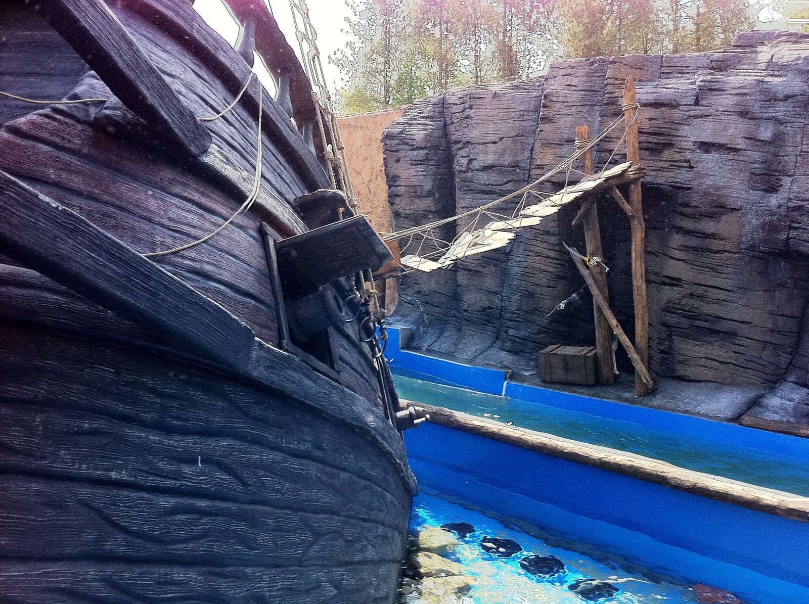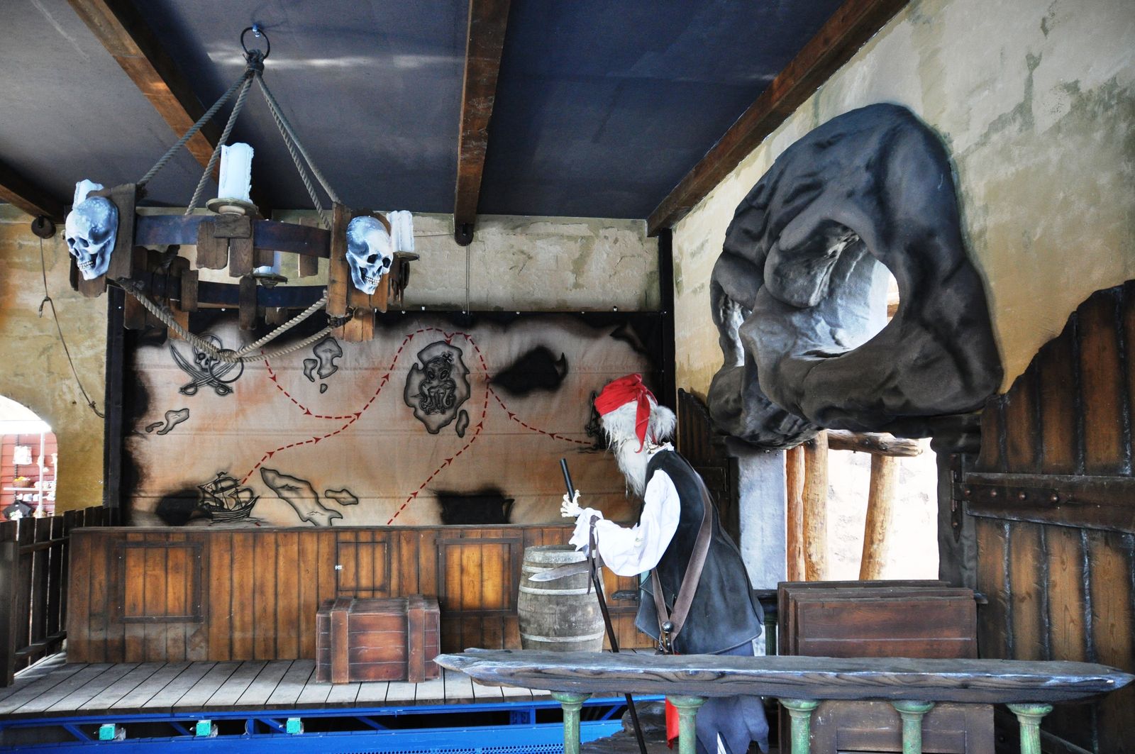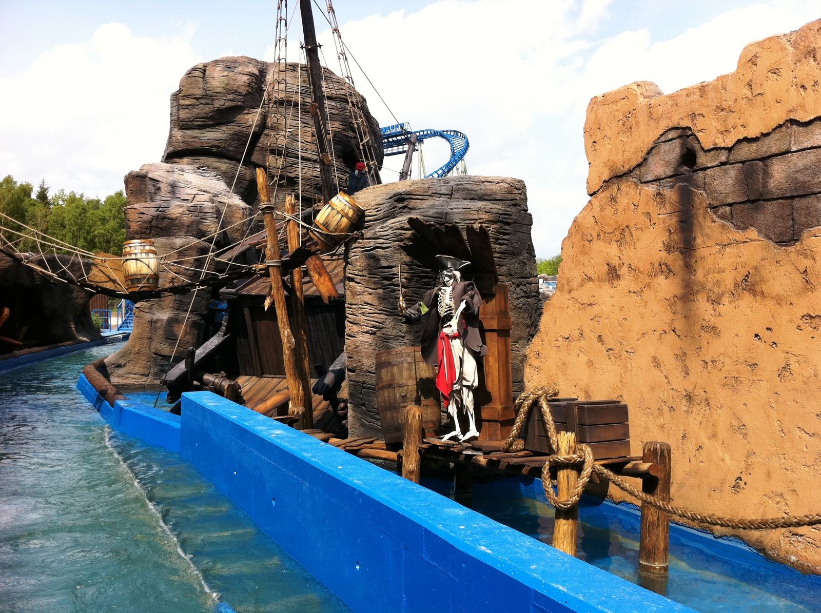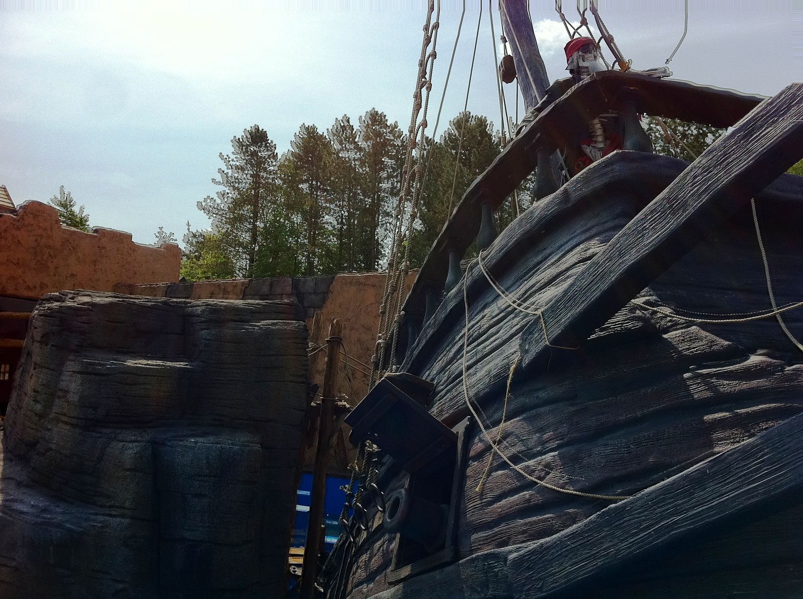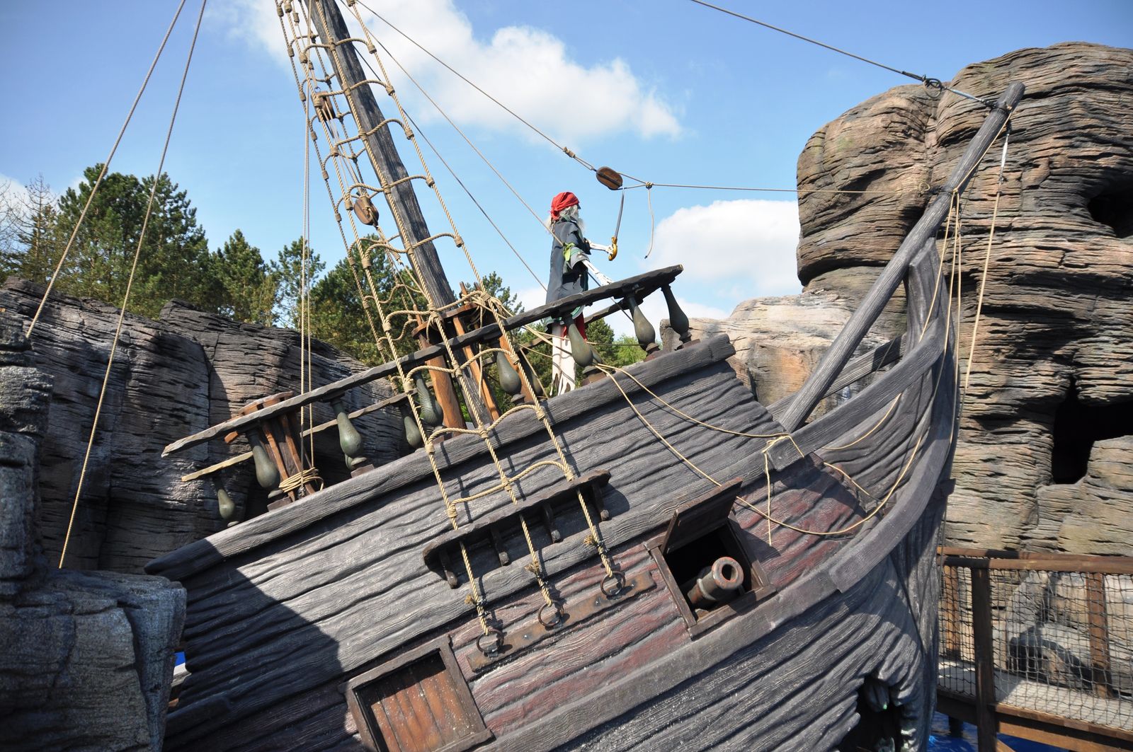 Der Wahnsinn ... Der gesamte Bereich sieht einfach nur genial aus. Highlight ist die Felsenlandschaft, in der auch einige gestrandete Schiffe zu finden sind, durch die auch die Queue geführt wird. Zwischen den Felsen kommt man vorbei an diversen gestrandeten Schiffswracks. Und auch die Station ist im Inneren mit vielen kleineren Objekten unheimlich authentisch gestaltet. Sehr genial ist auch, dass die Wartenden in der Queue einen Blick auf die Anlage und auf den Splash haben. Während der Fahrt durch die Felsen begegnet man einigen toten Piraten, und auch eine Krake läuft einem über den Weg.
