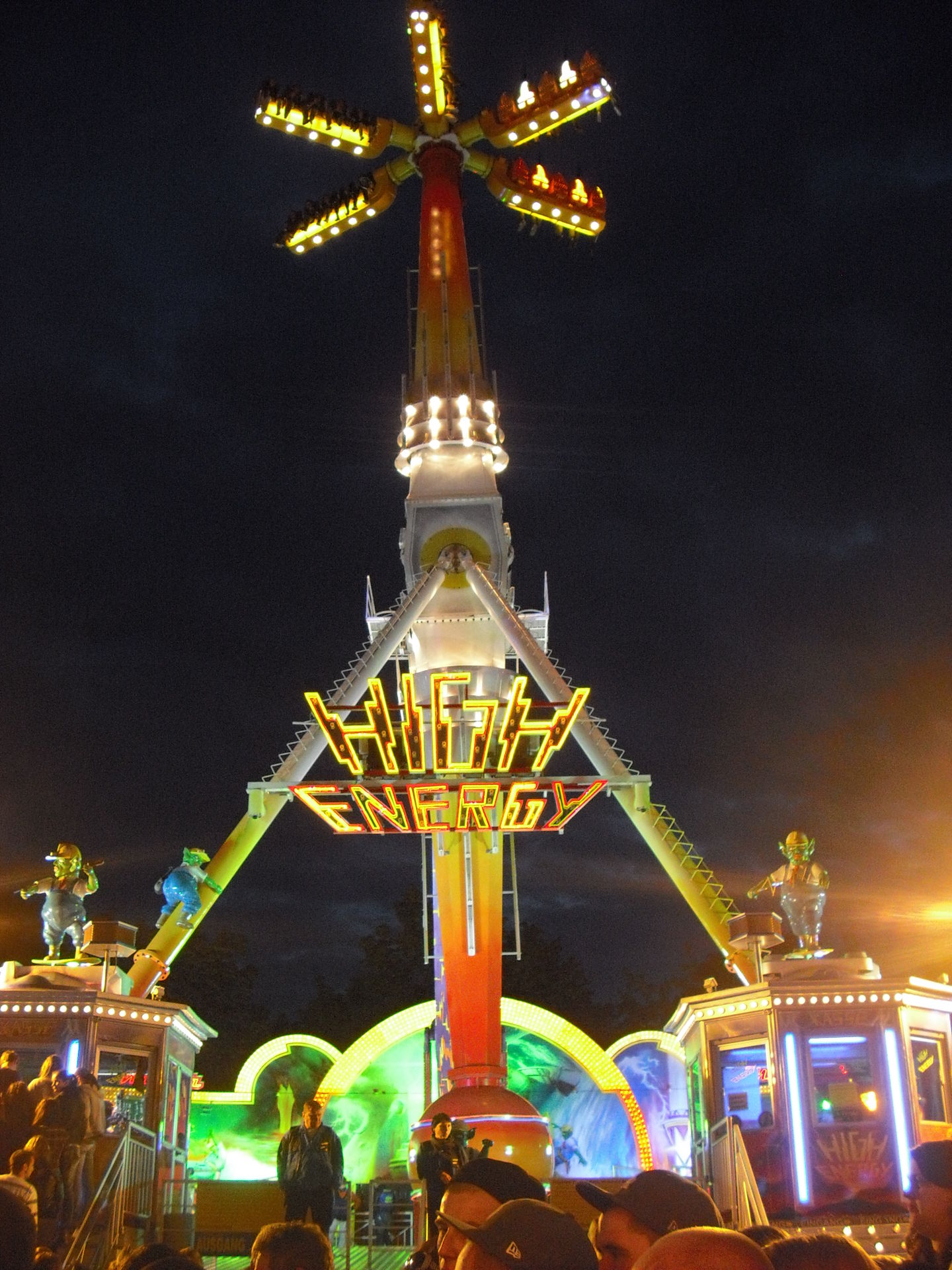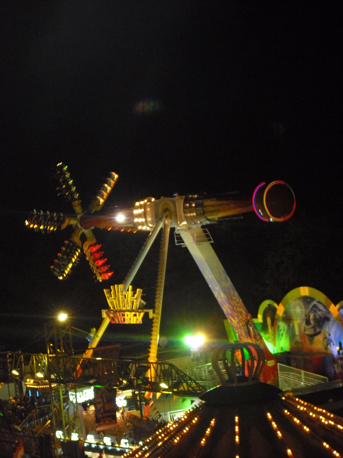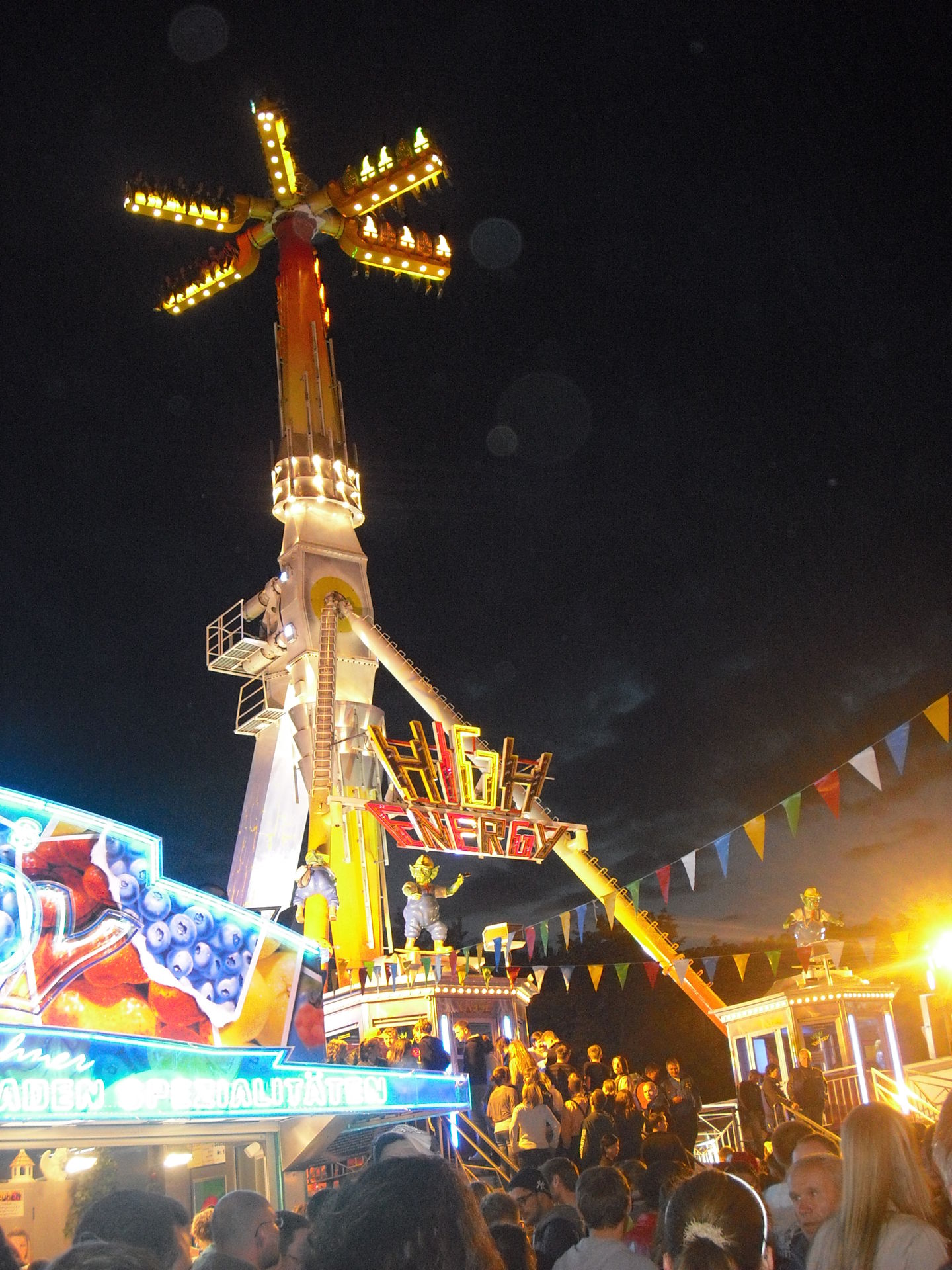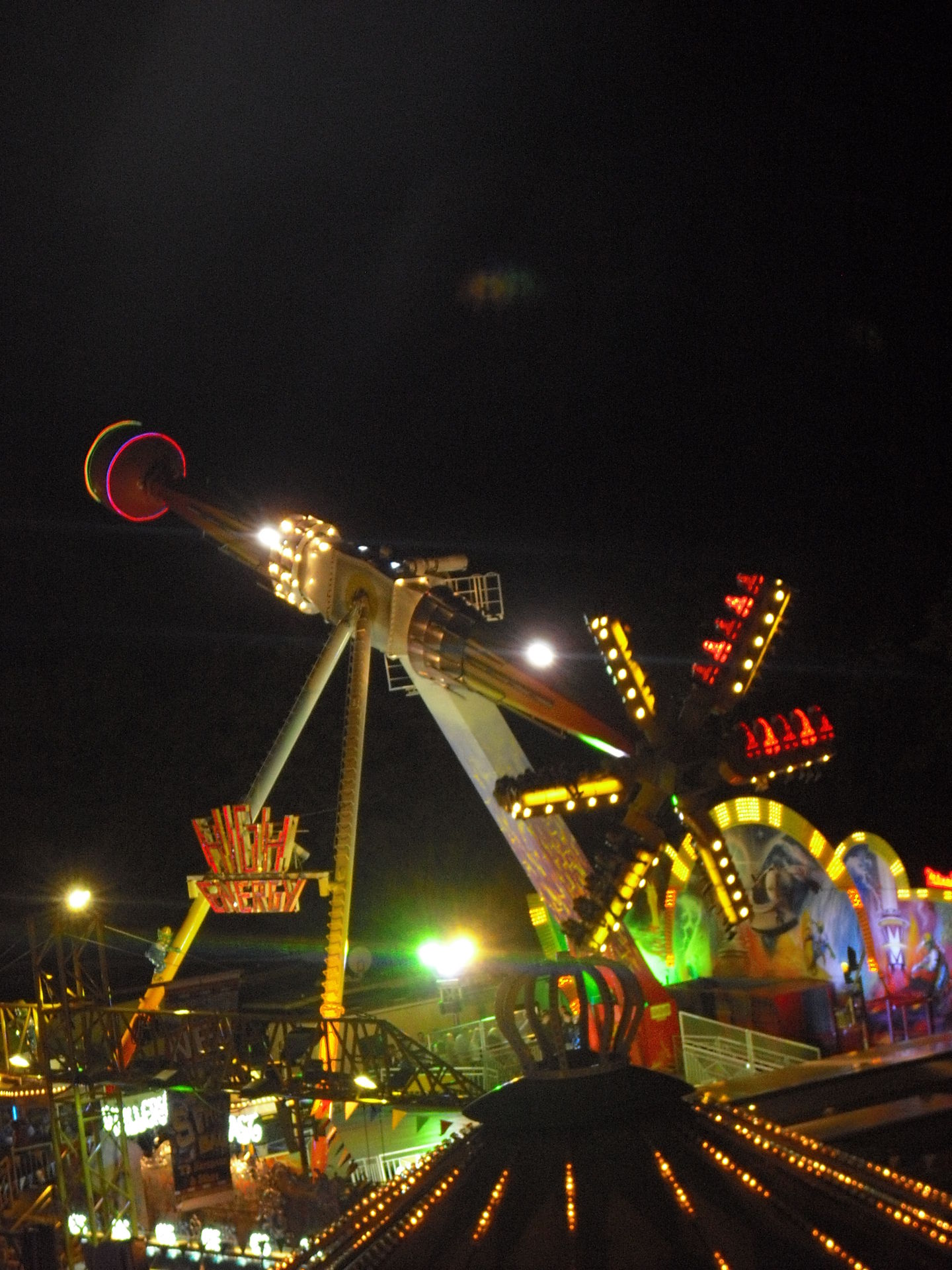 Zum 2.Mal in Schweinfurt; das 30 Meter hohe Überkopffahrgeschäft "High-Energy" von Kaiser.