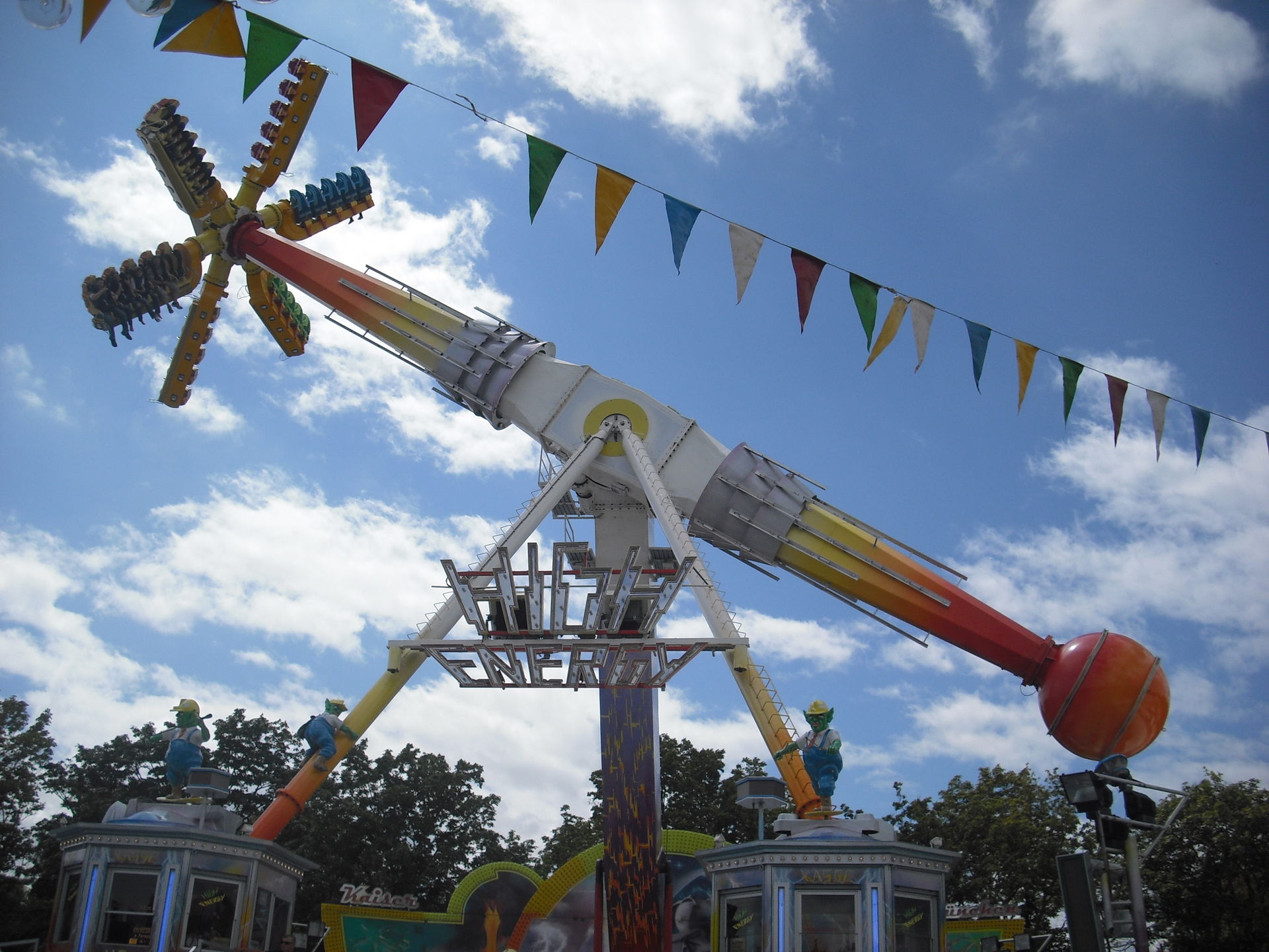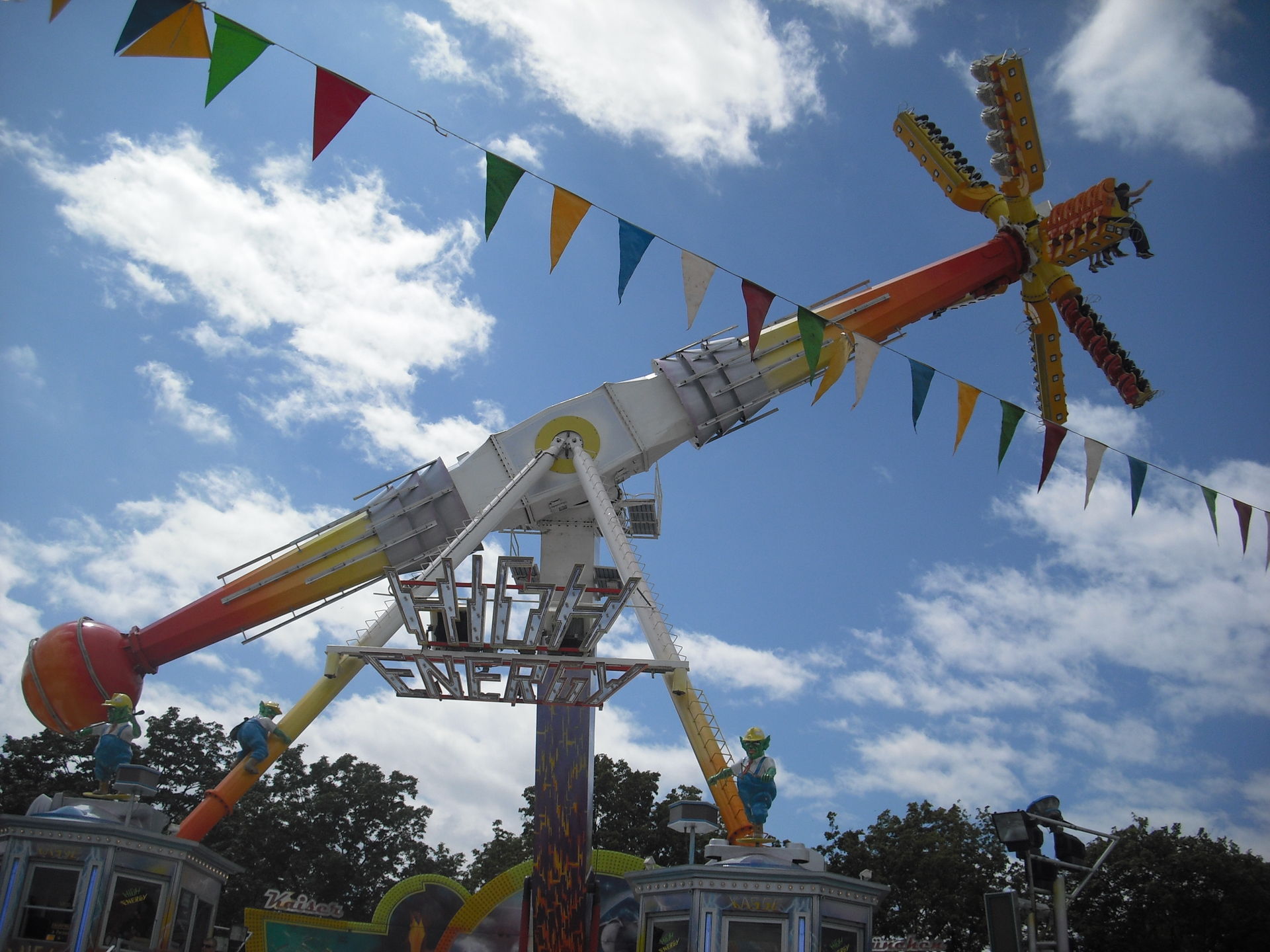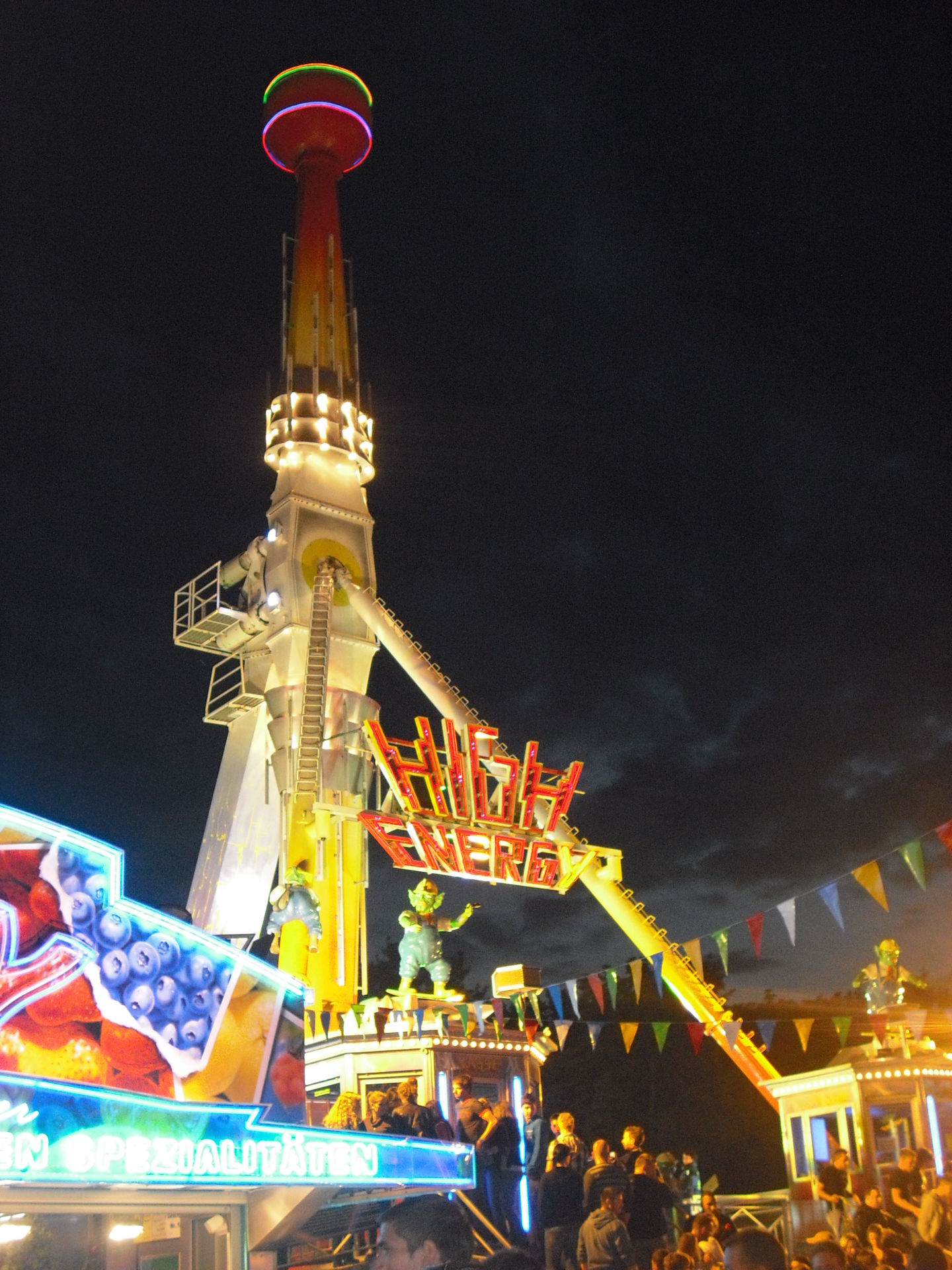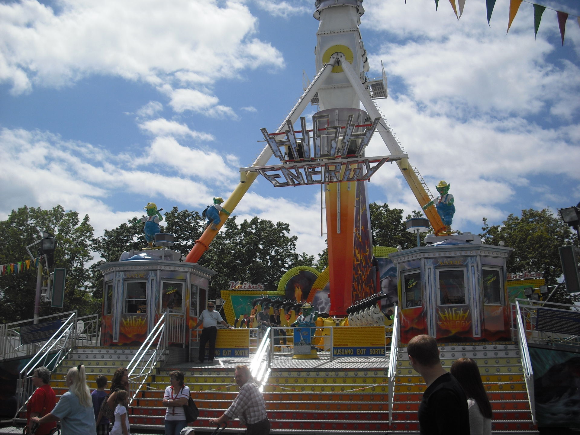 Zum 2.Mal in Schweinfurt; das 30 Meter hohe Überkopffahrgeschäft "High-Energy" von Kaiser.