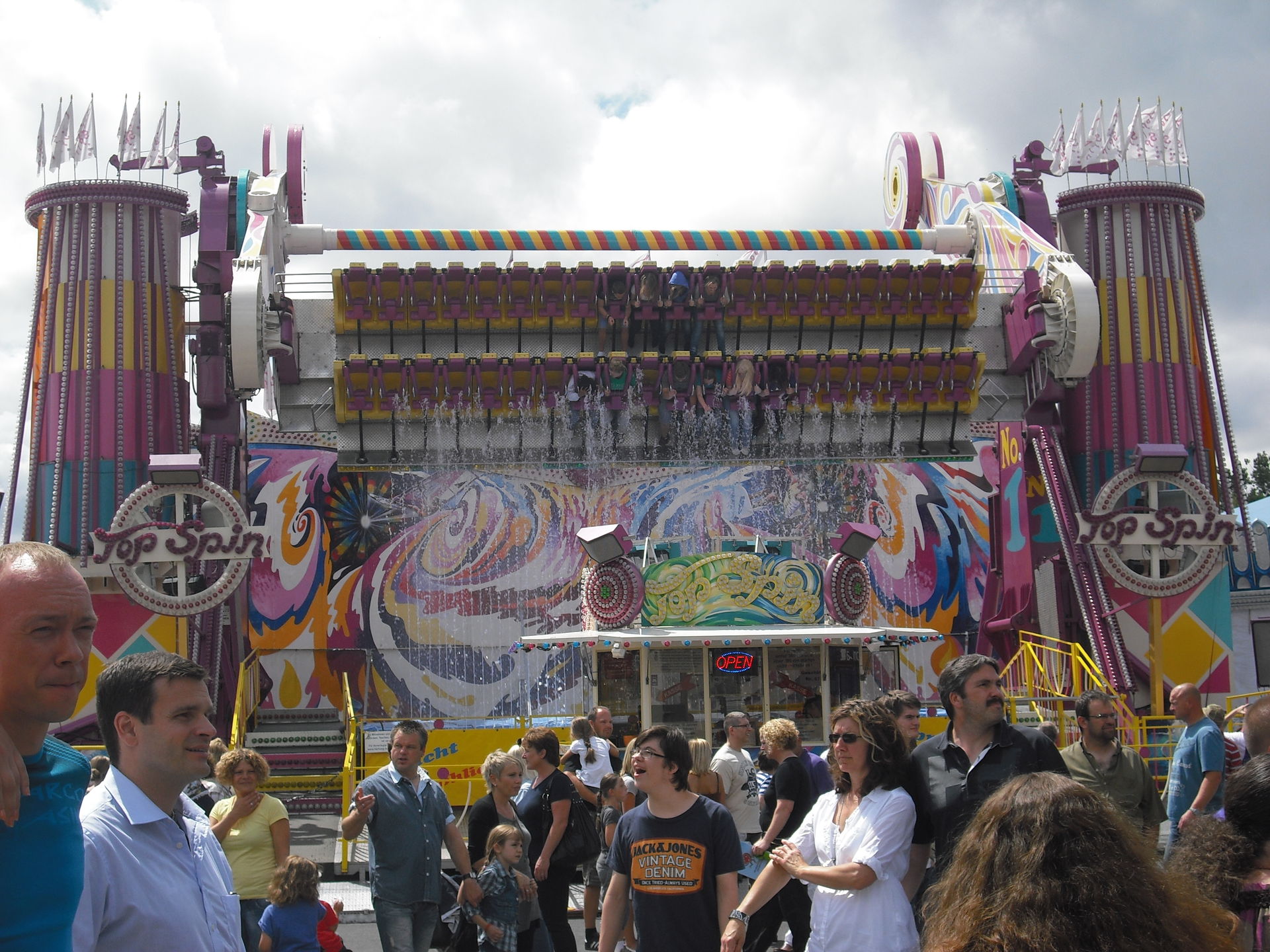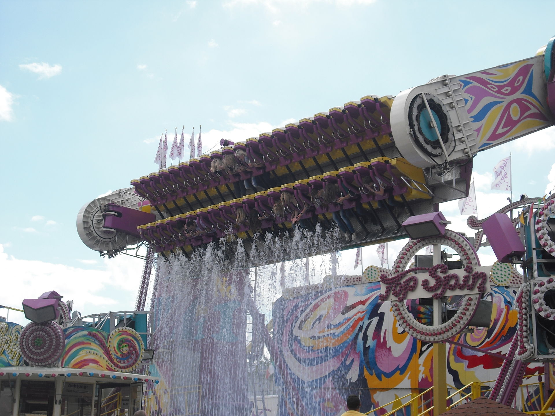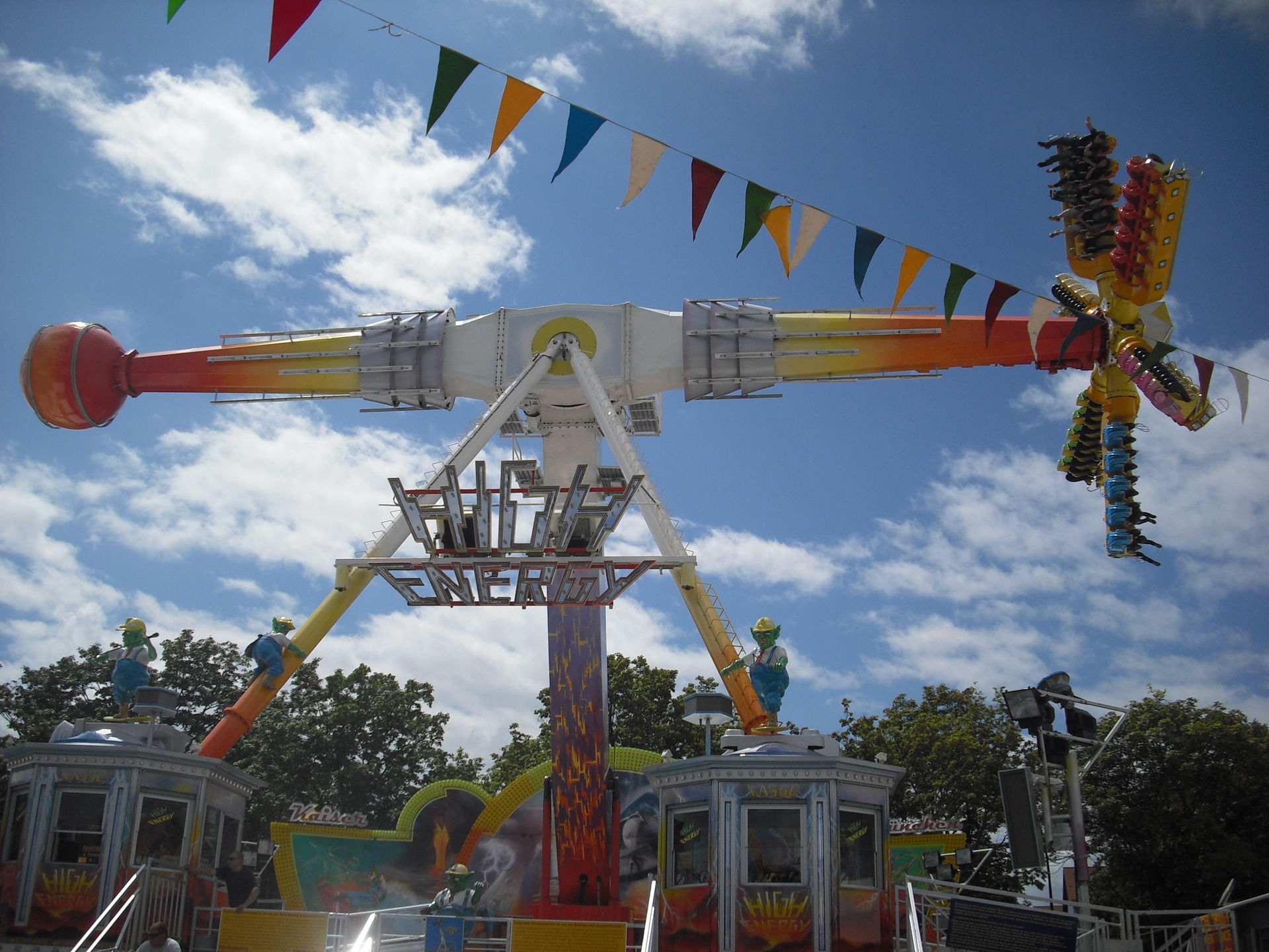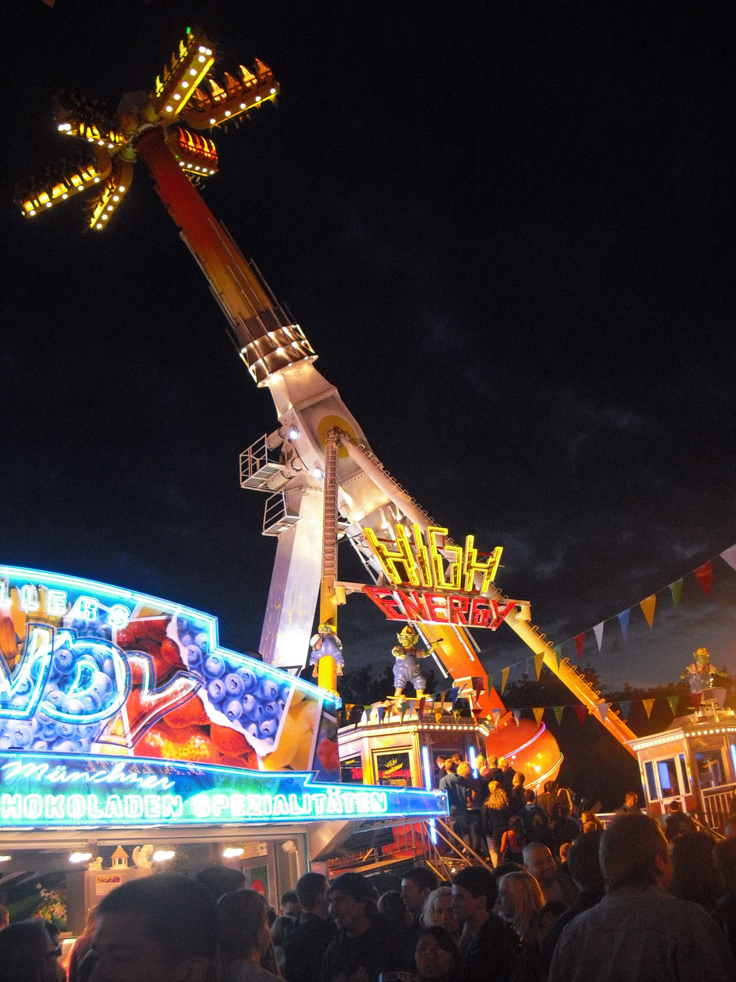 Zum 2.Mal in Schweinfurt; das 30 Meter hohe Überkopffahrgeschäft "High-Energy" von Kaiser.