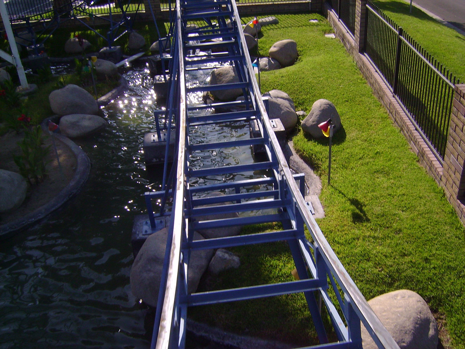 Glücklicherweise ist die Achterbahn der Begierde groß und der Park klein, so dass wir gleich wissen, wohin wir gehen müssen. Vorbei an einer Softballanlage zur linken und verschiedenen Fahrgeschäften zur rechten zieht es uns Richtung Miler-Stahl (diesmal die Sohn-Variante, also E&F Miler Industries).