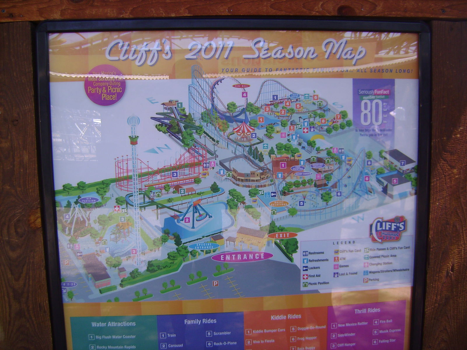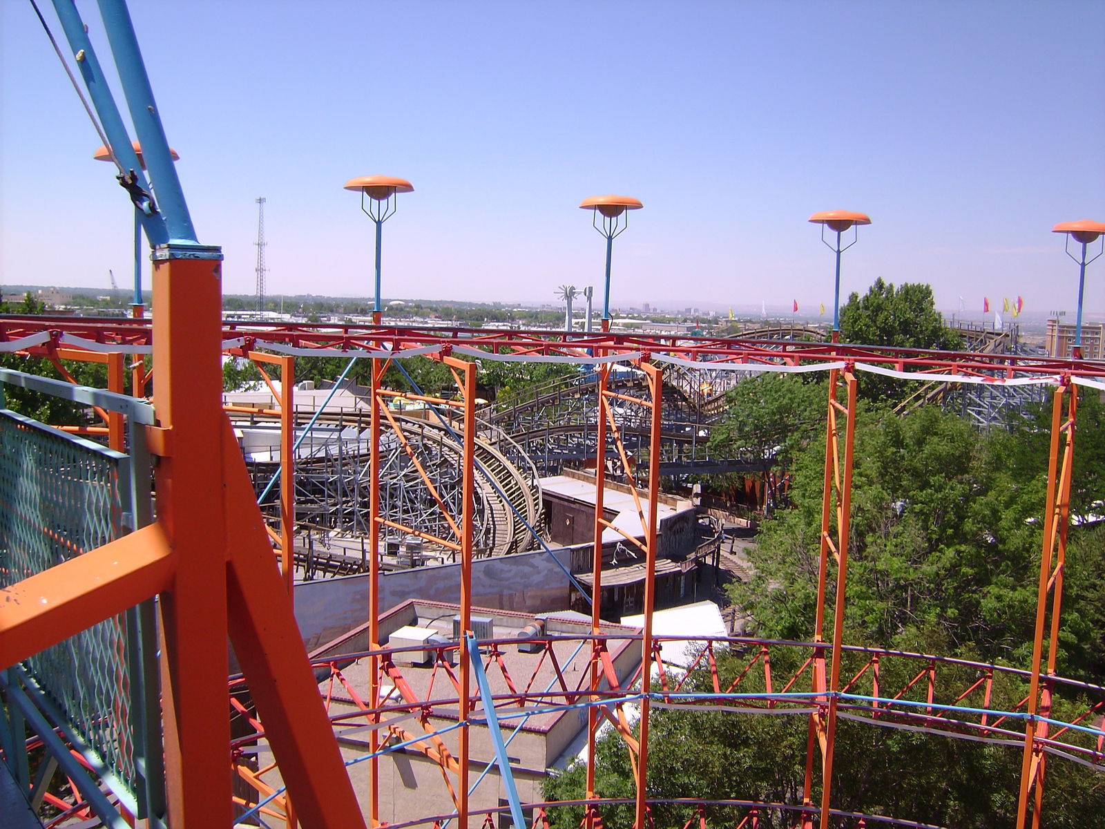 Diese Bahn besticht durch ihr sehr sanftes Fahrverhalten. Kein Ruckeln, keine Schläge, fast ein sanftes Dahingleiten. Sehr angenehm bei diesen hohen Temperaturen, so dass wir auch hier gleich mehrere Fahrten hintereinander absolvieren. Jetzt brauchen wir aufgrund der Hitze aber eine Abkühlung und besuchen die leider nicht so nasse Wildwasserbahn. Etwas untererfrischt machen wir einen Rundgang, um die zuvor ausgeblendeten Fahrgeschäfte anzusehen. Am liebsten würden wir das mit dem Sessellift machen, den man auf einigen New Mexico Rattler Fotos bei rcdb.com sehen kann, aber leider ist dieser vollständig aus dem Park verschwunden.