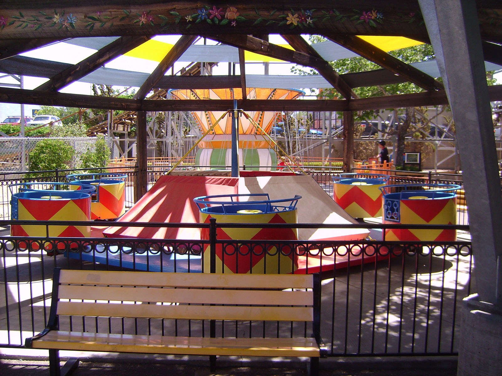 Will man bei dieser "Teetassenfahrt" mit seiner Gondel ins Rotieren kommen, so muss man schon selbst aktiv werden. Im Gegensatz zu den bei uns bekannten Heißgetränkefahrten befinden sich die Gondeln direkt auf der Hauptplatte und werden deshalb bei ungleichmäßiger Beladung allenfalls ausgerichtet, aber nicht zum Rotieren gebracht.