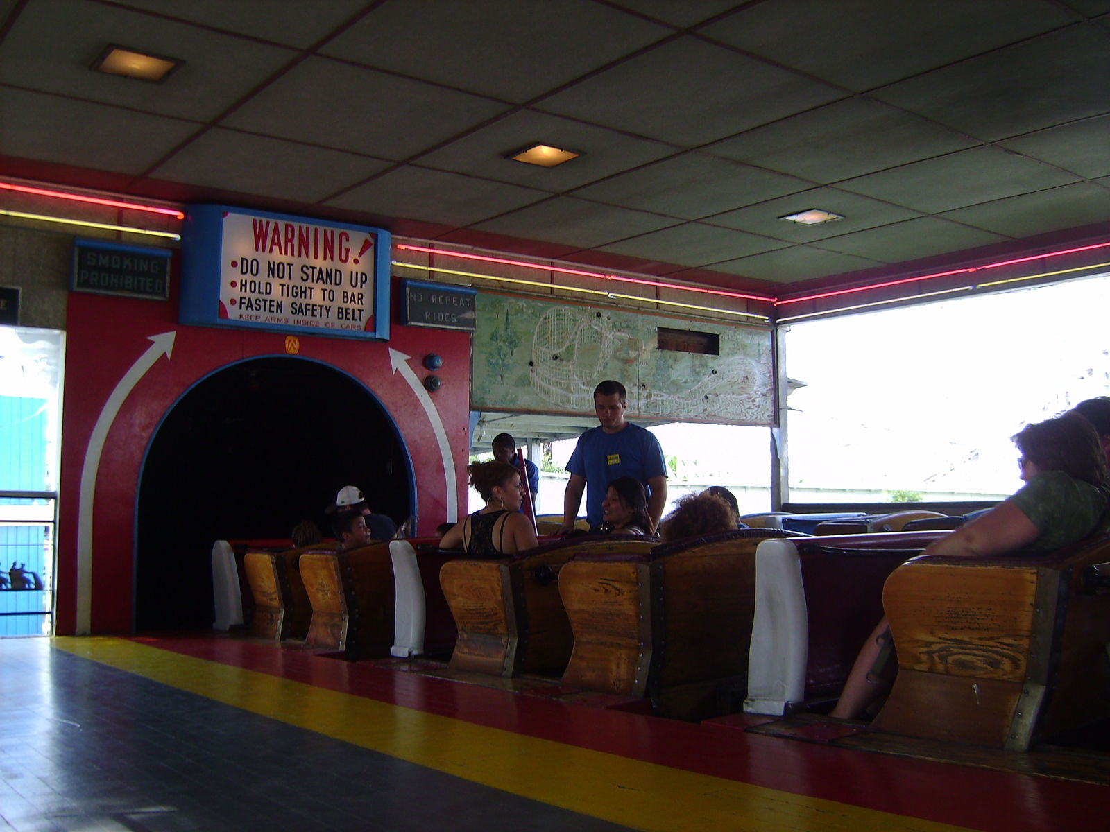 Hallo? Ich denke, ich bin hier auf einer uralten Holzachterbahn, stattdessen ist das hier ein D-Zug! Jetzt verstehe ich, warum man besser die Kamera in ihrer Tasche lassen sollte. Und ich verstehe auch, warum ich rechts sitzen muss: Bei einer der gut gebankten und schnell durchfahrenen Linkskurven ragt unmittelbar links neben dem Track die Struktur nach oben auf.
