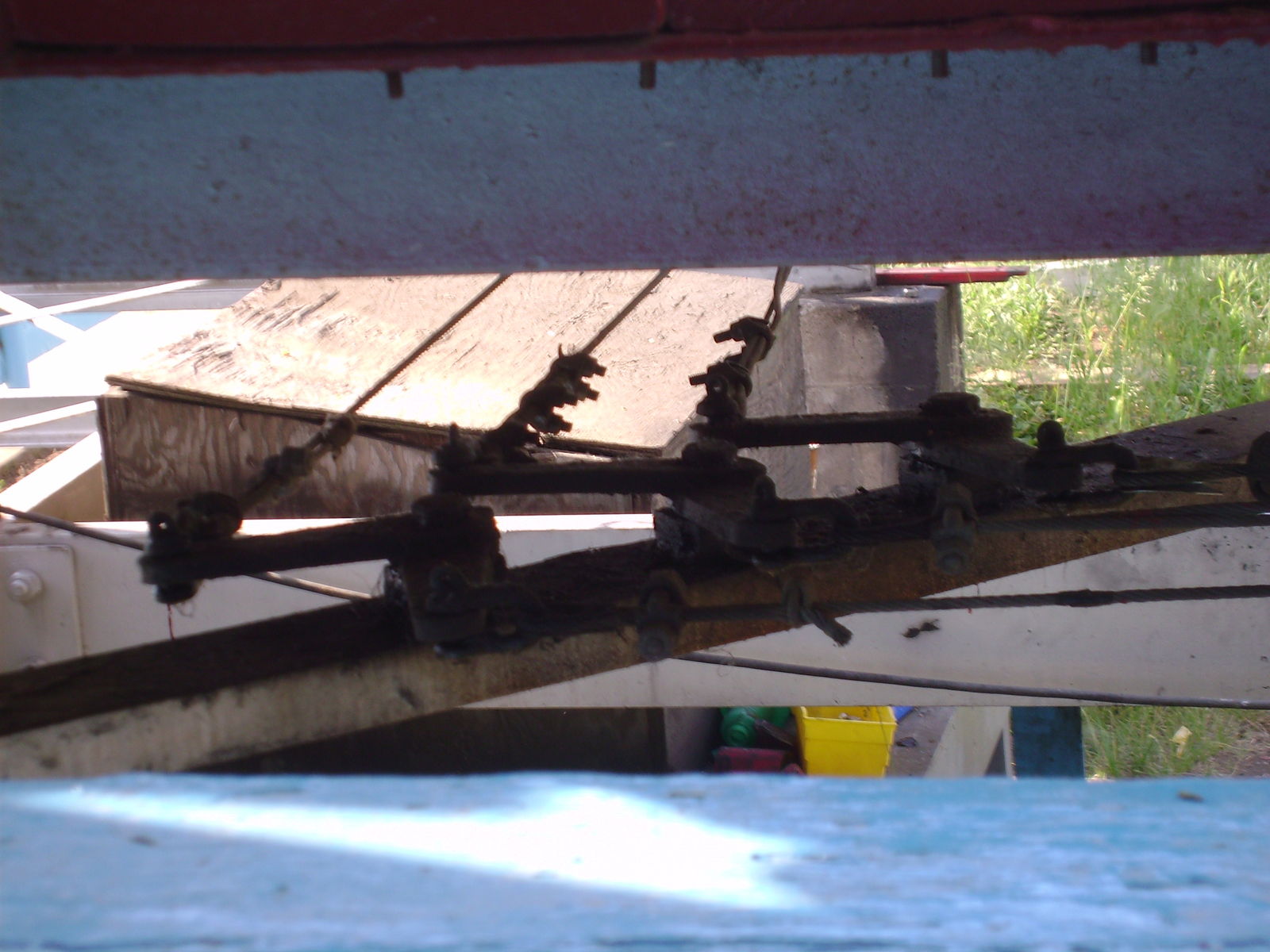 Ganz einfach: Mittels unter der Plattform befindlichen Seilzügen und Umlenkhebeln. Nix Elektro!