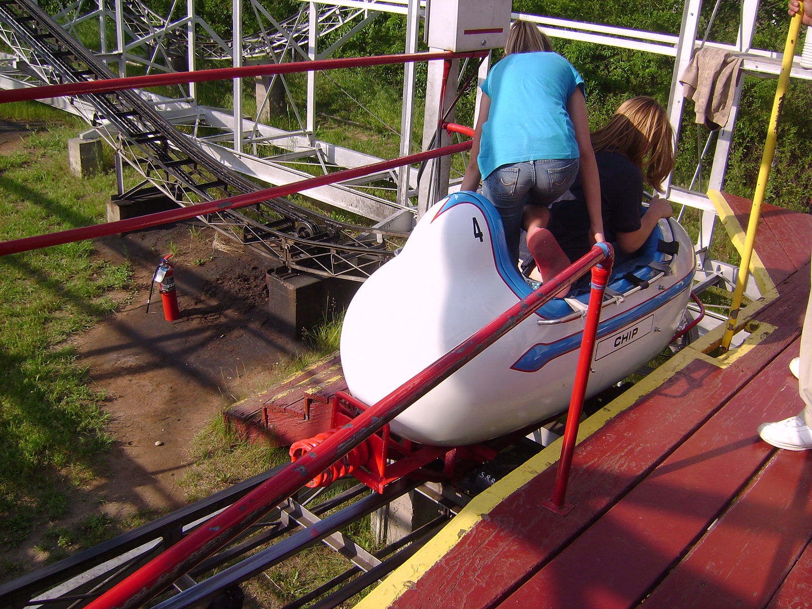 Unsere Erfahrung mit der Wilden Maus Miler'scher Bauart in Adventure City hat uns irgendwie nicht weitergebracht. Wieder stehen wir vor einer solchen Bahn und sind uns nicht sicher, ob wir wissen, was wir uns antun. Dieses Exemplar sieht zudem noch deutlich puristischer aus. Die weiß gehaltenen Wagen weisen nur die jeweiligen Namen auf. "Chip" und "Simon" haben heute Dienst.