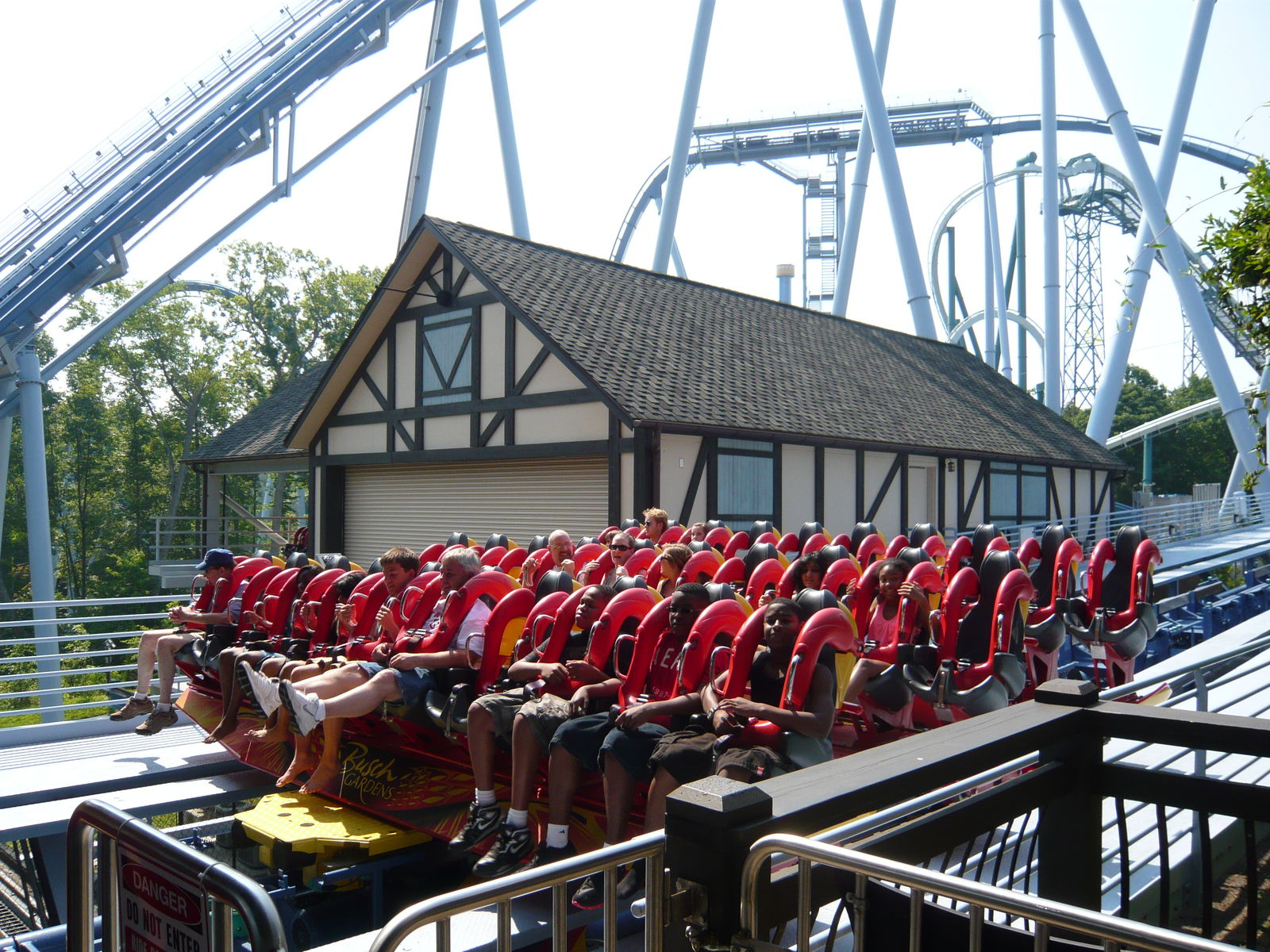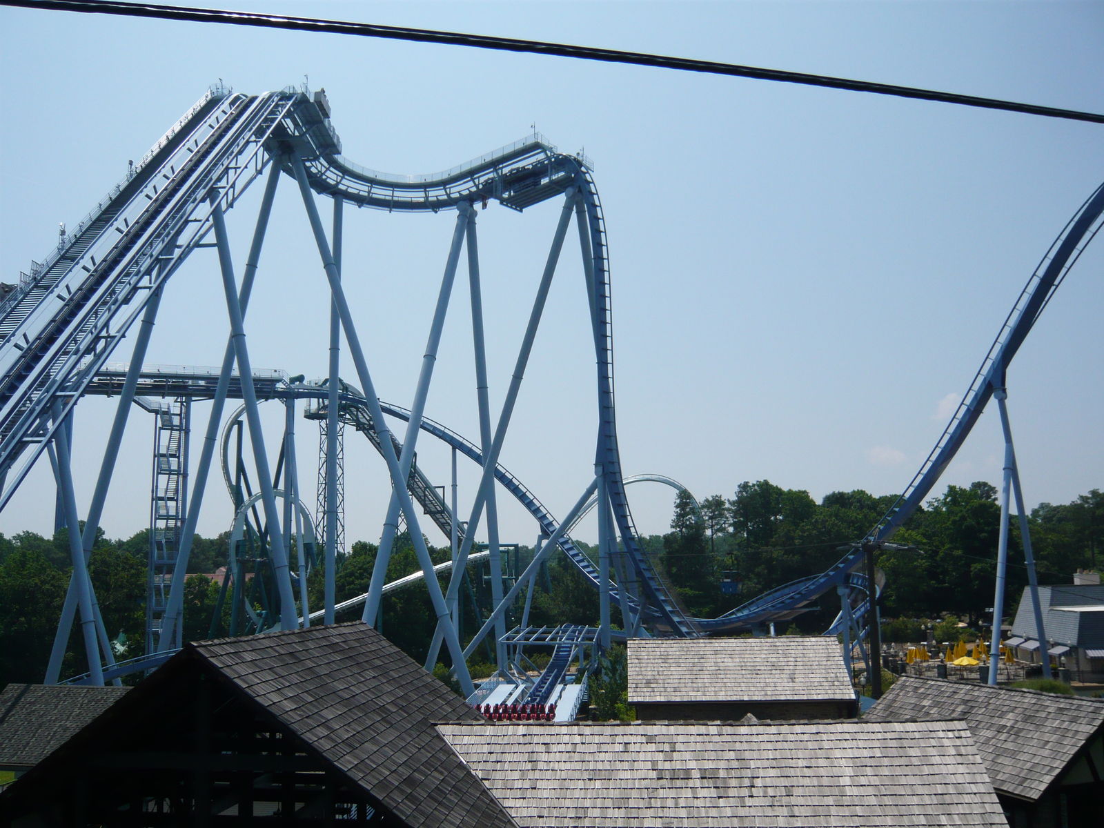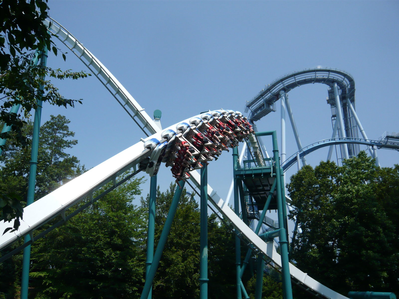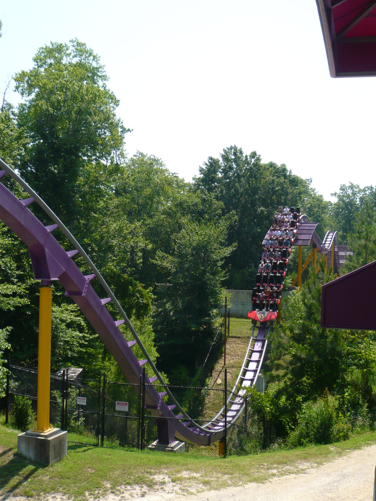 First Drop hinein seitlich gehangen sind, weil eine starke Bremse nach dem Pre-Drop den Zug zurückhielt. Die ganze Fahrt danach fühlte sich an, als ob man auf einem sehr stark eingestellten Massagesessel sitzen würde. Irgendwie hat einfach alles unangenehm vibriert - die Sitze, die Schulterbügel, der Körper. Kein Schütteln des Körpers, kein Headbanging, aber ein Gefühl, als ob man kleine Kieselsteine auf die Schiene geklebt hat und jetzt mit Volldampf drüberflitzt. Ständig musste ich die Sonnenbrille wieder zurechtrücken und konnte die gigantischen Inversionen, die sonst wahrscheinlich phänomenalen Druckmomente und die tolle Aussicht kaum richtig geniessen. Auch die Kobrarolle hat irgendwie ausgeteilt, aber das war auf dieser Reise ja ein bekanntes Verhaltensmuster.