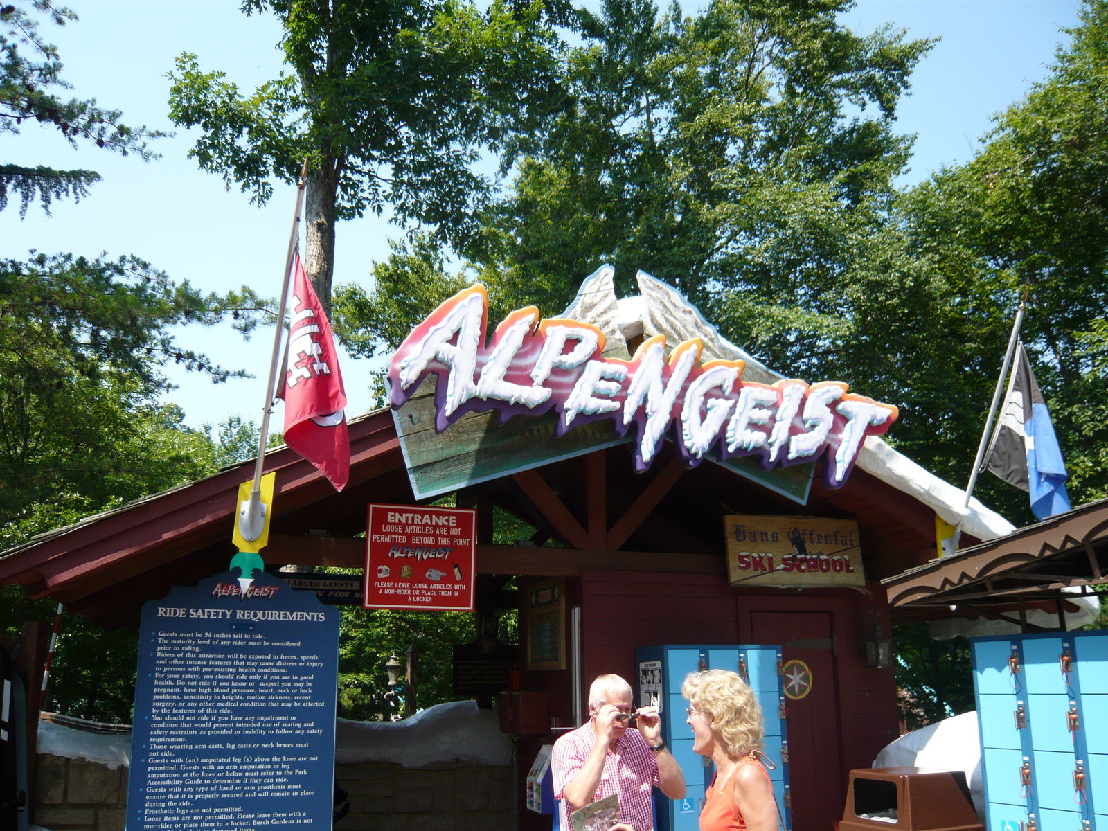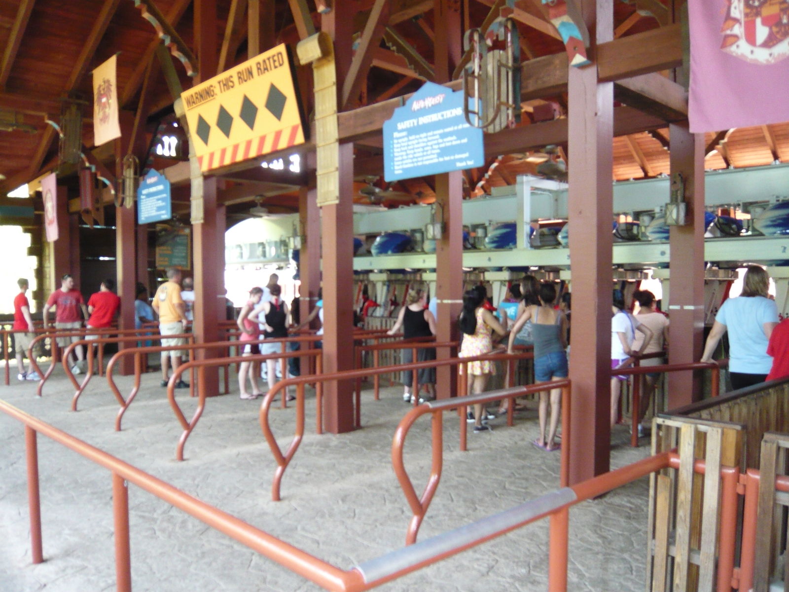 Da dies eine der ersten grösseren Achterbahnen in der Nähe des Eingangsbereich ist, gab es hier den ganzen Tag über Wartezeiten von etwa fünf bis zehn Minuten - so ziemlich alle Parkgäste steuerten diese gleich als erstes an. Durch Mehrzugbetrieb wurde der Ansturm aber hervorragend bewältigt, die Schlange war stets in Bewegung. Spot the ambiguity!