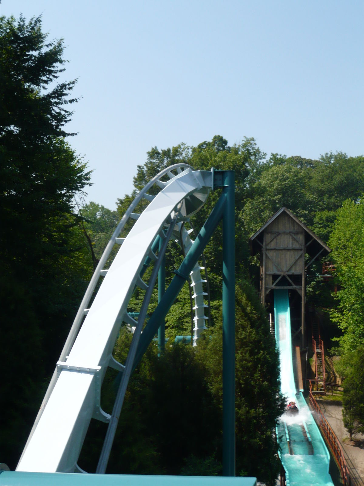 An einem so heissen Tag waren wir froh um die genau richtig abkühlenden Wasserattraktionen, auch hier mussten wir dank grossen Kapazitäten nie lange warten. Die Log Flume Le Scoot neben Alpengeist ist wunderbar lang, hat zwei schöne Drops und ein abnormal hohes erstes Förderband!