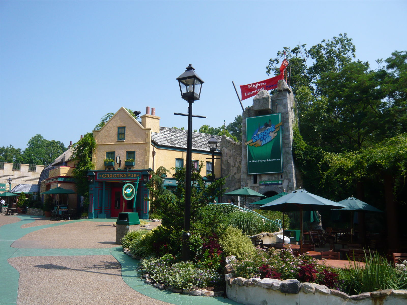 Danach unternahmen wir noch einige Wiederholungsfahrten mit allen Bahnen im Park, umrundeten ihn etappenweise mit der Gondel- und der Eisenbahn, und kamen schliesslich nochmals im irischen Themenbereich vorbei, wo wir uns noch den Simulator-Film Europe in the Air anschauten.