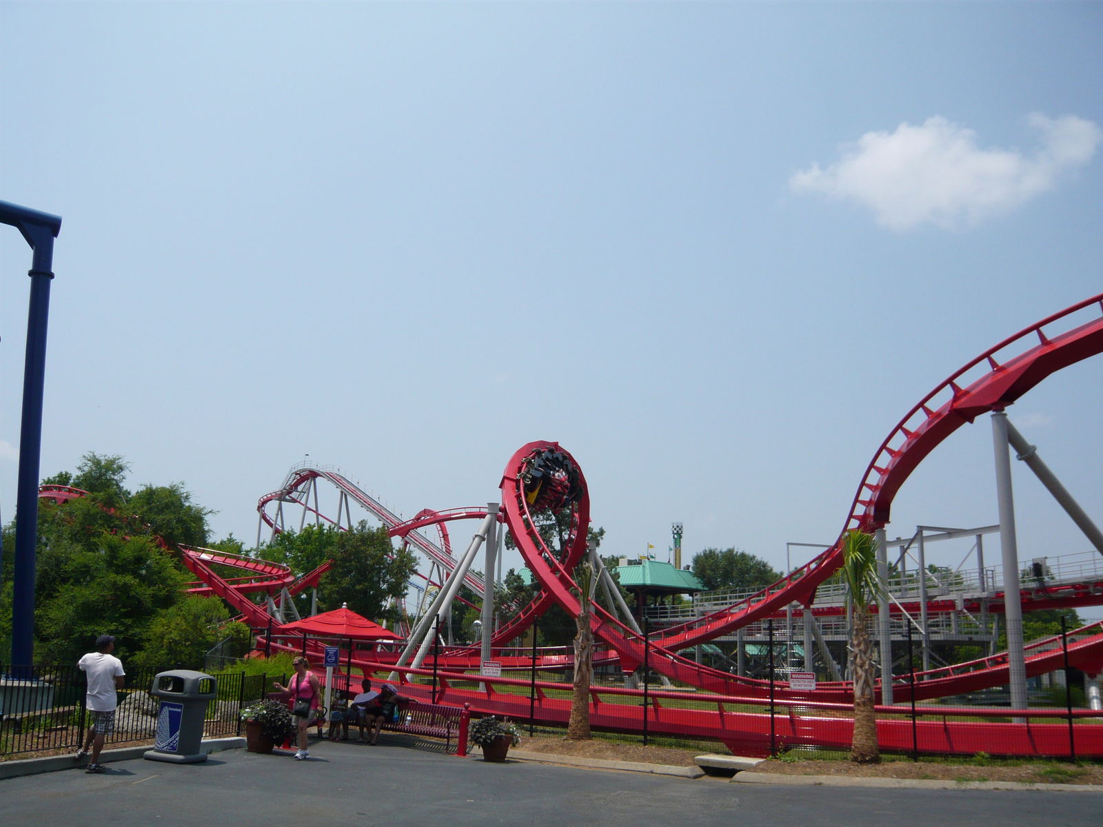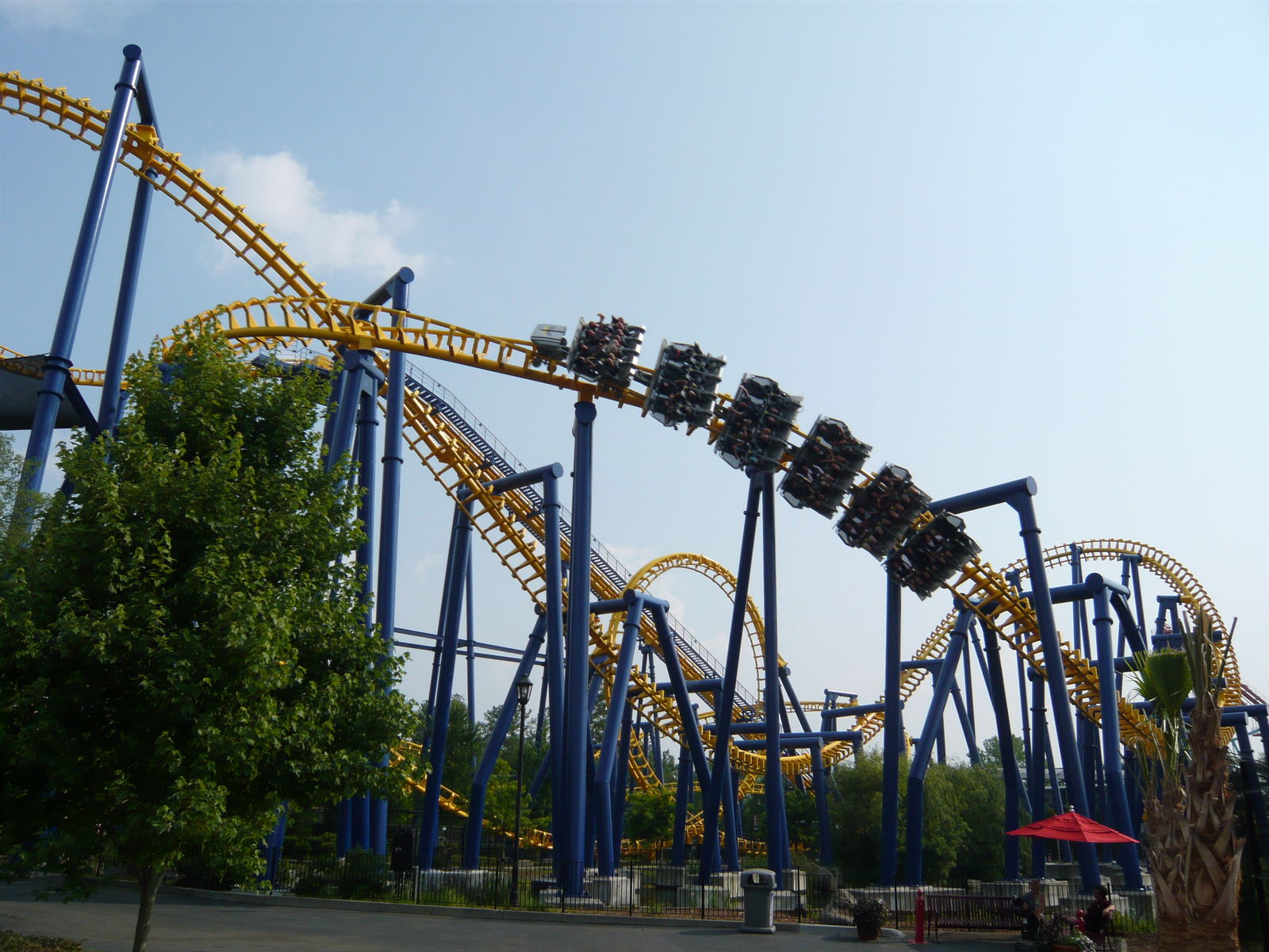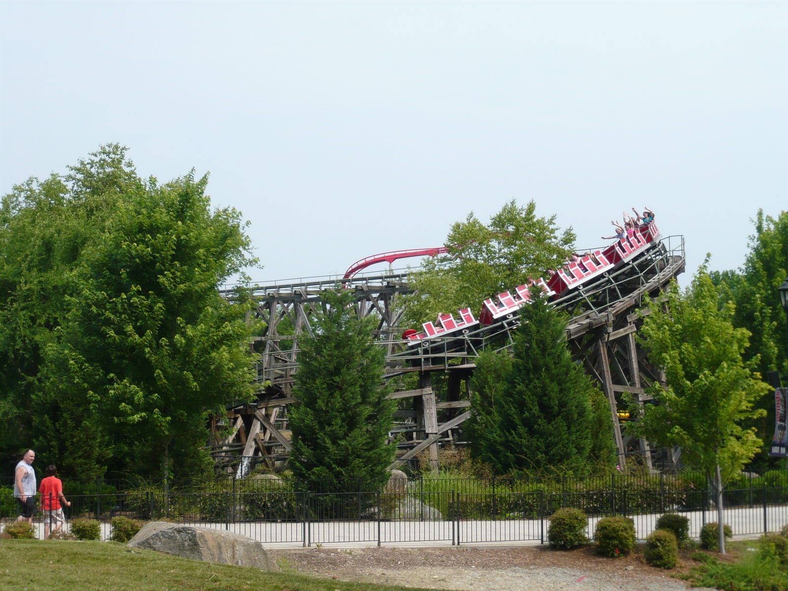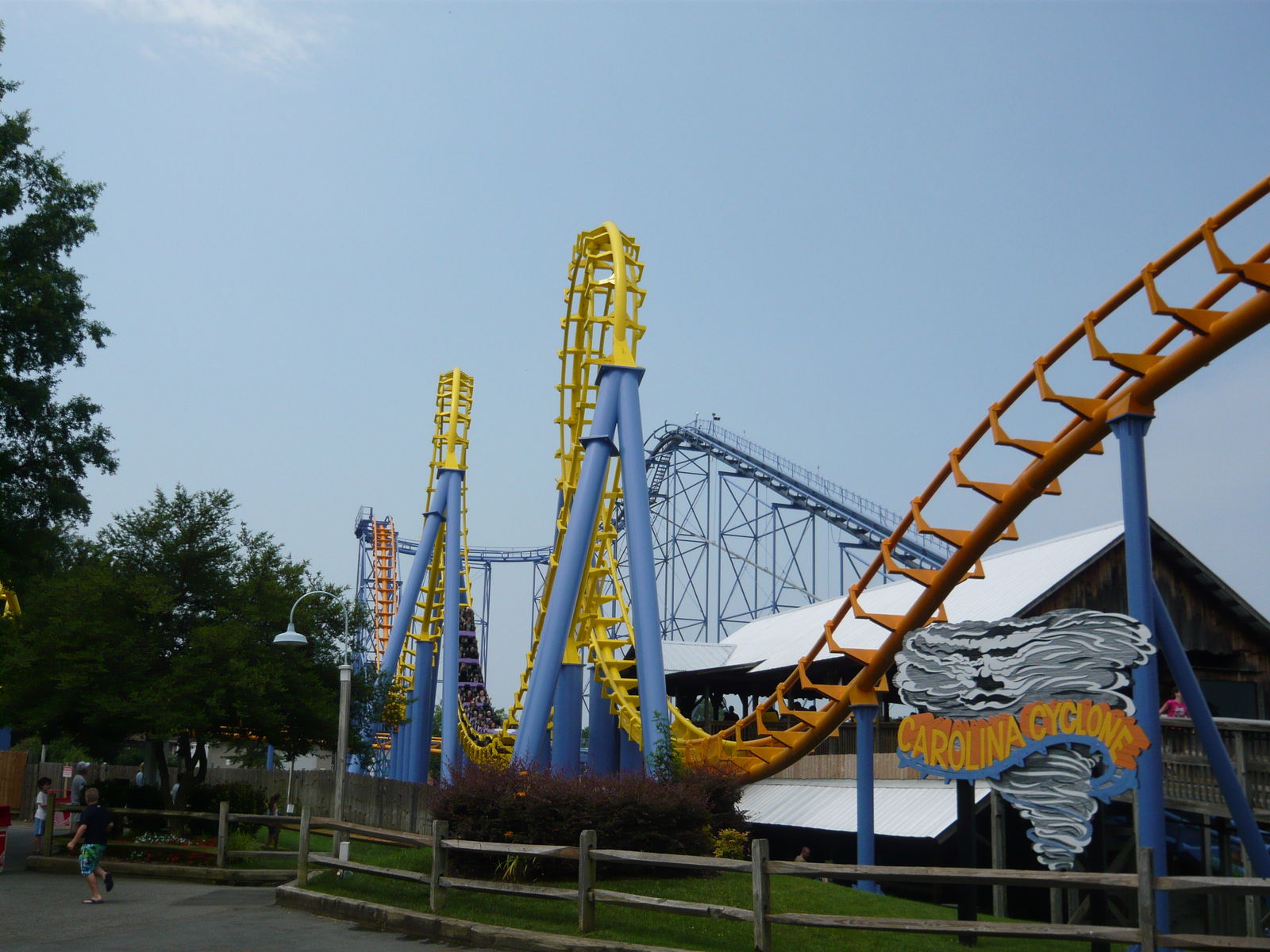 Nun konnte ich einmal in persona sehen, wie die Staatsgrenze zwischen North und South Carolina hier durch den Park verläuft - etwas, das ich auf Bildern von hier immer schon faszinierend fand! An diesem Freitagabend tummelten sich hier wesentlich mehr Menschen als in den auf dieser Reise zuvor besuchten Parks. Wenn wir uns das richtig aus dem Internet zusammenreimten, war in einigen Schulbezirken dieser Gegend genau an diesem Tag der letzte Schultag vor den langen Sommerferien. Allerdings war dies keineswegs schlimm, da zwar viele Leute auf den Wegen, aber irgendwie nie in den Warteschlangen waren. Hinzu kamen die Cedar Fair-typischen Mehrzugbetrieb-Abfertigungen, die wir so lieben und schätzen.