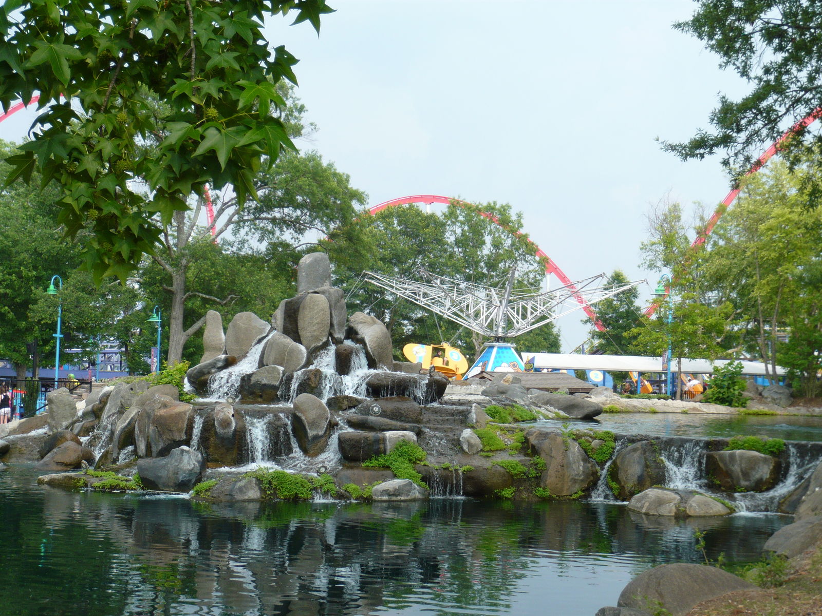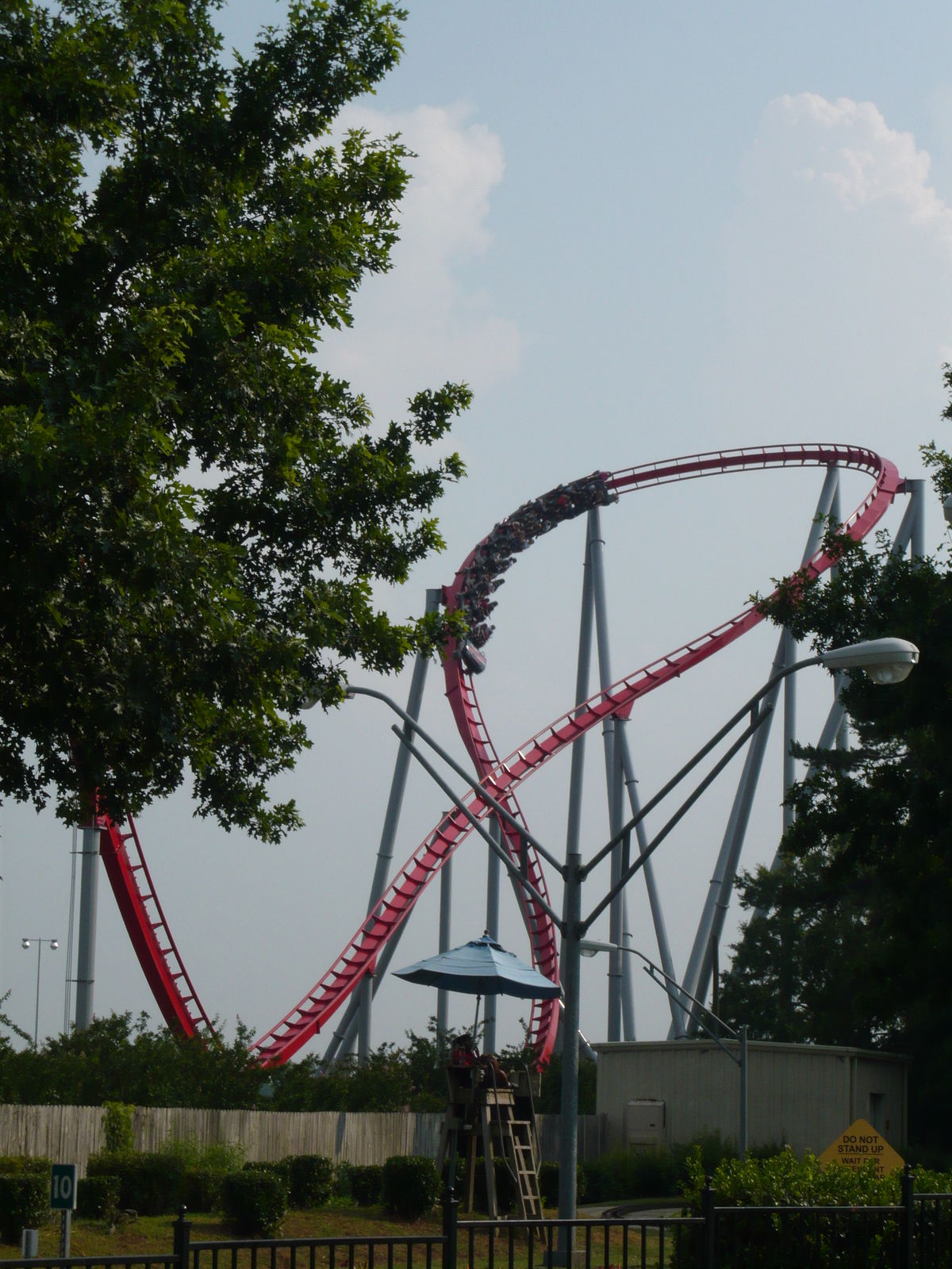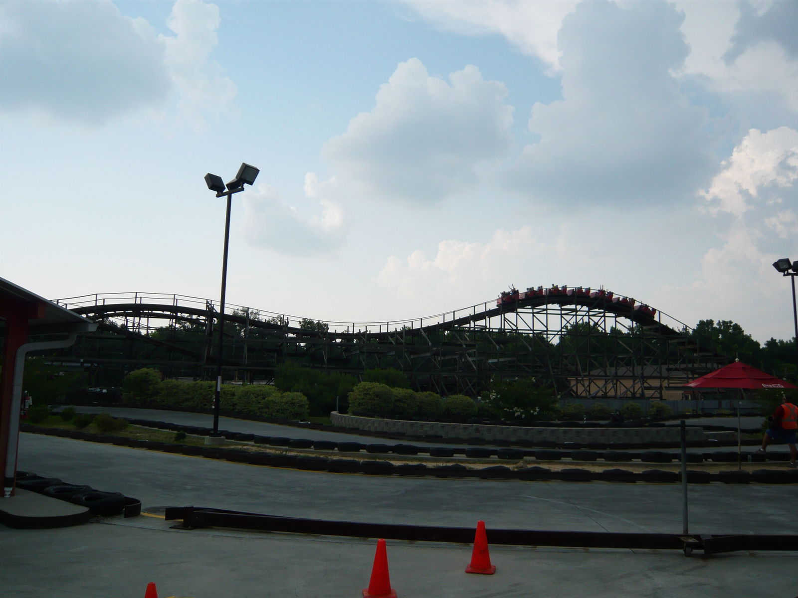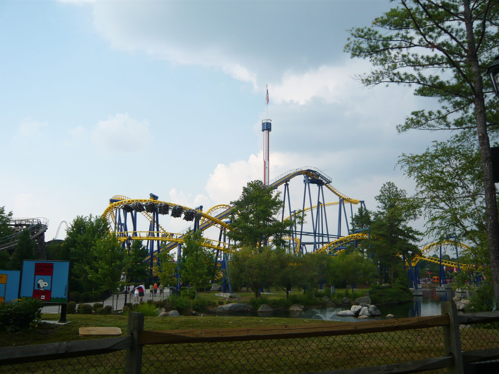 Nun konnte ich einmal in persona sehen, wie die Staatsgrenze zwischen North und South Carolina hier durch den Park verläuft - etwas, das ich auf Bildern von hier immer schon faszinierend fand! An diesem Freitagabend tummelten sich hier wesentlich mehr Menschen als in den auf dieser Reise zuvor besuchten Parks. Wenn wir uns das richtig aus dem Internet zusammenreimten, war in einigen Schulbezirken dieser Gegend genau an diesem Tag der letzte Schultag vor den langen Sommerferien. Allerdings war dies keineswegs schlimm, da zwar viele Leute auf den Wegen, aber irgendwie nie in den Warteschlangen waren. Hinzu kamen die Cedar Fair-typischen Mehrzugbetrieb-Abfertigungen, die wir so lieben und schätzen.