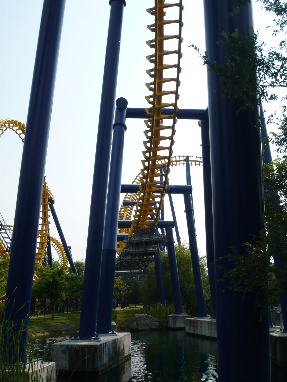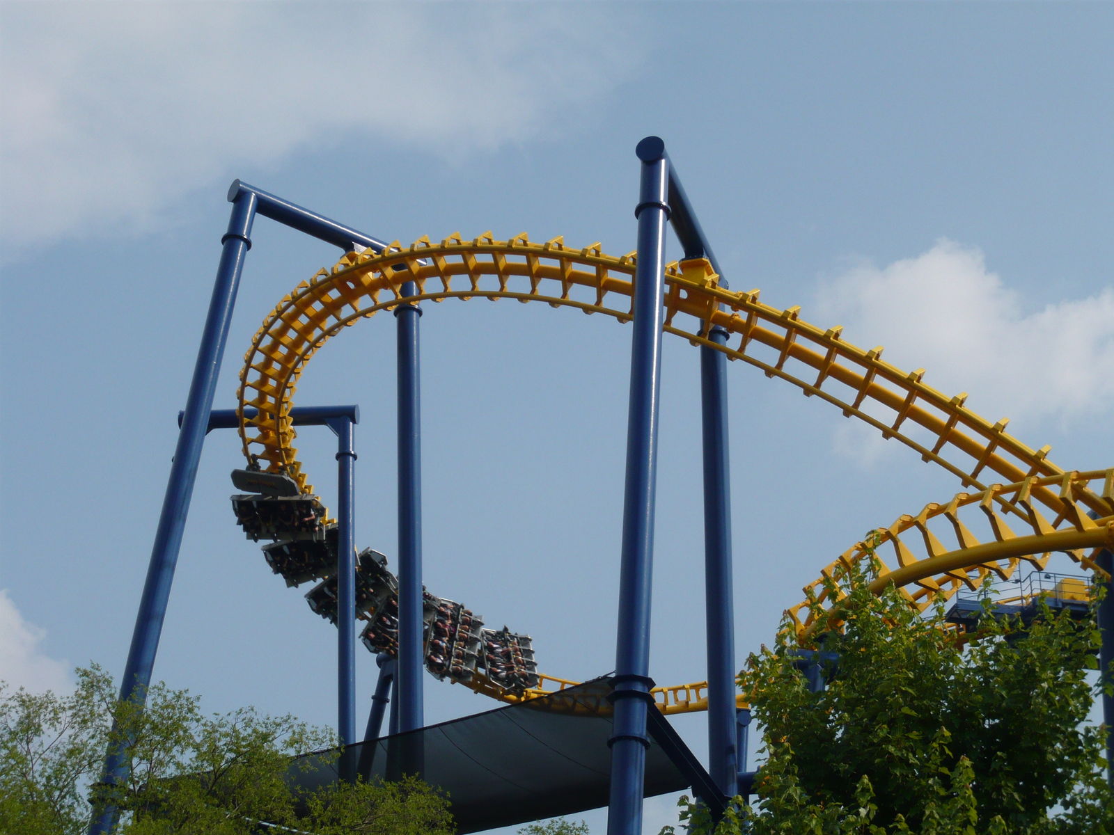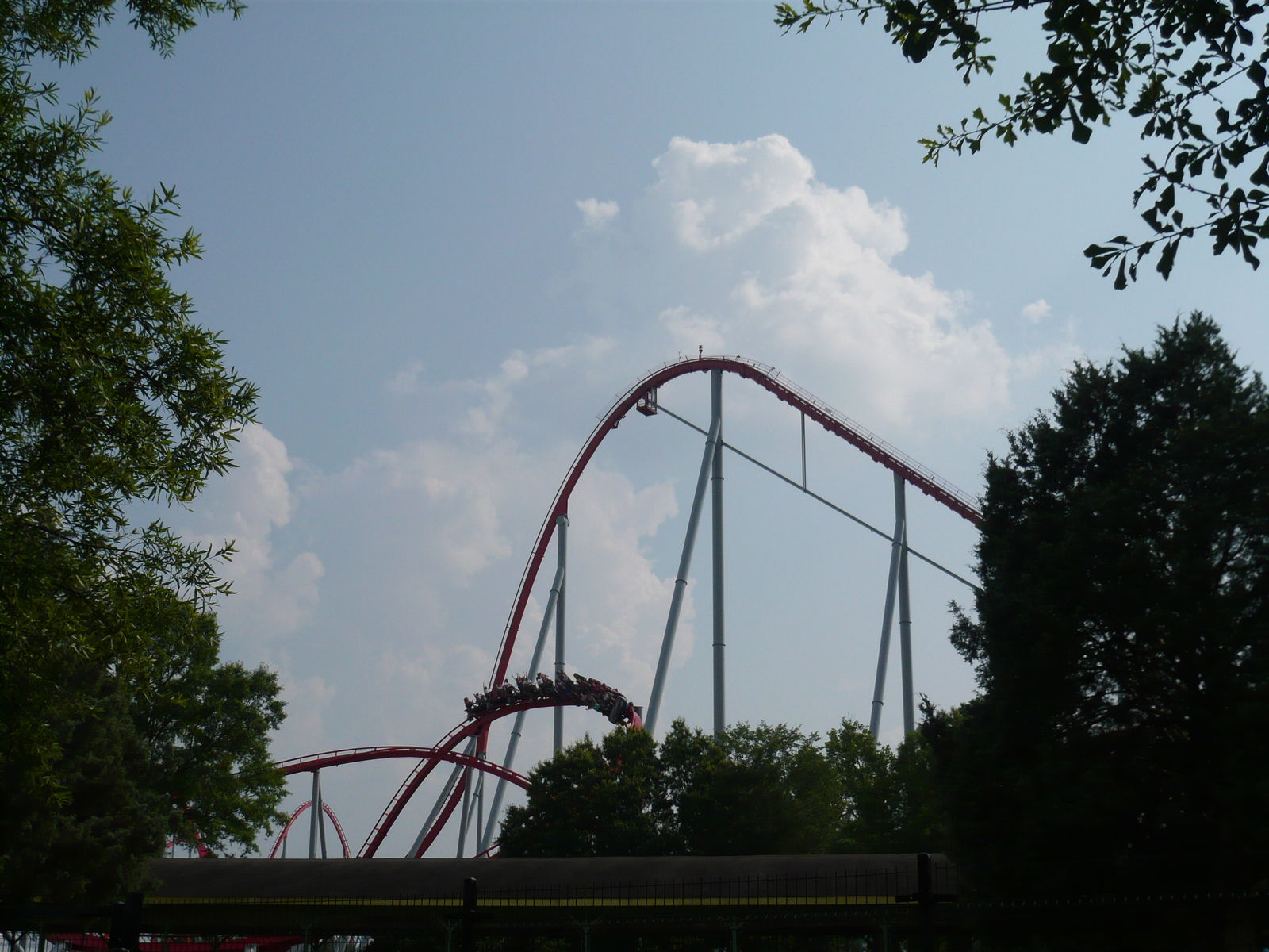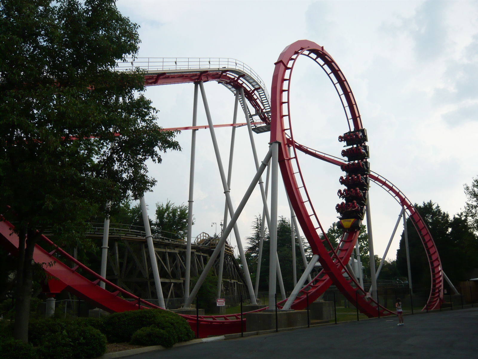 zweimal "seitlichen Anlauf", bevor man den Scheitelpunkt des Halbloopings erreicht und dann unter dem Weg zum zweiten Parkeingang durchsaust! Eine absolute Top-Bahn!