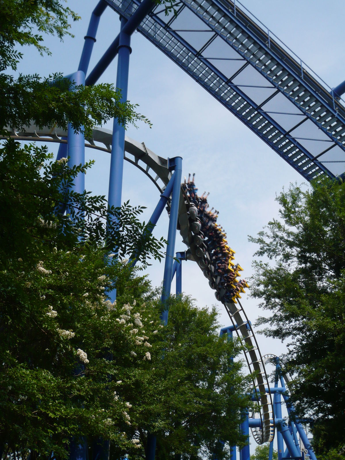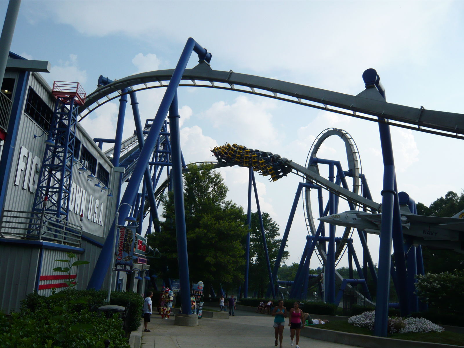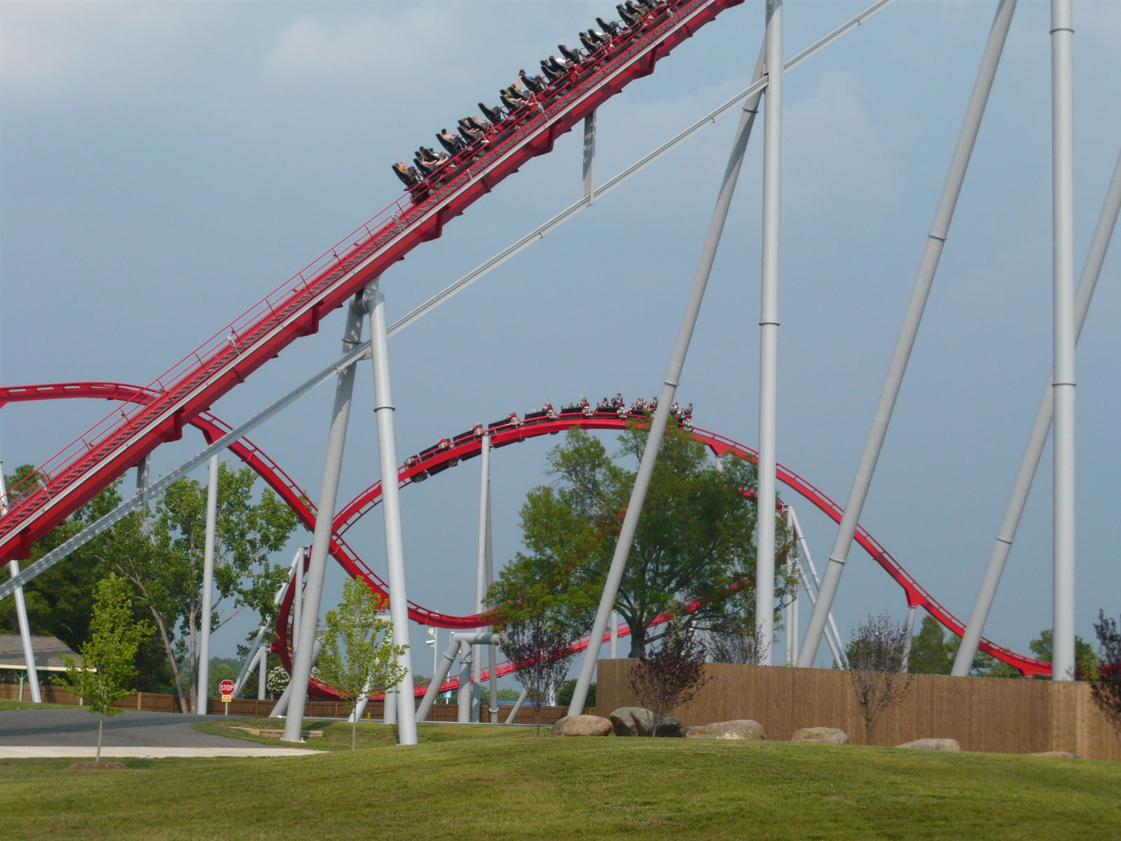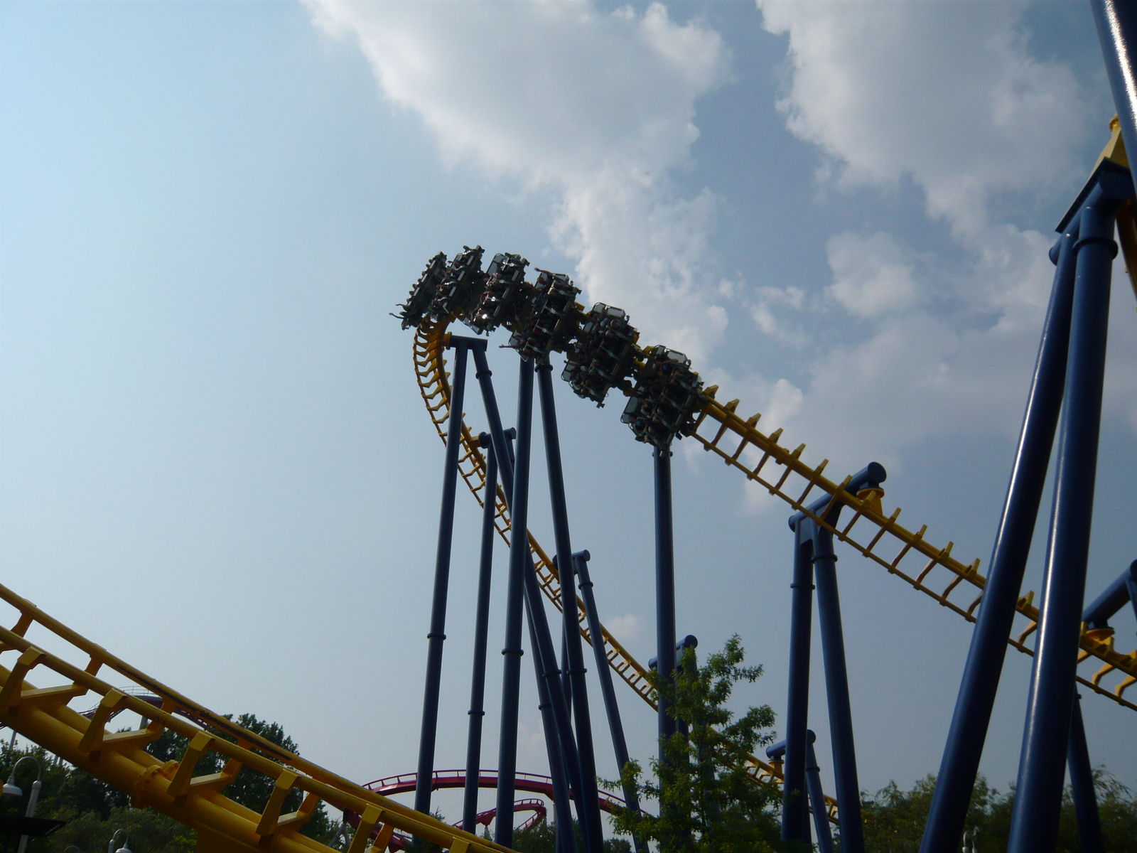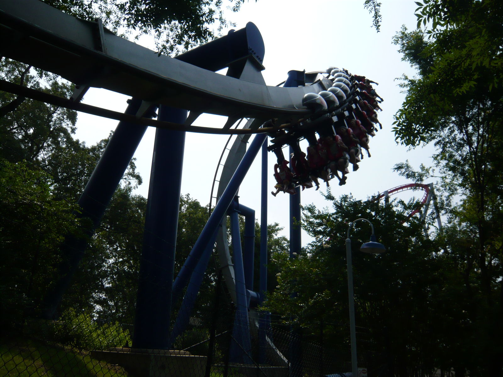 zweimal "seitlichen Anlauf", bevor man den Scheitelpunkt des Halbloopings erreicht und dann unter dem Weg zum zweiten Parkeingang durchsaust! Eine absolute Top-Bahn!