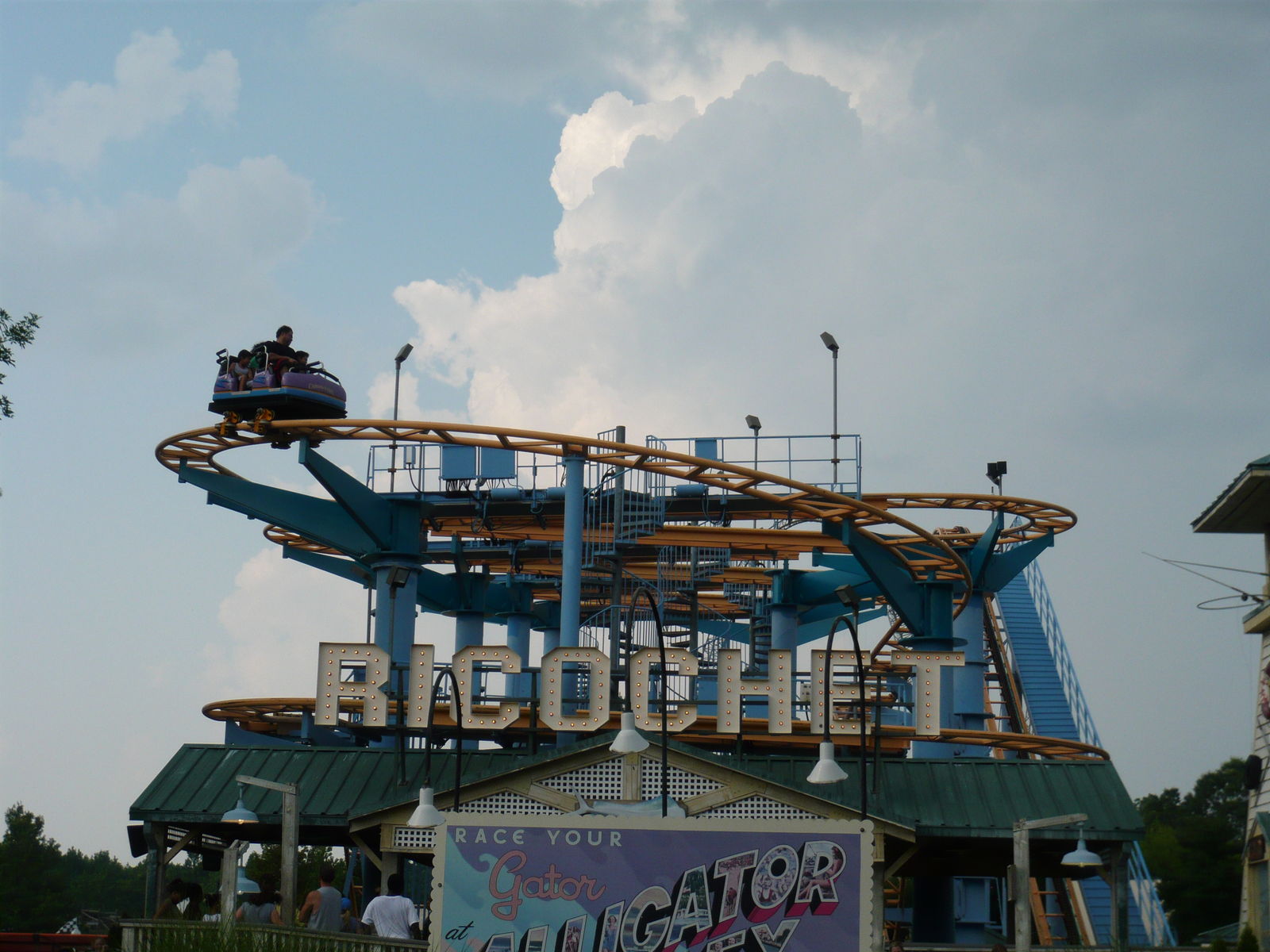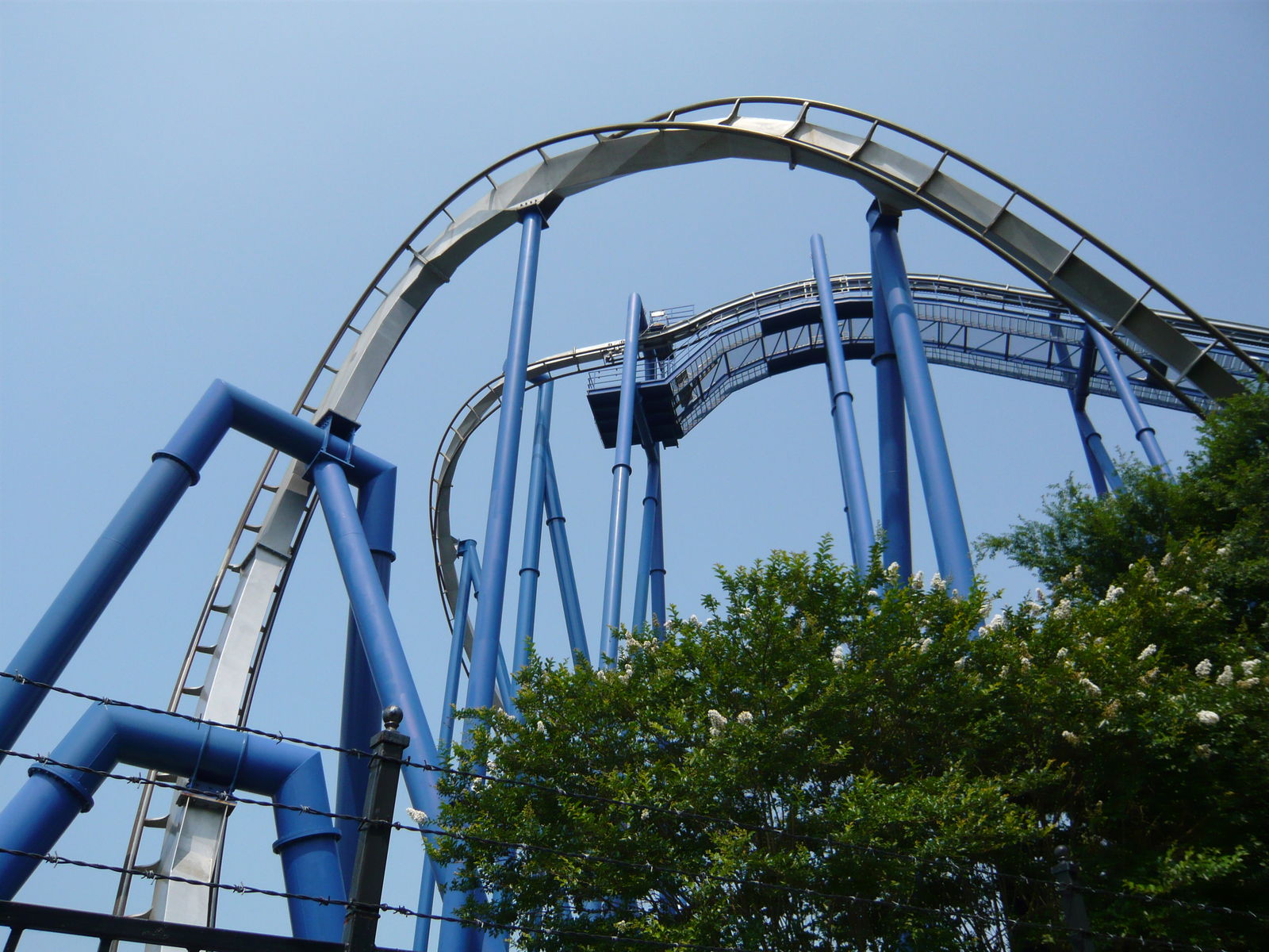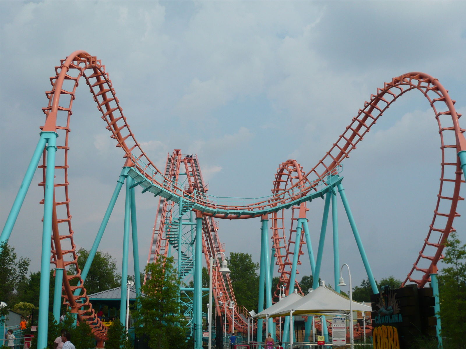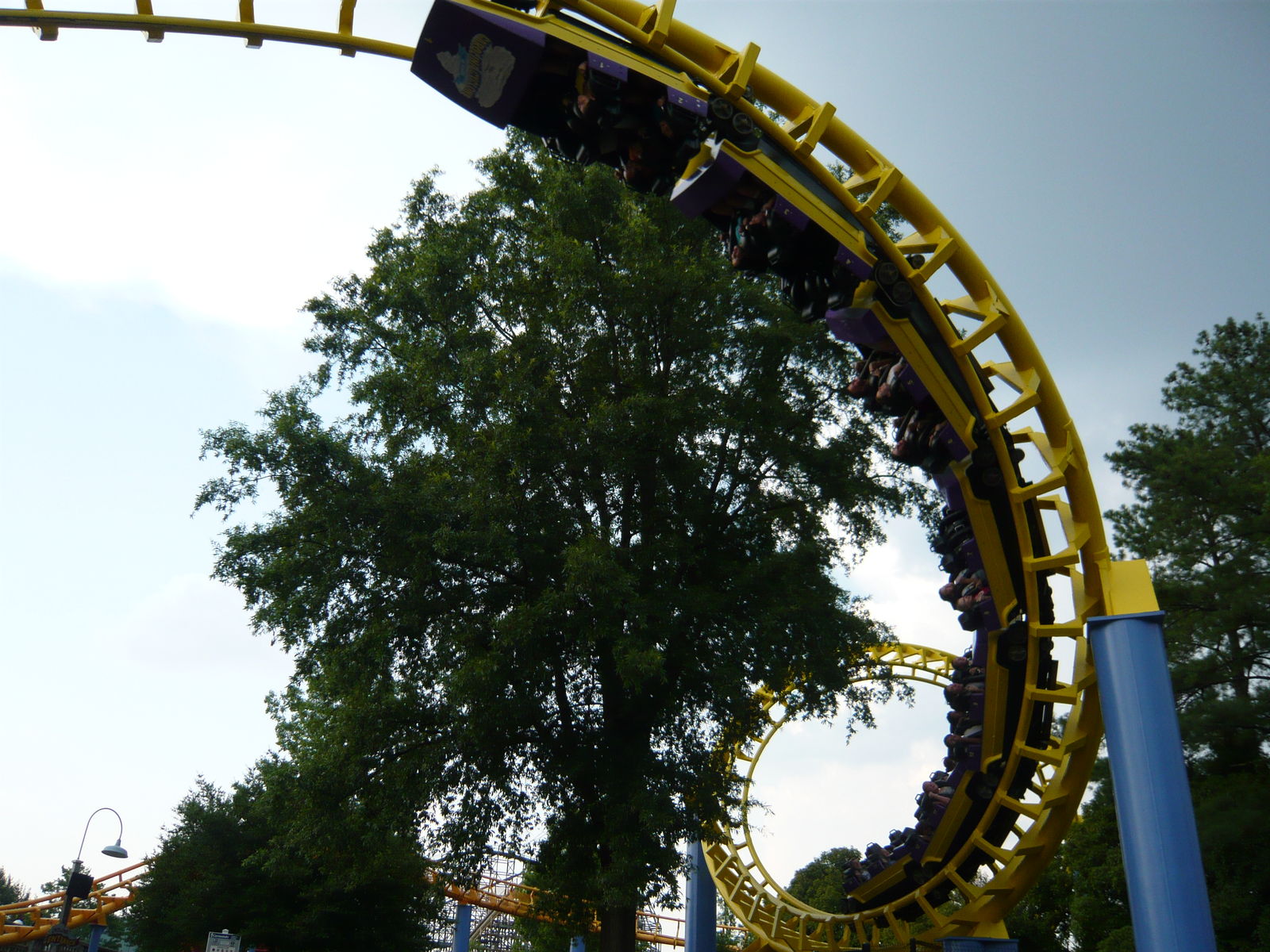 zweimal "seitlichen Anlauf", bevor man den Scheitelpunkt des Halbloopings erreicht und dann unter dem Weg zum zweiten Parkeingang durchsaust! Eine absolute Top-Bahn!