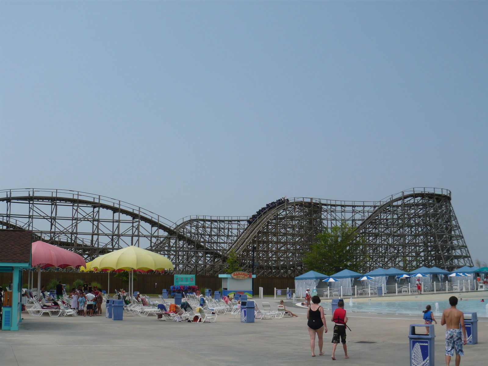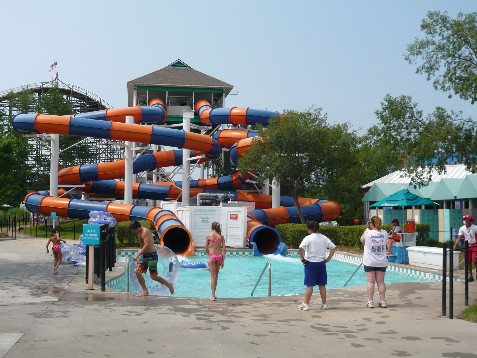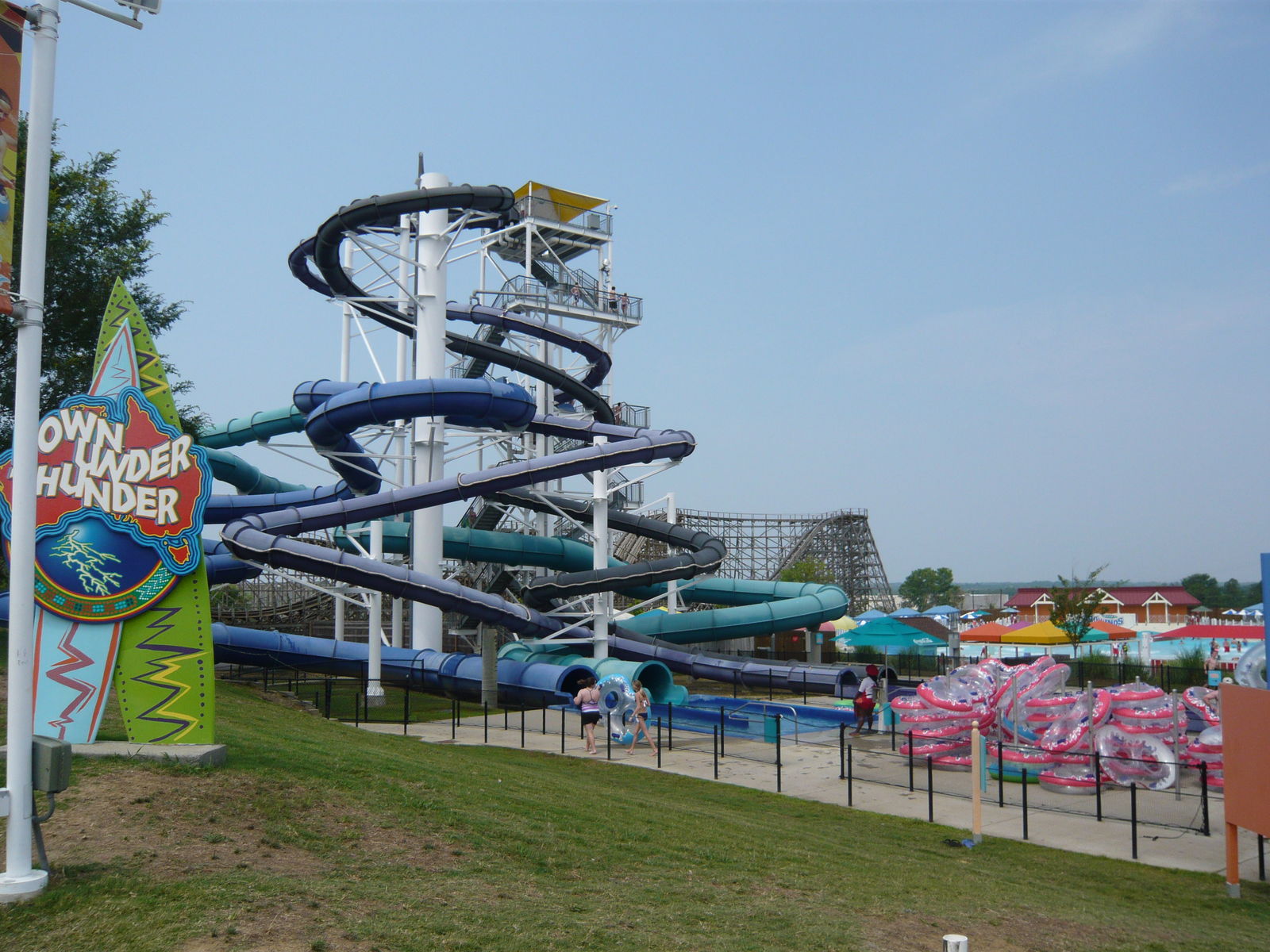 Beim hübsch angelegten Lazy River entlang der Thunder Road-Bahn herrschte wieder einmal Ringzwang für das kaum hüfttiefe Wasser. Trotz grosser Beliebtheit hielt sich die Anzahl der zur Verfügung gestellten Ringe in Grenzen und einer der beiden Zugänge war selbst an einem so vollen Samstag einfach abgesperrt, so dass sich die Menschenmassen am anderen umso mehr stauten. Ausserdem sind diese Zugänge für die durchzusetzenden Regeln der Bademeister denkbar unglücklich designt: Bei viel Andrang muss man seinen Ring nach einer Runde an die nächsten wartenden Gäste abgeben, dies muss über einen engen, durch die Strömung recht schwer erreichbaren "Seitenkanal" des eigentlichen Lazy Rivers geschehen. Dutzende Besucher, die das Abzweigen wegen der hier besonders starken Strömung und dem wie gesagt eng konstruierten Seitenkanal nicht schafften - vor allem jüngere und ältere Besucher, bei denen das ja keinesfalls böswillig geschah - wurden