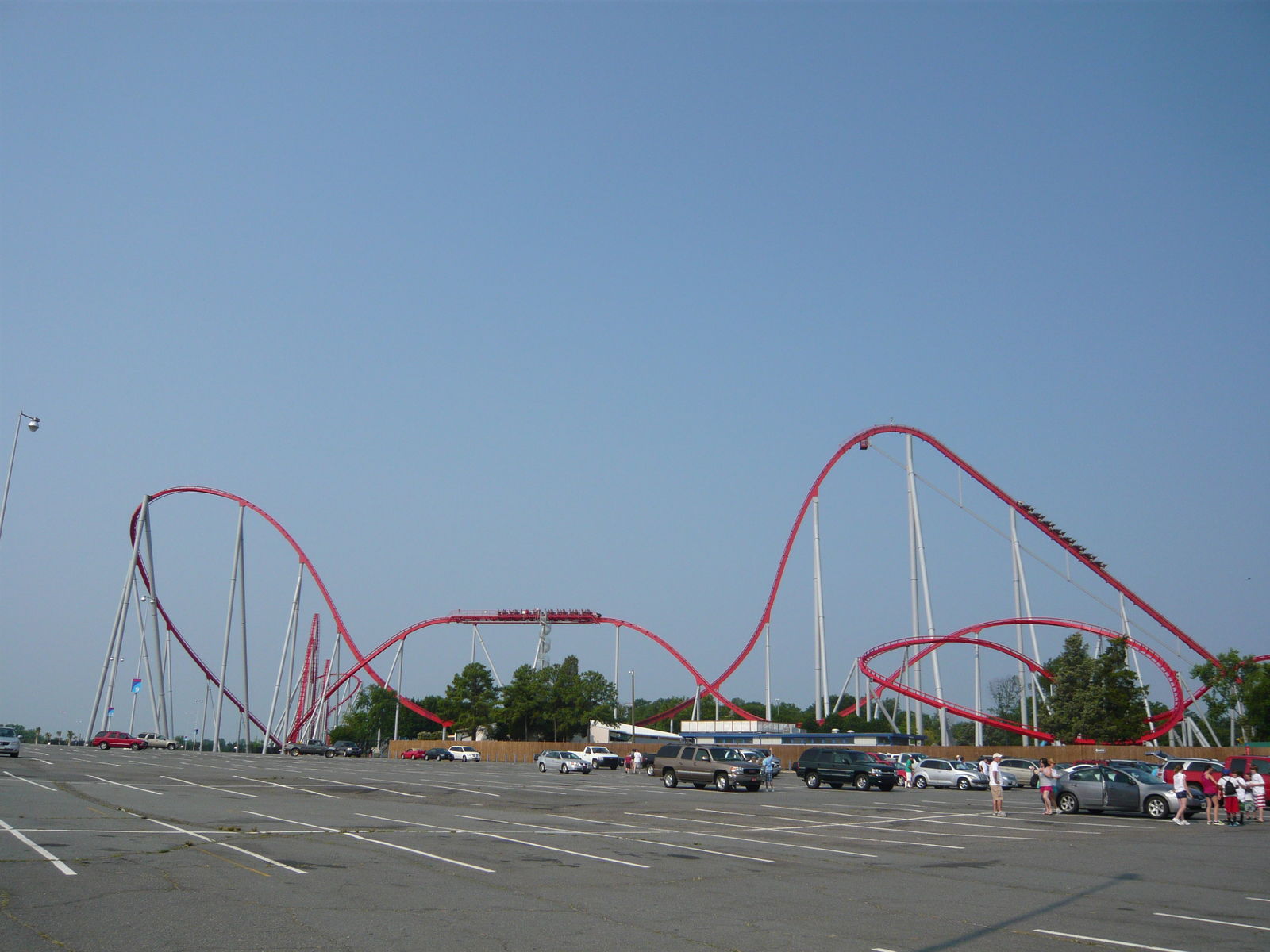Als nächste Station auf unserem Roadtrip sollte Carowinds folgen. Von Virginia Beach aus mussten wir bis Charlotte, NC erst einmal lockere 358 Meilen fahren - gut 576 km. Mit mehreren Essens-, Tank- und Beinstreckpausen waren wir einen Grossteil des Tages auf unendlich weitreichenden Land-Highways und Interstates unterwegs. Irgendwann nachmittags war dann der Autobahnring von Charlotte endlich erreicht und plötzlich erschien der schon von weit her sichtbare "kleinere" Intimidator am Horizont! Voller Vorfreude wurden also die letzten Meilen noch bewältigt, dann checkten wir in unser reserviertes, recht nahe beim Park gelegenes Motel ein. Kurz noch frisch gemacht und dann auf zum Ort des Geschehens!