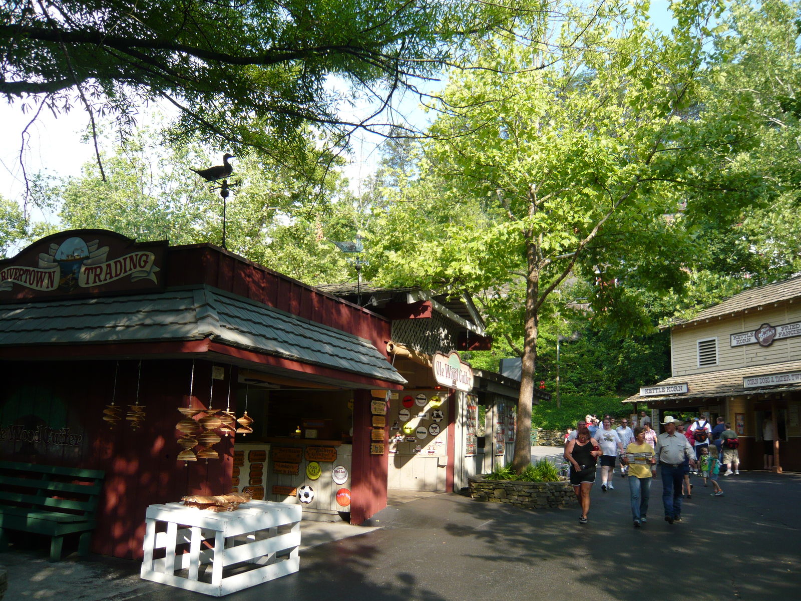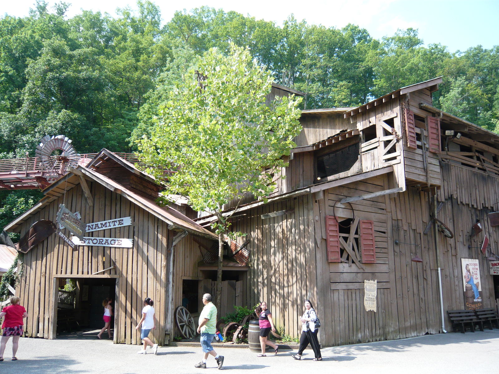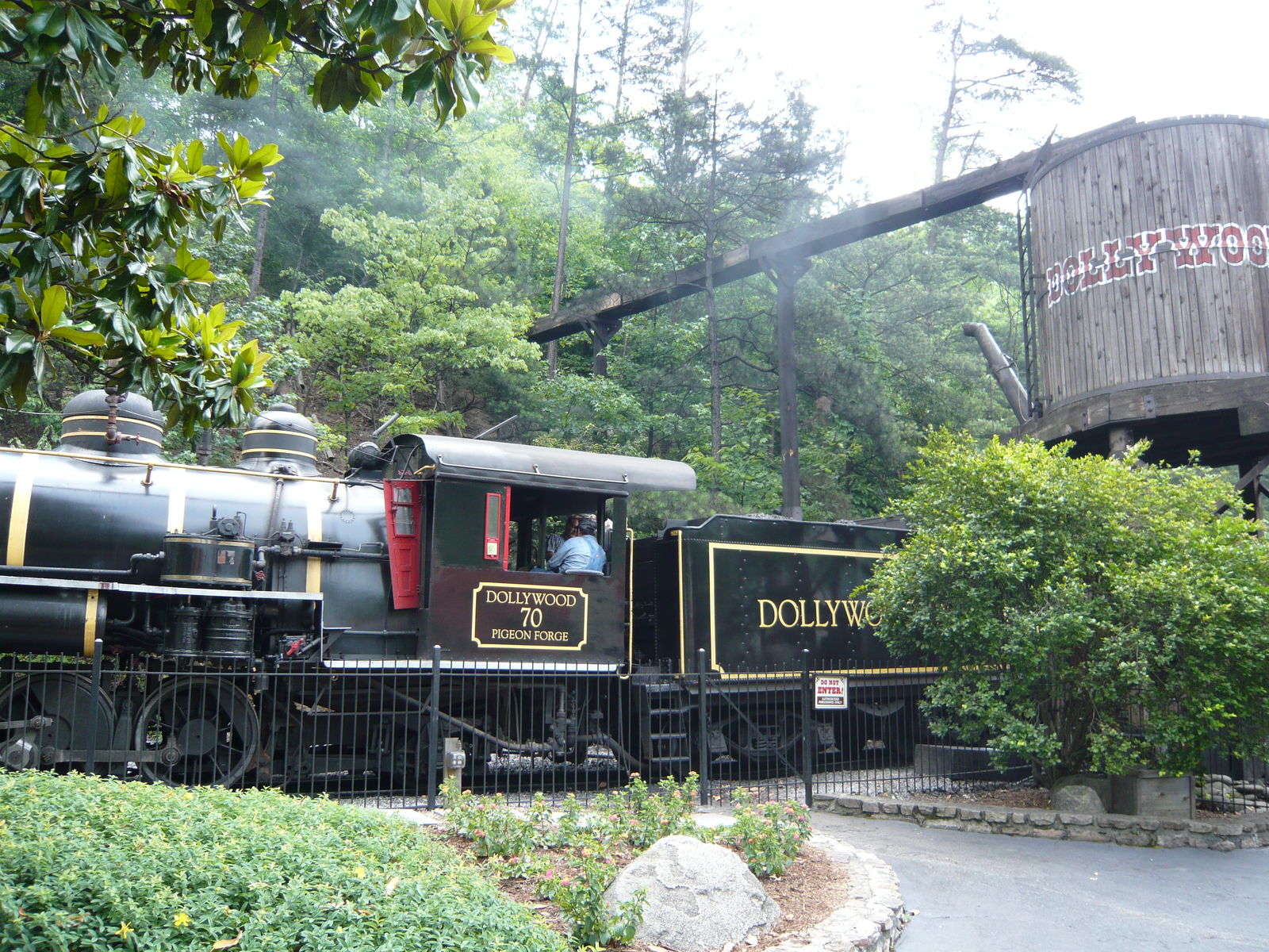 Bald haben wir noch eine Fahrt mit der Parkeisenbahn unternommen. Wie Björn in seinem letzten Bericht ja schon erklärt hat, trifft dieser Begriff im freizeitparktechnischen Sinne hier jedoch nur halbwegs zu: Erstens kommt nämlich eine echte, schnaufende Dampflok zum Einsatz und zweitens führt die Strecke ein gutes Stück aus dem eigentlichen Park hinaus - hügelaufwärts und durch den tiefen Wald auf ein kleines Hochplateau, wo man dann wieder kehrtmacht. Gut 25 Minuten ist man hier insgesamt unterwegs. Die Kehrschlaufe am obersten Streckenpunkt führt um einige Häuser und Themeing-Requisiten herum, die aus Zeiten stammen, als der Park noch andere Namen trug. Laut den Informationen aus den Lautsprechern hiess er bis in die 80er sogar Silver Dollar City - was eine enge Beziehung zum gleichnamigen Schwesterpark in Missouri beweist. Der Aufkauf durch Dolly Parton erfolgte erst später.