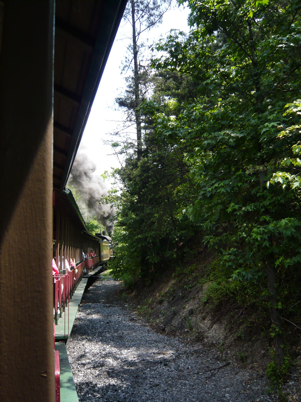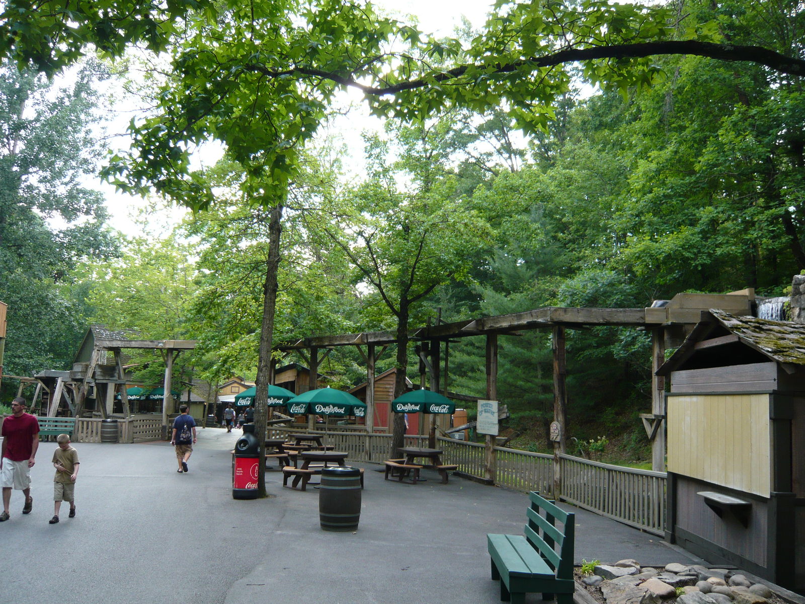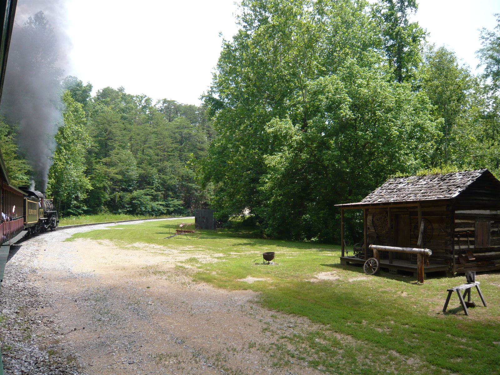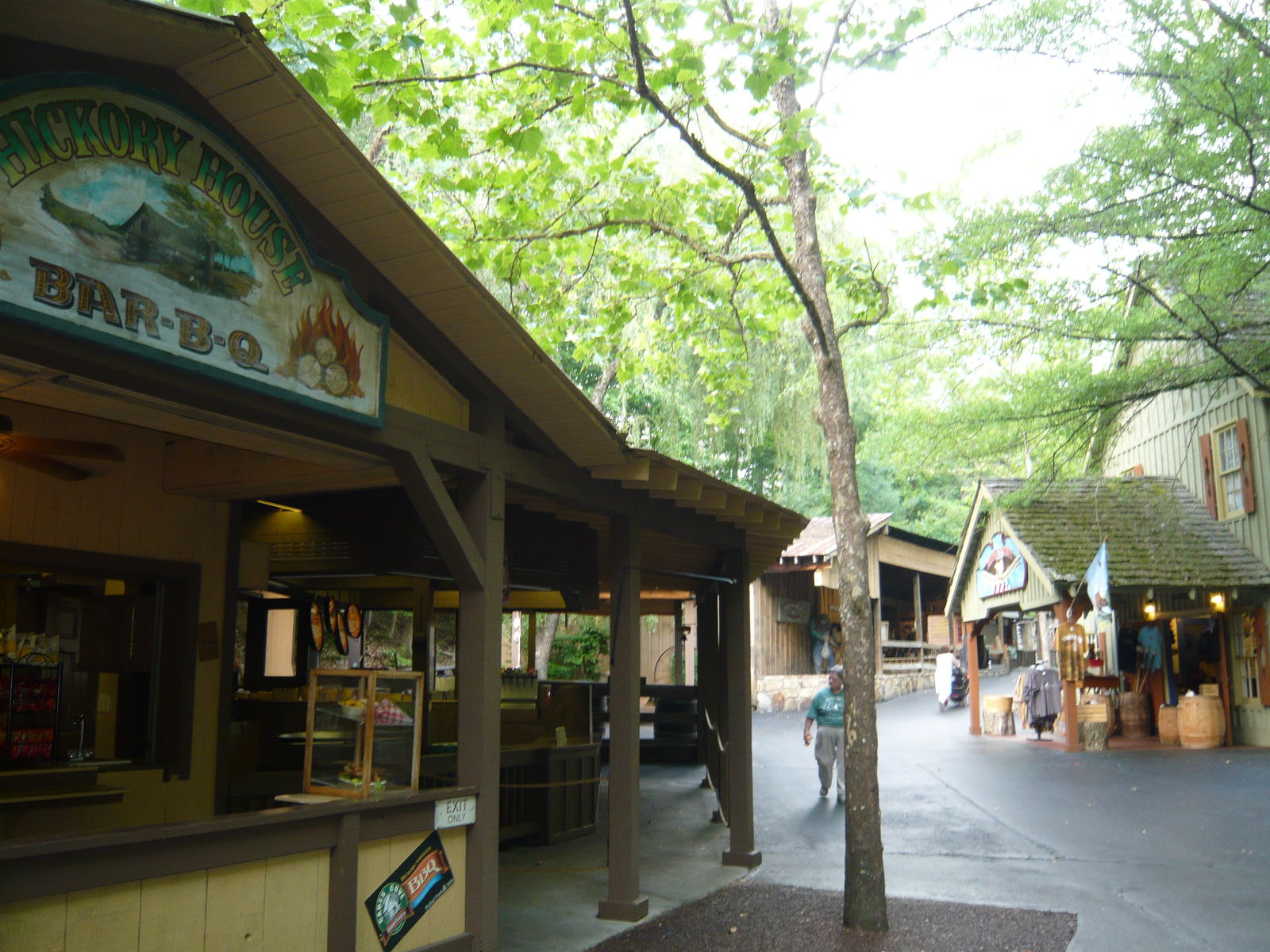 Bald haben wir noch eine Fahrt mit der Parkeisenbahn unternommen. Wie Björn in seinem letzten Bericht ja schon erklärt hat, trifft dieser Begriff im freizeitparktechnischen Sinne hier jedoch nur halbwegs zu: Erstens kommt nämlich eine echte, schnaufende Dampflok zum Einsatz und zweitens führt die Strecke ein gutes Stück aus dem eigentlichen Park hinaus - hügelaufwärts und durch den tiefen Wald auf ein kleines Hochplateau, wo man dann wieder kehrtmacht. Gut 25 Minuten ist man hier insgesamt unterwegs. Die Kehrschlaufe am obersten Streckenpunkt führt um einige Häuser und Themeing-Requisiten herum, die aus Zeiten stammen, als der Park noch andere Namen trug. Laut den Informationen aus den Lautsprechern hiess er bis in die 80er sogar Silver Dollar City - was eine enge Beziehung zum gleichnamigen Schwesterpark in Missouri beweist. Der Aufkauf durch Dolly Parton erfolgte erst später.
