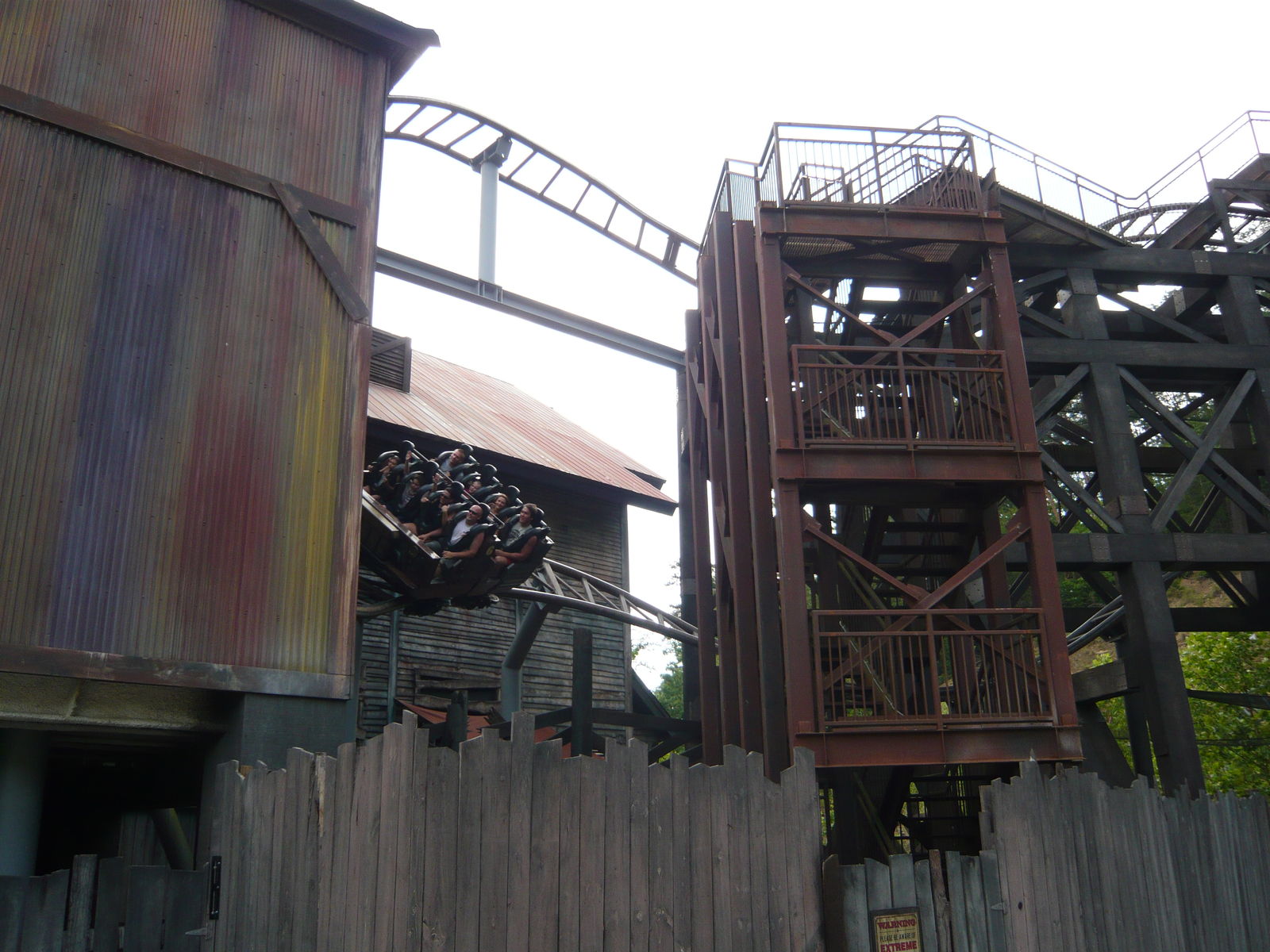 Horseshoe Turn und zwei sich an einen Hang schmiegenden Spiralen. Daraufhin entert man erneut die Minenschächte und wird dort abgebremst. Krähengeräusche und ein hexenartiges Lachen künden Unheil an. Dramatische Musik erklingt, dann wird man im zweiten Senkrechtaufzug hochgezogen. Stroboskope erzeugen Gewitterstimmung, ein Bildschirm an der Spitze des Lifts gibt den Eindruck, als ob ein anderer Minenturm gleich über einem zusammenkracht, die Musik und die Geräuscheffekte sind auch darauf abgestimmt. Danach wird es dunkel und still, man passiert die Spitze und findet sich vor einer Art Falltür wieder. Stillstand. Jetzt folgt der Höhepunkt der Bahn: Direkt hinter einem engen Loch vor einem entzünden sich Dynamitstangen und in letzter Sekunde taucht man vor dem in der Frontrow wirklich heiss spürbaren Feuereffekt ins Loch hinab - direkt in einen stattlichen, mehr als senkrechten Sturz, der auch noch leicht getwistet ist. Einen derartigen Überraschungseffekt hatte ich schon lange nicht mehr auf einer Achterbahn - einfach irrsinnig toll! Mit dem gewonnenen Schwung absolviert man danach eine aufsteigende, eineinhalbfache Heartline-Roll, die direkt in einen Halblooping mündet. Danach folgt noch ein kleines Hopserchen, dann ist bereits die Schlussbremse erreicht.