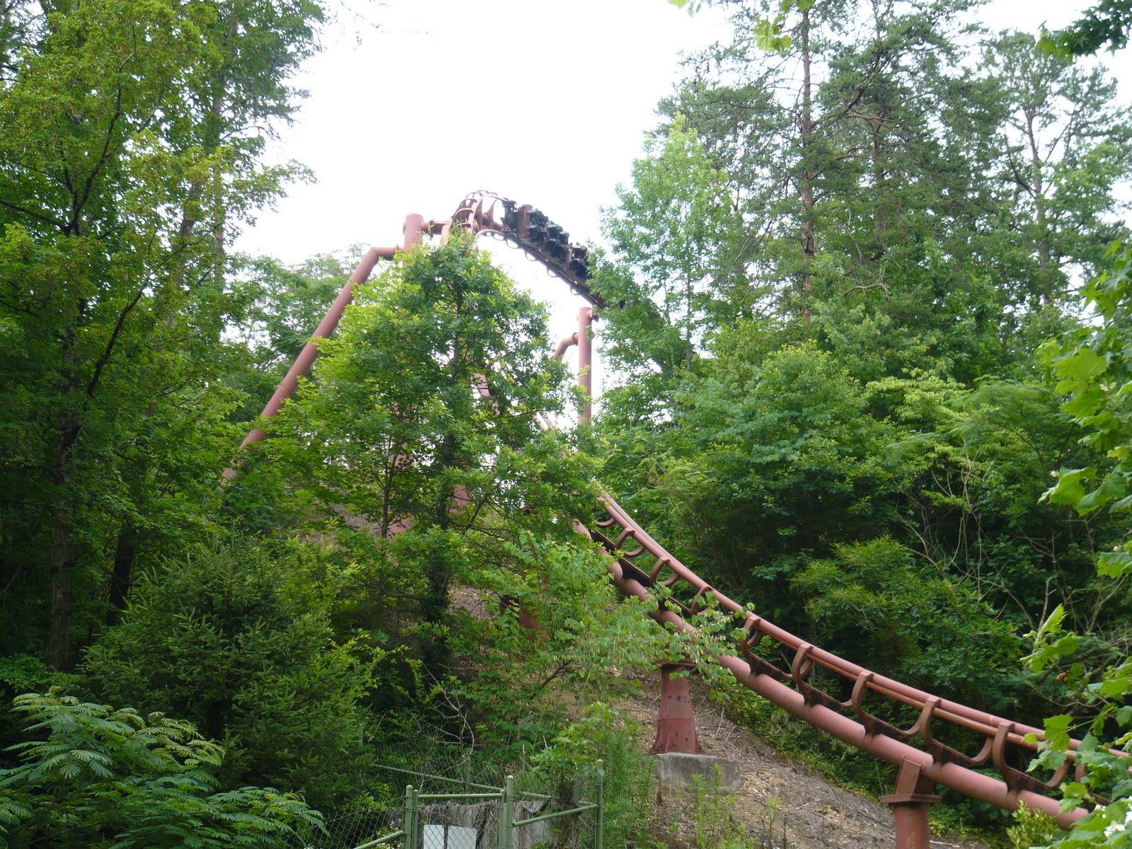 Und tatsächlich: Für einen Arrow fährt sich die Bahn erstaunlich sanft! Natürlich sollte man dabei keinen Schweizer oder Schwarzkopf-Fahrkomfort erwarten - leichte Vibrationen gibt es schon. Aber im Arrow-Vergleich sticht dieses Exemplar ganz klar angenehm hervor. Und auch die Strecke weiss zu überzeugen: ein langer Lifthill, der einen natürlichen Hügel hinauf führt; dann ein grandioser, komplett in den Berg eingegrabener