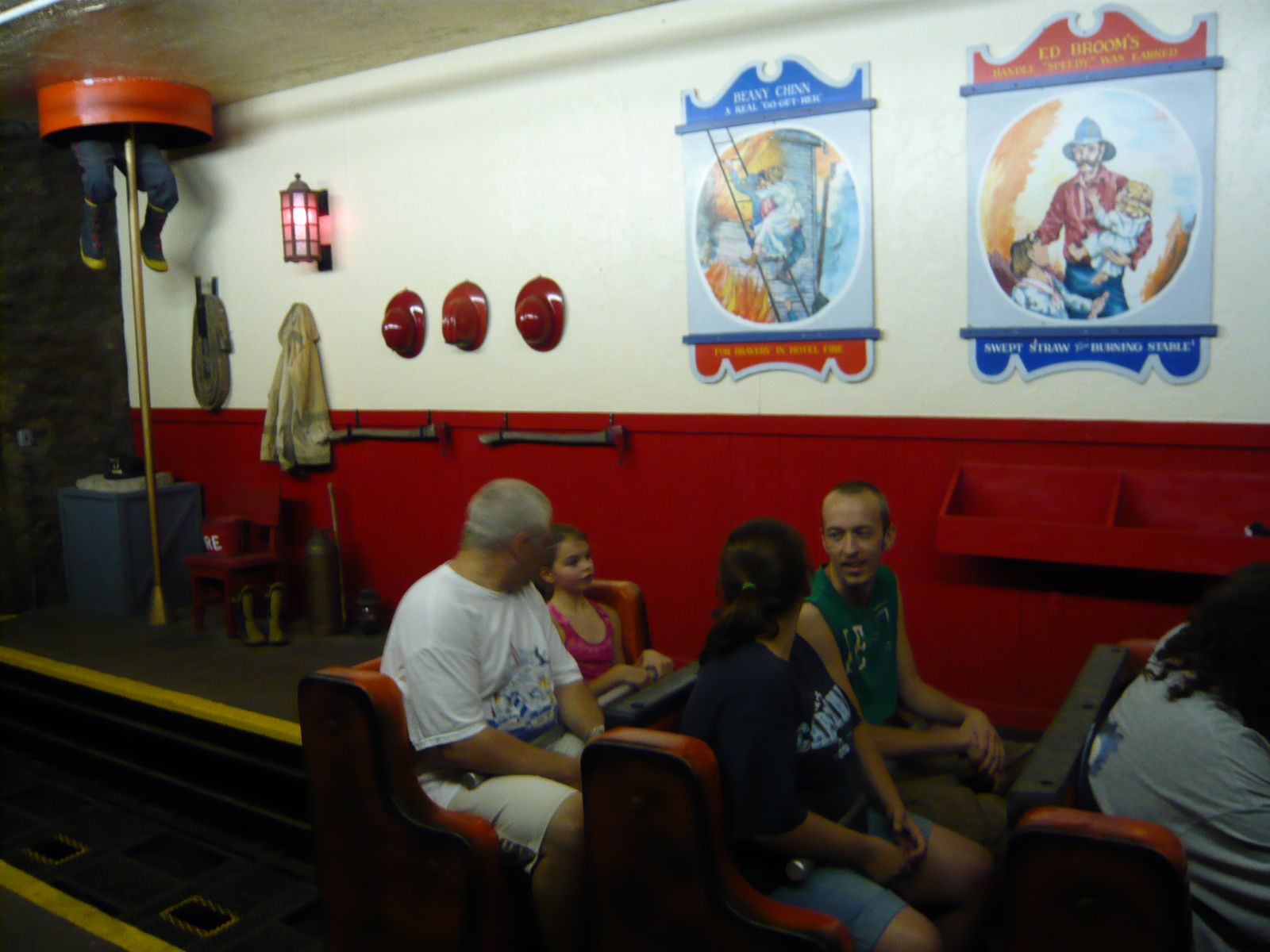 Die Indoor-Bahn Blazing Fury ist eigentlich mehr Darkride als Achterbahn, hat aber gegen den Schluss drei Schussfahrten, die sie wohl als Coaster zählen lassen. Hier mussten wir ziemlich lange warten, da zunächst nur ein Zug im Einsatz war und kurz vor unserer Fahrt dann noch ein zweiter auf die Strecke geholt wurde, der erst einige Testzyklen mit Mitarbeitern machen musste. Dank der stolzen Fahrzeit der Anlage nahm dies etwas Zeit in Anspruch. Über Lautsprecher wurde das Vorgehen aber gut erklärt und man wusste immer genau, wie lange es noch etwa dauern würde. So hatte man dann auch etwas Zeit, die als Feuerwehrwache gestaltete Station zu beäugen. Auch hier gab es wieder lustige Details bis in den hintersten Winkel zu entdecken - u.a. lustige Schilder und das oben abgebildete Animatronic mit den Beinen des Feuerwehrmanns an der Rutschstange.