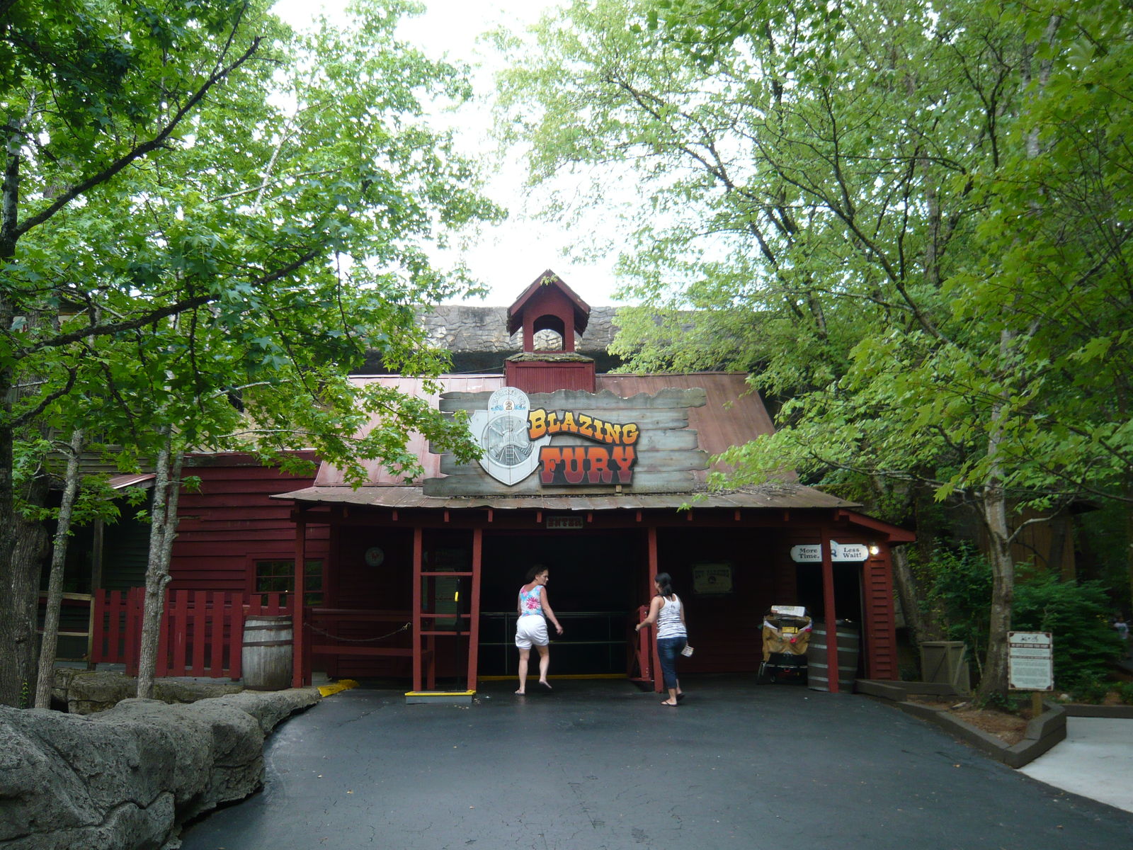 Die Fahrt selbst beginnt zunächst als Themenfahrt durch eine brennende Stadt aus vergangener Zeit. Ist wirklich hübsch gemacht, es wird sowohl mit Lichteffekten als auch mit einfachen Tricks wie z.B. über Ventilatoren aufgehängten, feuerrot leuchtenden Textilien gearbeitet. Ausserdem lassen sich einige Animatronics mit herrlichem Südstaaten-Gequassel entdecken. Zweimal gibt es auch etwas ruhigere Szenen, wo man die brennende Stadt scheinbar verlässt und im Mondschein schimmernde Teiche mit Wasserfällen umrundet. Irgendwann folgen dann die drei Schussfahrten, nach denen man immer gleich wieder abgebremst wird und die alle eine "Flucht" vor der drohenden Feuersbrunst zum Zweck haben. Wenn ich das richtig rekapituliere, folgt die erste gleich nach einer Szene, wo die momentan überquerte Brücke in Brand zu geraten scheint. Danach findet man sich in einem dunklen Tunnel wieder und taucht quasi unter eine Lokomotive ab, die frontal auf einen zuzuschnaufen scheint. Und als letztes flüchtet man ähnlich wie bei Mystery Mine vor kurz vor der Sprengung befindlichem Dynamit, dann ist schon bald wieder die Station erreicht.