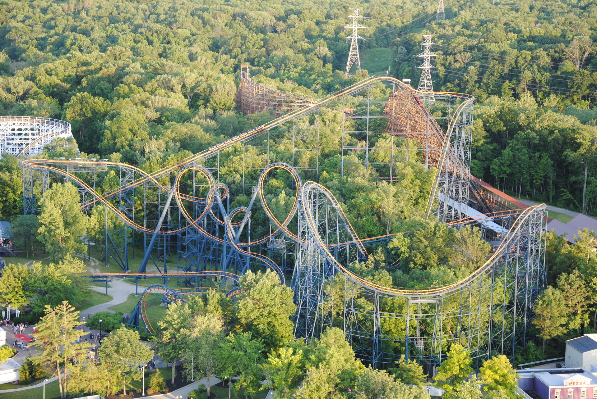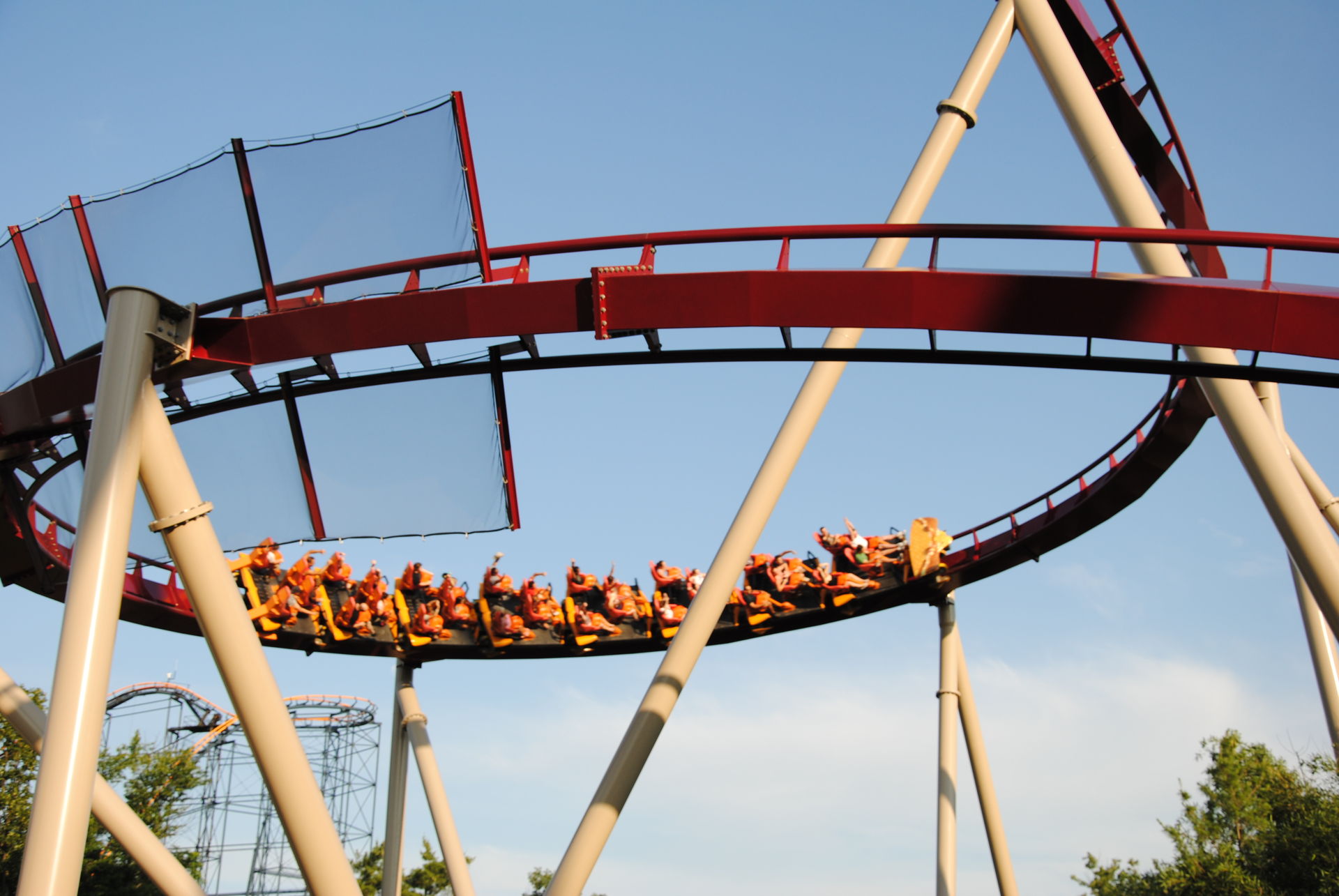 Die große Loopingbahn von Arrow, dahinter The Beast