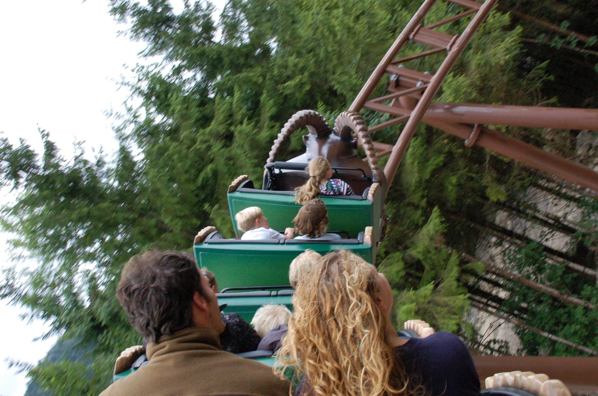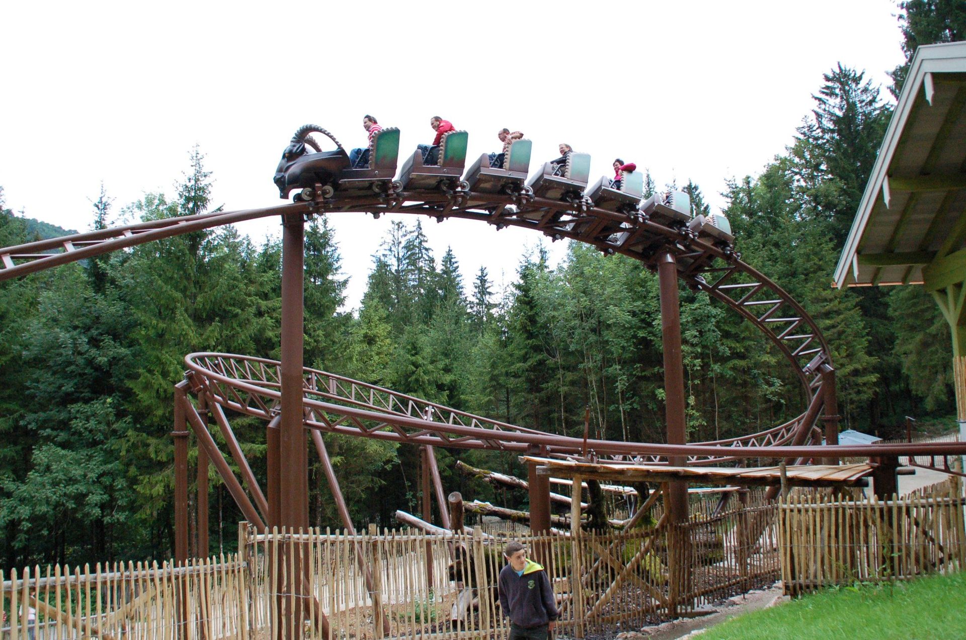 Airtime gegeizt. Am Ende der Linkskurve folgt der, in meinen Augen, Höhepunkt der Bahn: Ein S-Kurve, welche mit viel Speed durchfahren wird. Hier zeigt der Gipfelstürmer seinen Insassen einmal, zu was er fähig ist und wirft sie mit einem kleinen Hüpfer über einen Hügel von links nach rechts. Direkt anschließend geht es den zweiten Hügel hinauf und die Reibräder greifen mit einem leichten Ruck zu und schieben den Steinbock auf eine weitere Gerade. Auch hier folgt eine kleine Verschnaufpause und mit Schwung wird der gesamte Parcour nun rückwärts durchfahren, wobei auch hier wieder der Gipfelstürmer seine guten Fahreigenschaften zeigt und seinen Mitfahrern den einen oder anderen Jubelschrei entlockt.