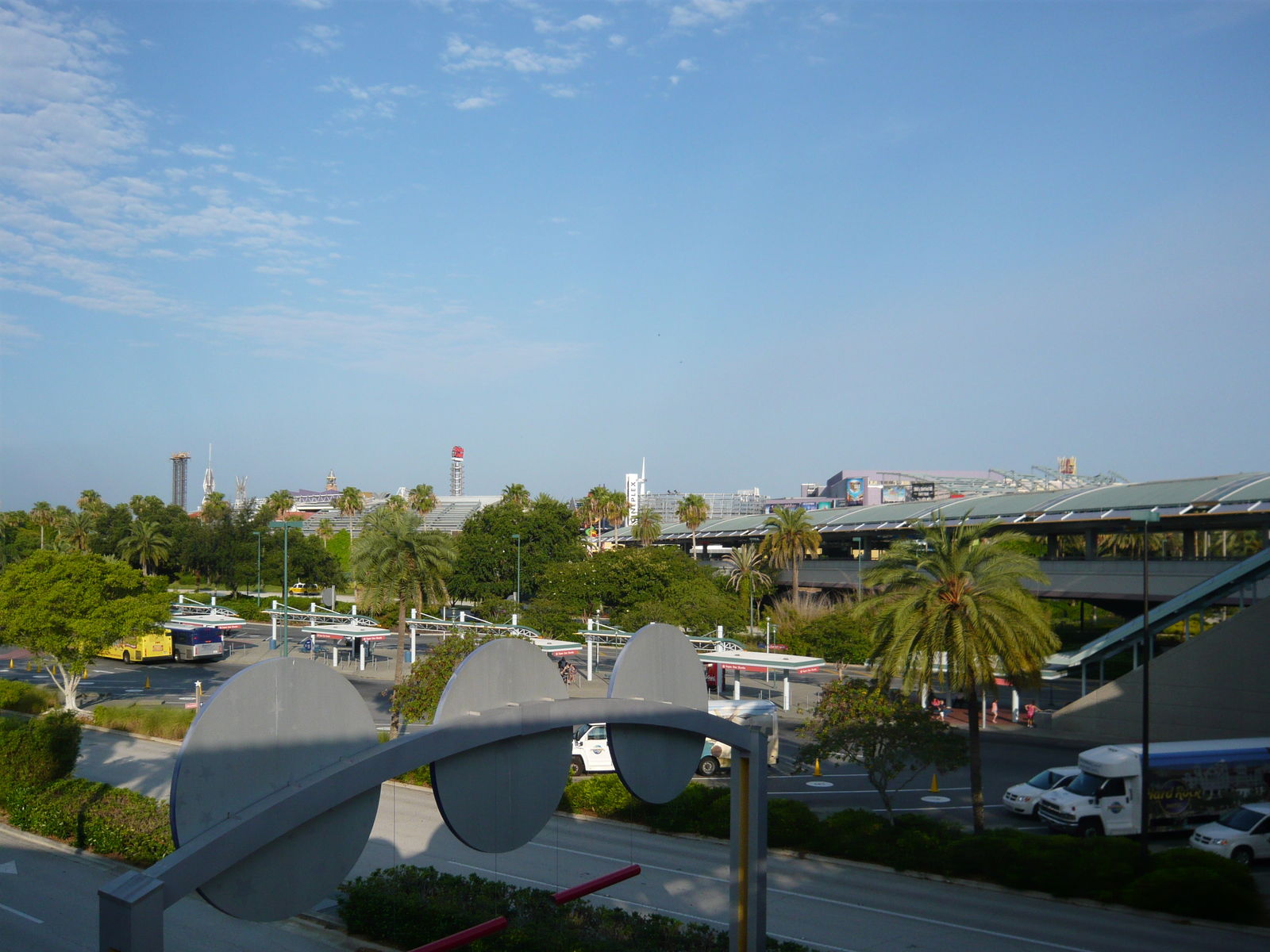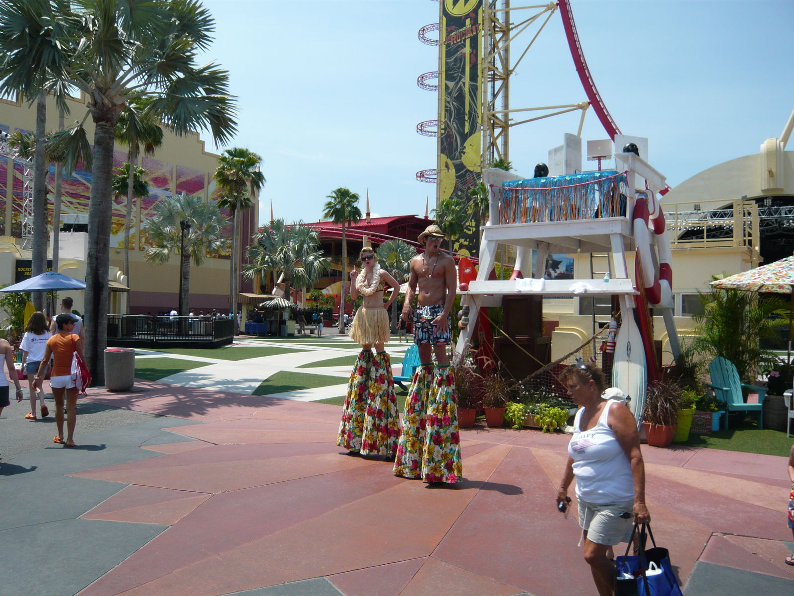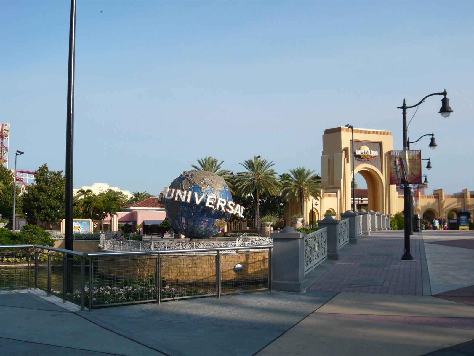 Das Abenteuer beginnt schon bei den überdimensionalen Parkhäusern, wo die Gäste von den Studios und den Islands of Adventure ihre Autos abstellen können. Von den Ausmassen her wirklich eindrücklich! Gerade in Florida ist es natürlich auch sehr wertvoll, für einmal echte Schattenplatz-Garantie zu haben und nach dem Parkbesuch nicht zu einem brutal aufgeheizten Fahrzeug zurückkehren zu müssen, wo man kaum das Steuerrad anfassen kann. Nachdem man sich das Stockwerk und den Parkplatzsektor gemerkt hat, gehts nun rüber zu den Parks! Zuerst ist die übliche Taschenkontrolle an der Reihe, danach führt der Weg über mehrere Brückenabschnitte mit Fahrsteigen über die Zufahrtsstrasse hinweg zum Shopping- und Unterhaltungskomplex City Walk.