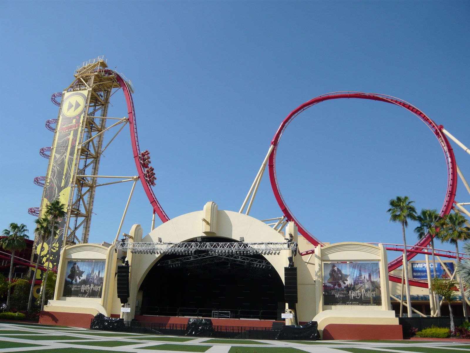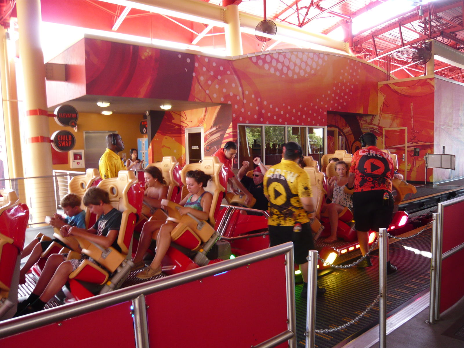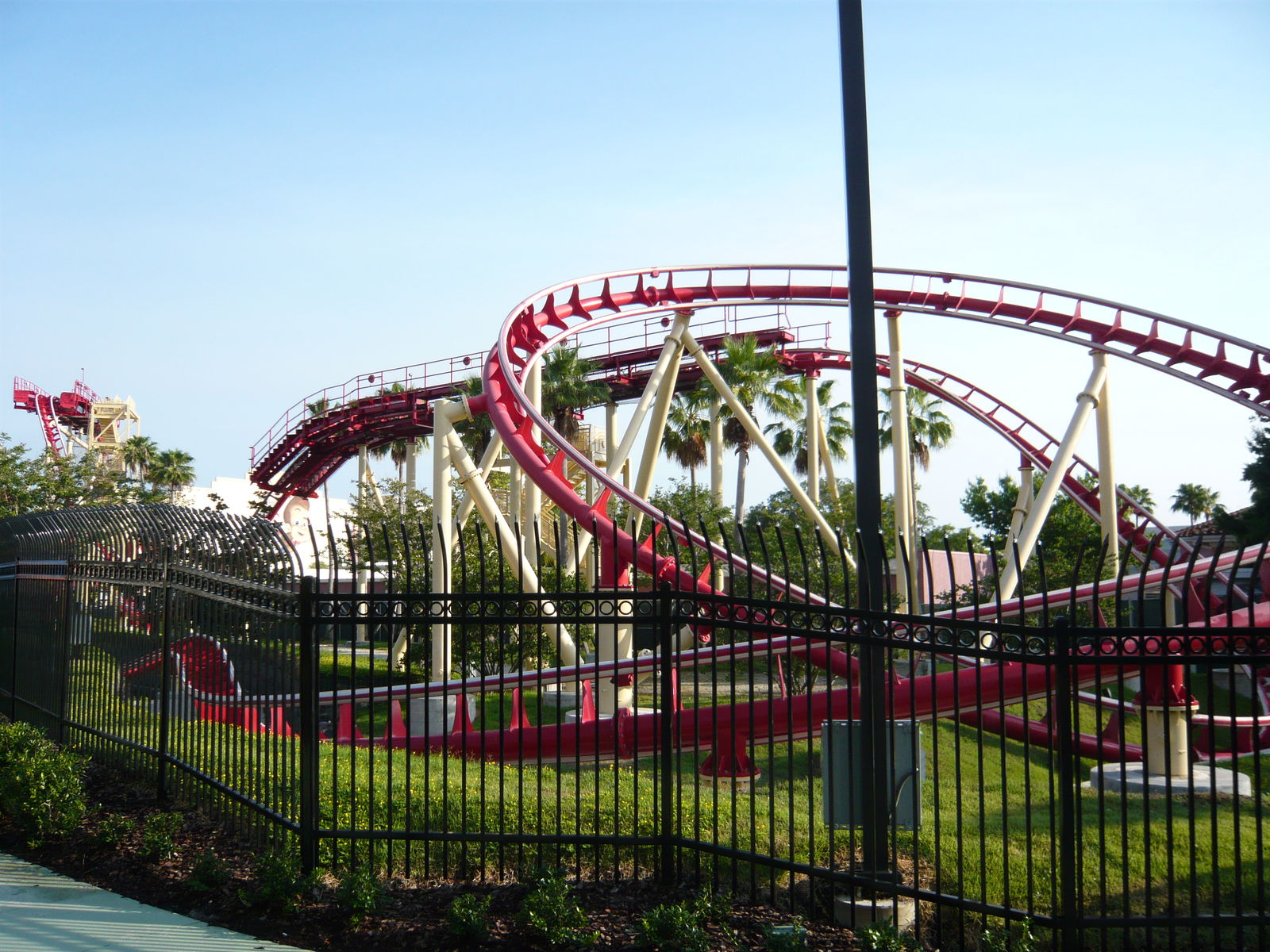 In der floridianischen Morgensonne schon alleine zum Ansehen einfach ein Leckerbissen! Von der Farbgebung, der Strecke und auch sonst von der ganzen Aufmachung her passt die Bahn irgendwie einfach klasse in diese Ecke des Parks, wo Studiokulissen und Produktionshallen die Gestaltung dominieren. Zum Glück führte diese problembehaftete Bahn schon während unserer ganzen Wartezeit vor den Parktoren erfolgreich Testfahrten durch, so dass wir zu den ersten Fahrgästen an diesem Tag gehörten.