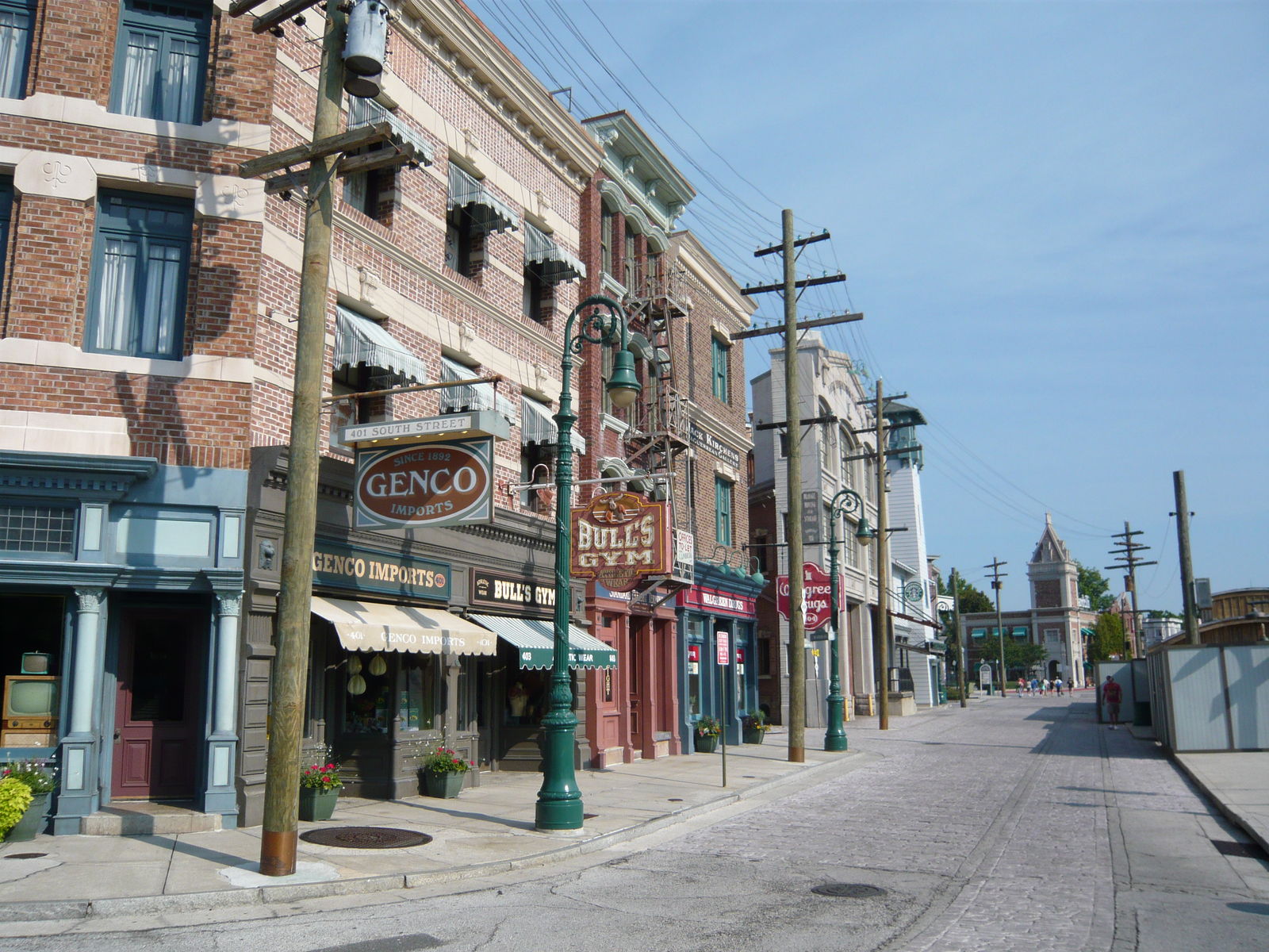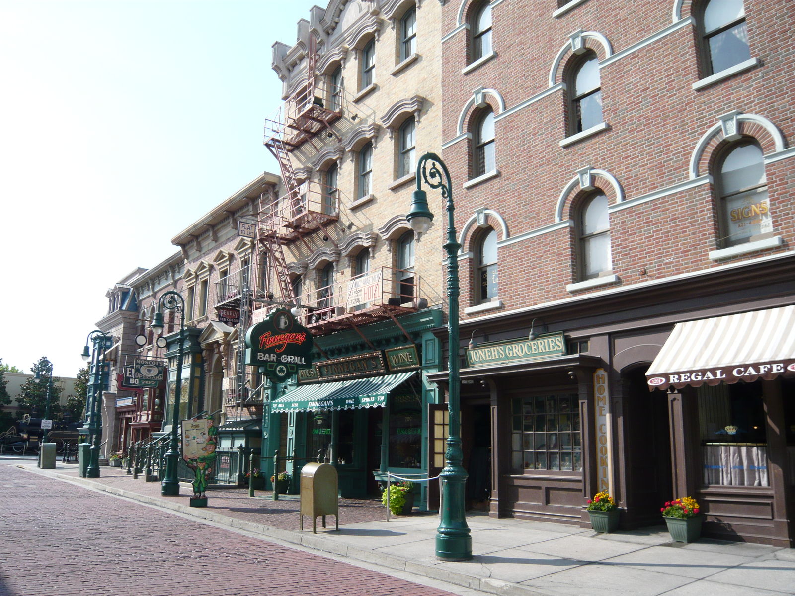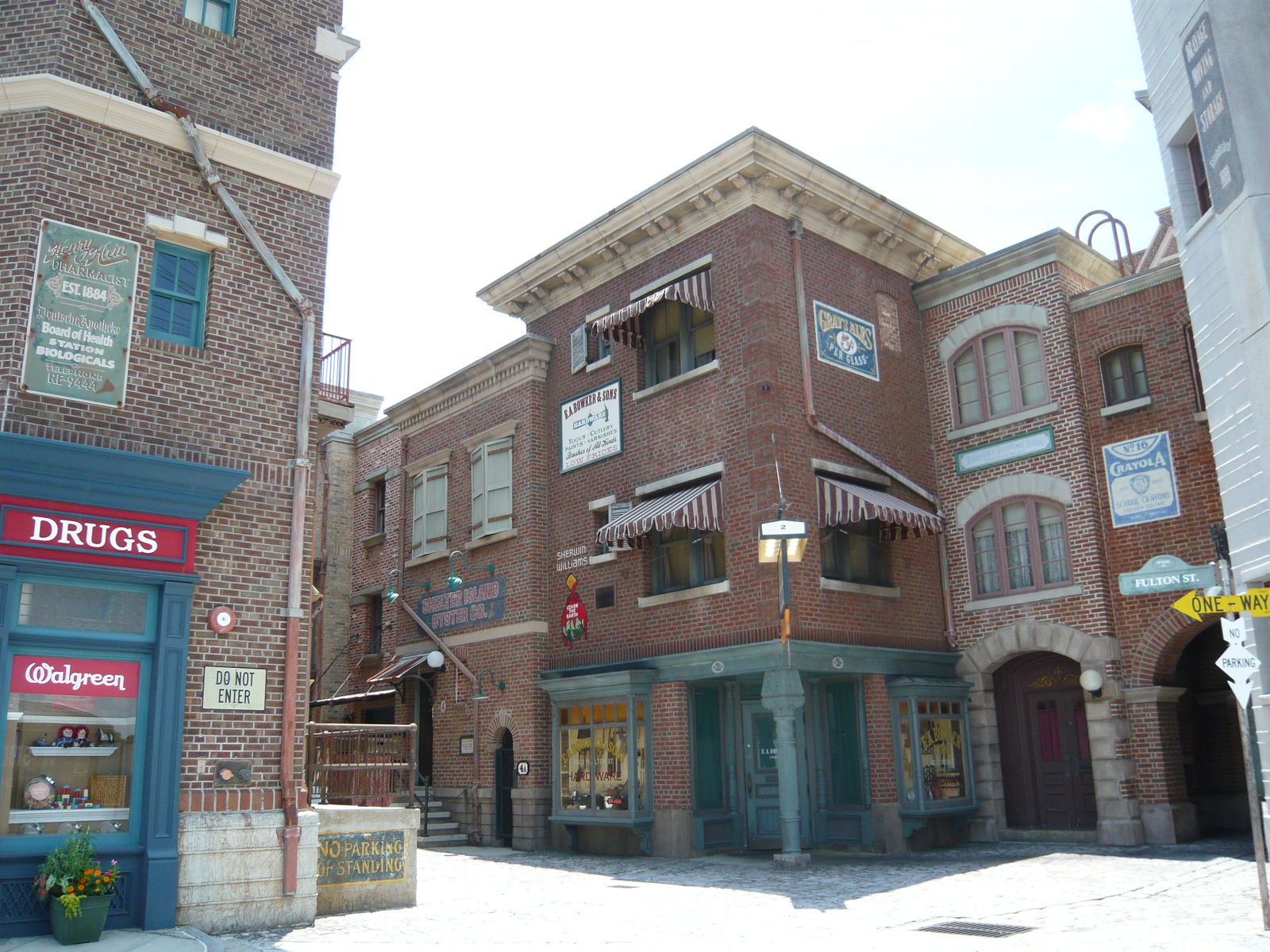 Auch hier kommt man aus dem Staunen nicht mehr heraus! Absolut Brooklyn-typische Backsteinfassaden und Feuerleitern... Wassertürme, Stromleitungen und Strassenlampen... Genial gemachte und bis ins kleinste Detail ausgestaltete fiktive Restaurants, Läden, Dienstleistungsbetriebe und Vergnügungsetablissements... Verwinkelte Seitengassen... Hebräische Schriftzeichen auf Werbetafeln - wohl eine Hommage an die New Yorker East Side. Eine Werbung für Asthma-Zigaretten in einem Apotheken-Schaufenster - "Good for your health!" Absolut typische Fronttreppen und Kellereingänge zu den Häusern... Hat man in Frisco noch grosse Augen gemacht, klappt einem hier die Kinnlade runter! Hier kann man sich echt kaum sattsehen. So schön, so kreativ, so detailverliebt, stellenweise verblüffend authentisch und einfach total genial gemacht! Dieses Level an Themeing kann wohl nur noch Disney toppen.