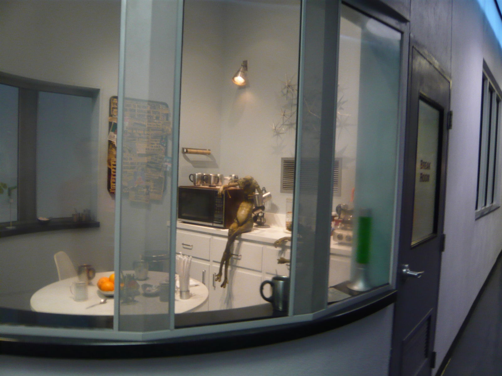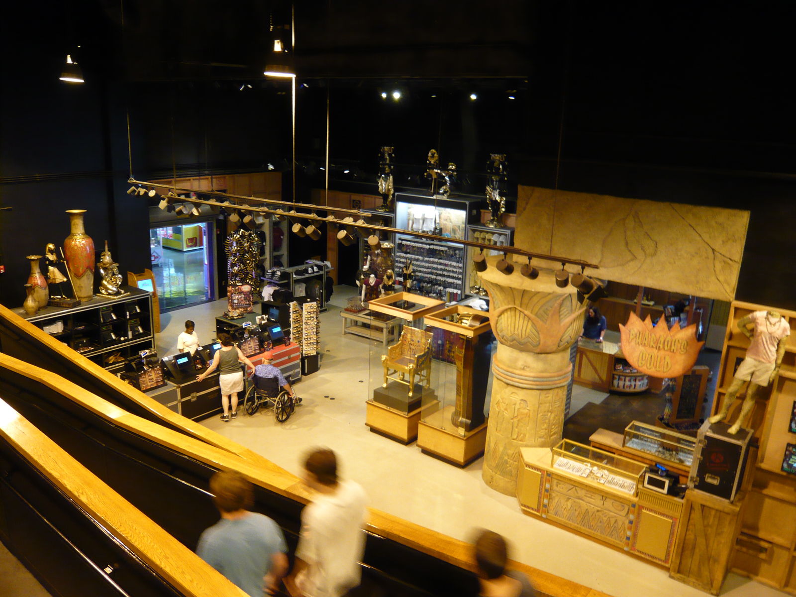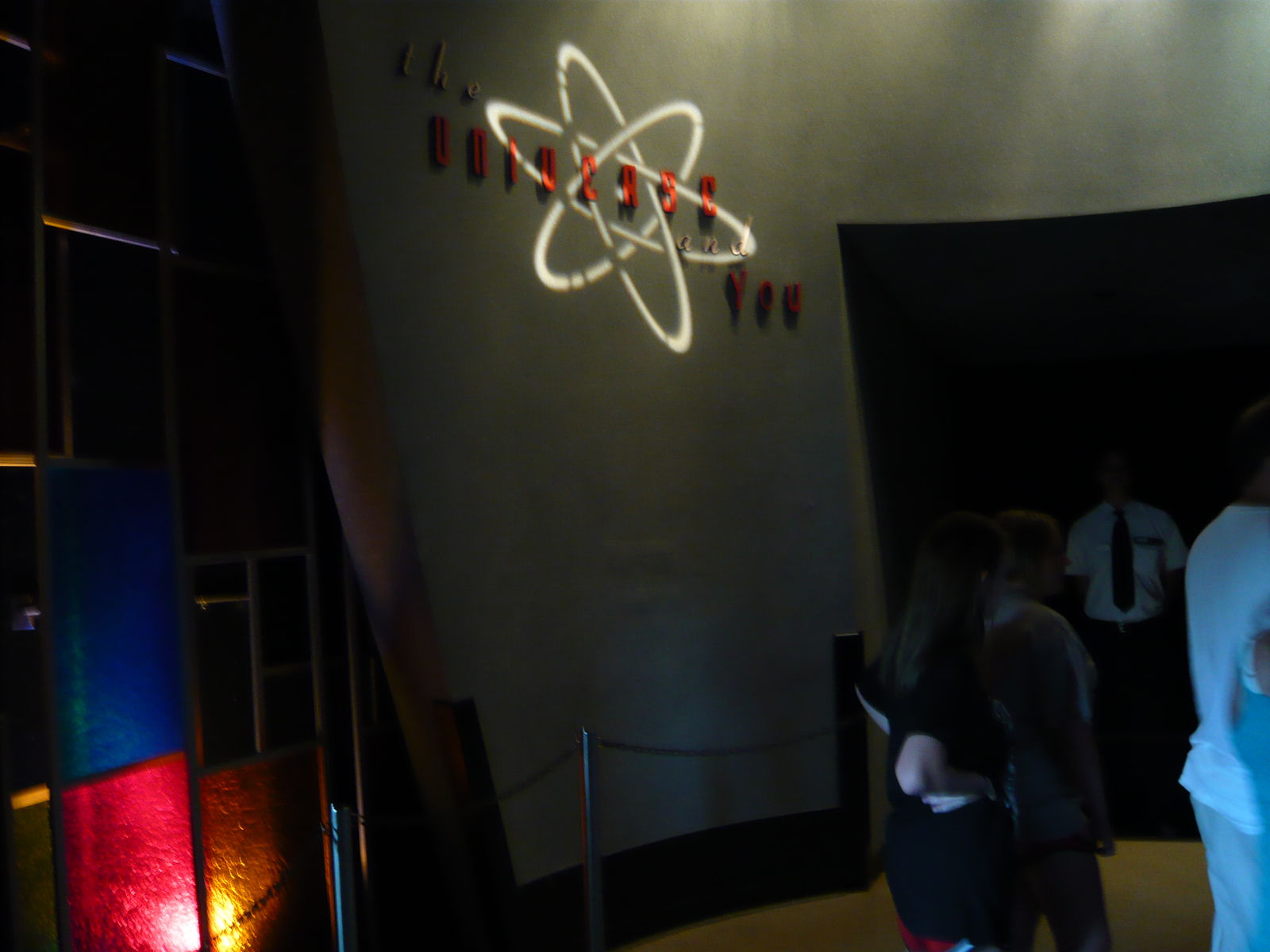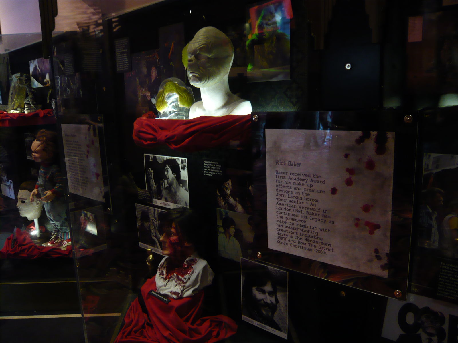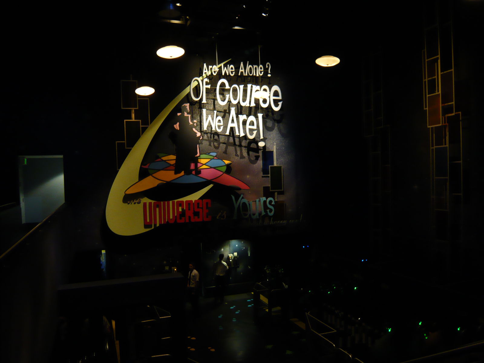 In der Vorhalle kann man vor der Show ein paar besonders berühmte maskenbildnerische Accessoires hinter Glasscheiben bestaunen, ausserdem wird auf Schautafeln verschiedenes "Did you know...?"-Wissen beschrieben. Da die Show erst in einer Viertelstunde starten würde, haben wir es anderen Gästen gleichgetan und haben uns auf den flauschigen Teppichboden und an die Wand angelehnt hingesetzt. Hier hatten wir ein irgendwie unschmeichelhaftes Erlebnis, das im Nachhinein betrachtet aber extrem lustig und erzählenswert ist. Ein indischer Tourist mit Sandalen wollte mit seiner Reisegruppe unbedingt die ganzen Requisiten an den Wänden ansehen. Als er dann die Ausstellungsstücke bei uns in der Nähe eingiebig betrachtet hat, mussten wir vor seinem wirklich scheusslichen Fussgestank fliehen, sind aufgestanden und haben uns in eine andere Ecke gesetzt. Wir konnten danach beobachten, wie sich dieses Schauspiel dann bei allen anderen am Boden sitzenden Parkgästen auf genau dieselbe Weise reihum im Saal wiederholte.