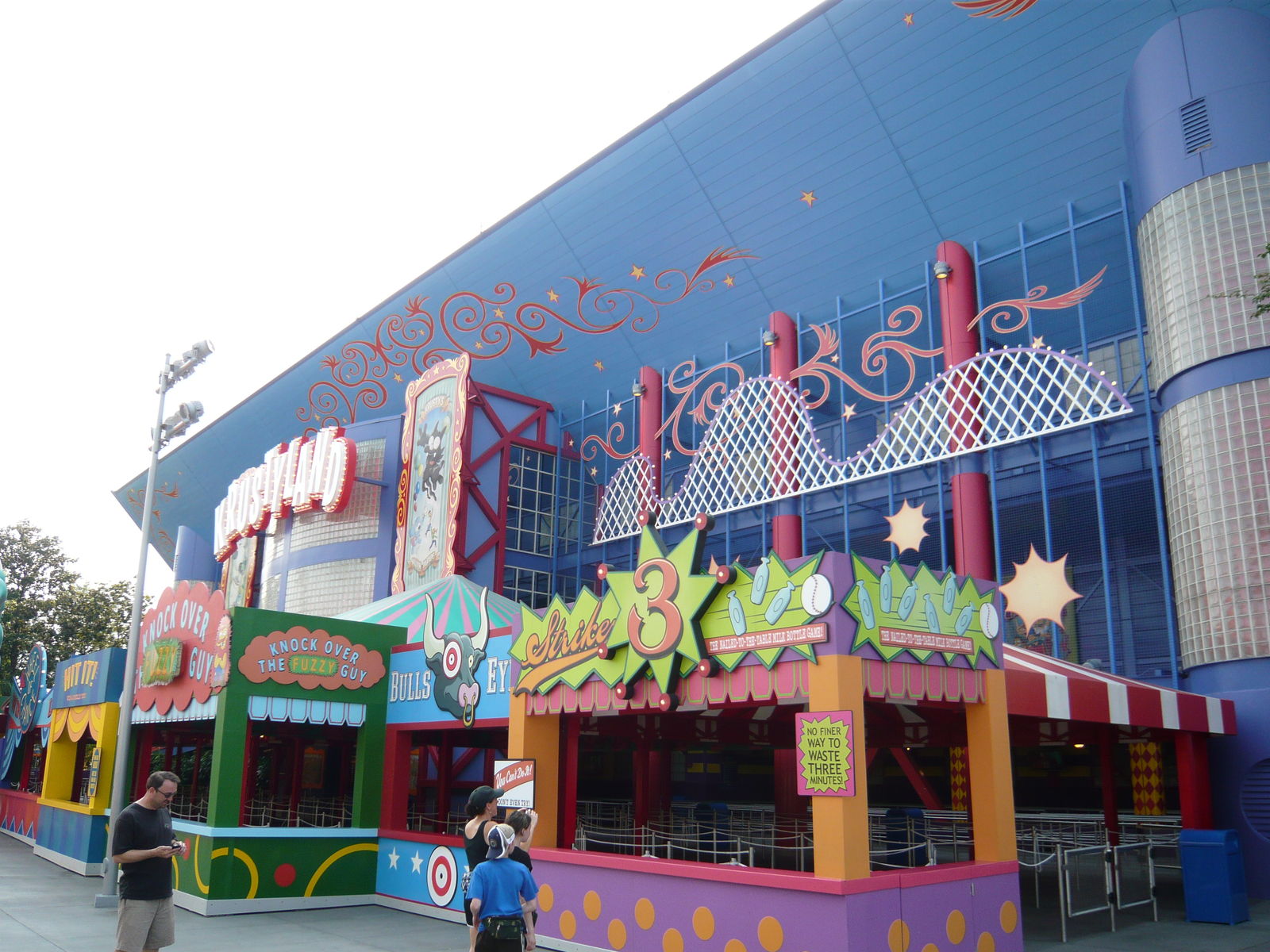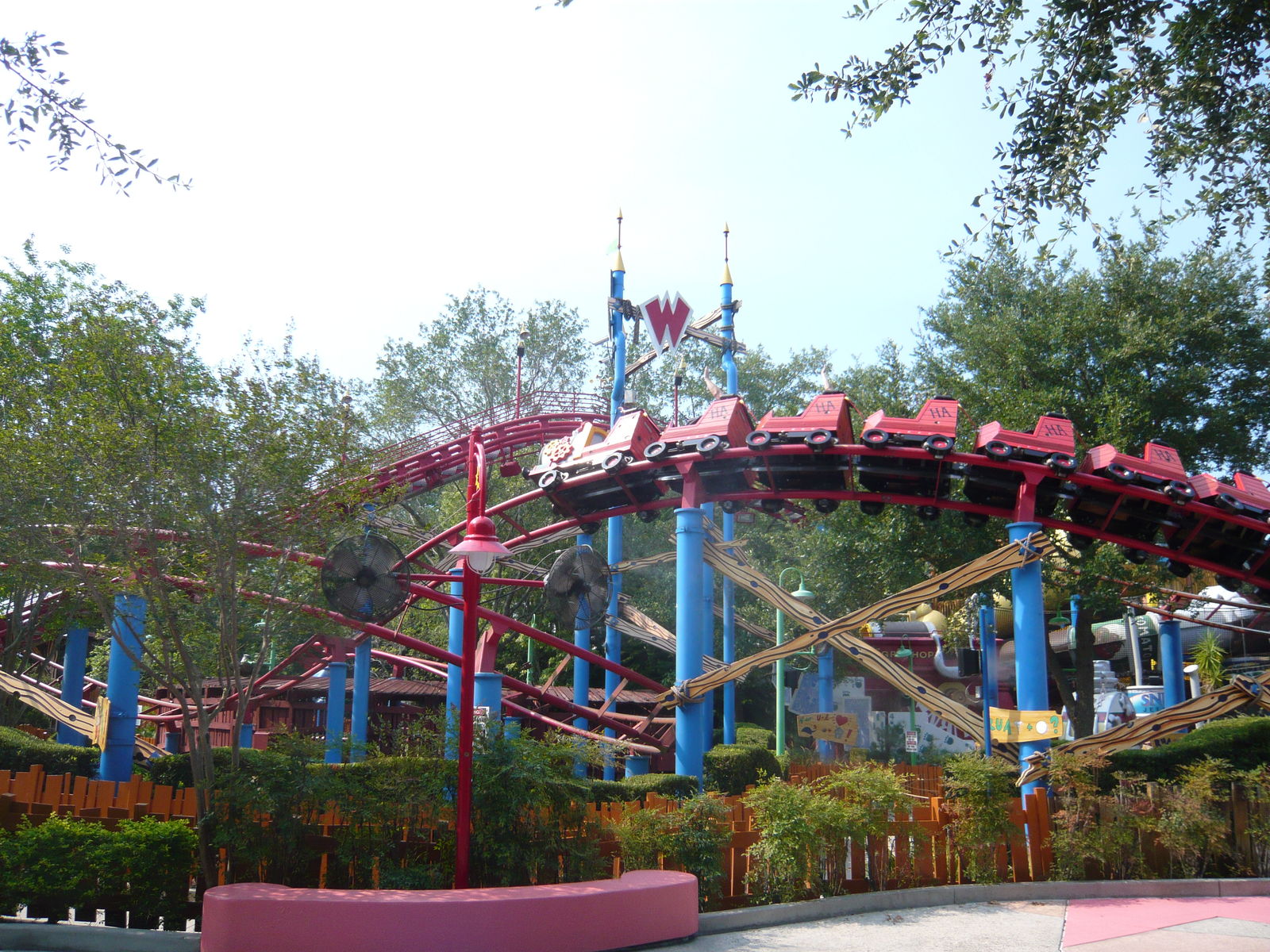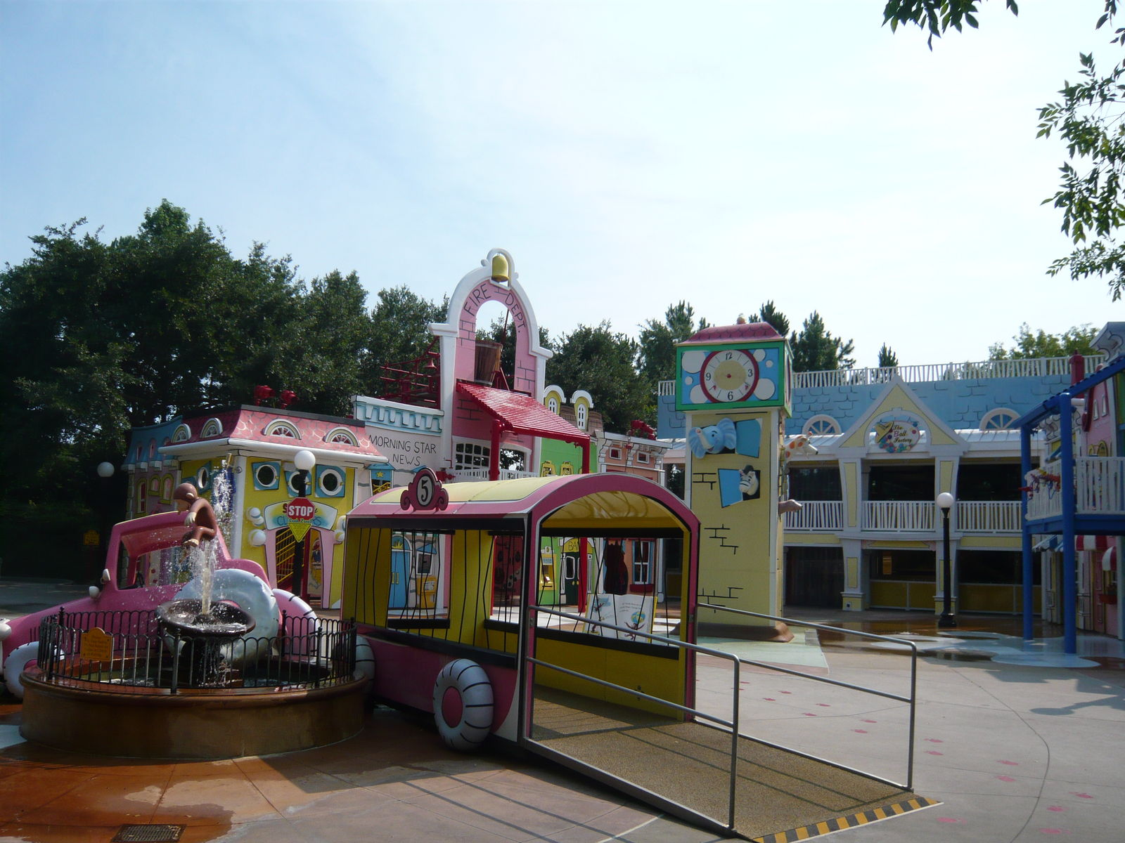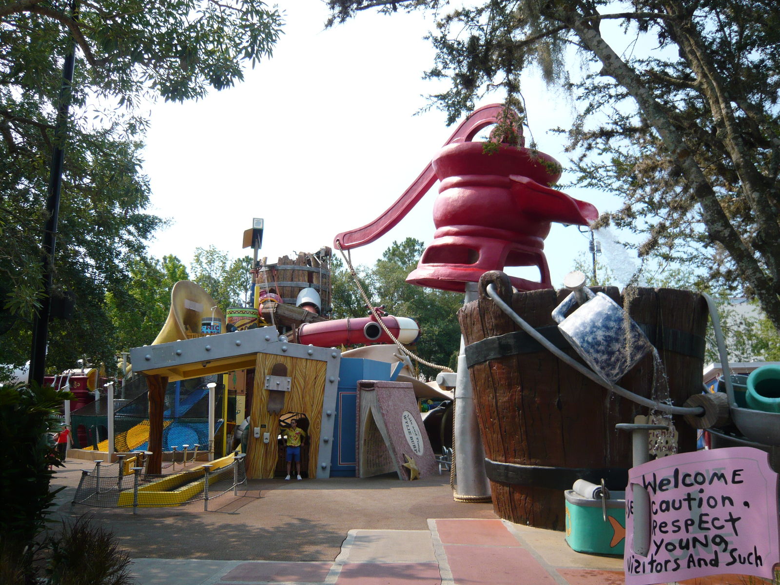 Anschliessend haben wir noch eine kurze Erkundungstour durch das herzig gestaltete Kinderland gemacht. Hier gibt es eine Woody Woodpecker-Achterbahn, eine Barney-Show, einen nach Feivel, dem Mauswanderer thematisierten Wasserspielplatz mit Schlauchboot-Röhrenrutsche und irgend eine Attraktion mit Coco, dem neugierigen Affen. Sieht hübsch aus!