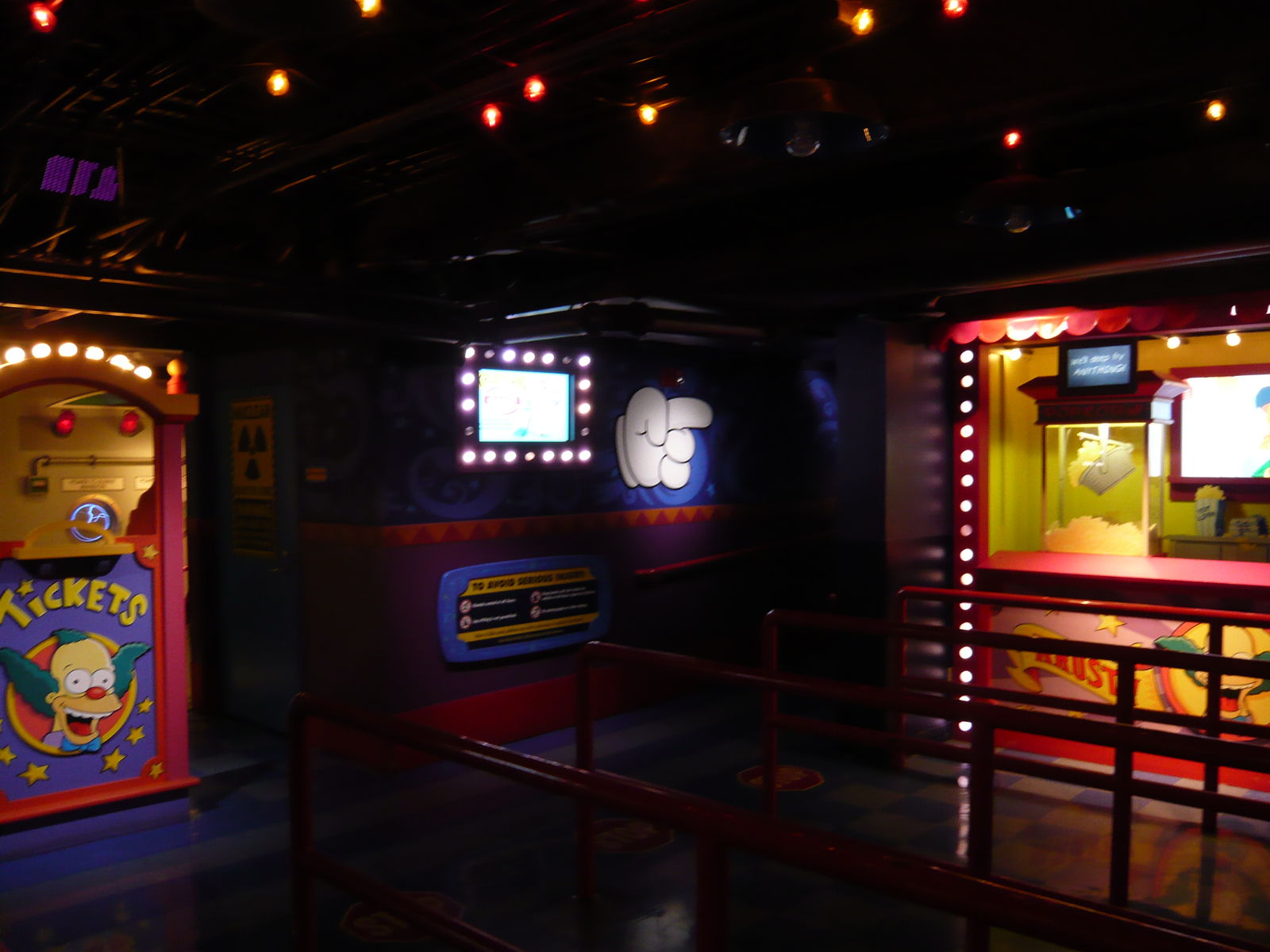 Die Queue und die Preshow-Räume sind absolut genial als leicht vergammeltes Krustyland gestaltet und zahlreiche Videoeinspielungen mit sehr vielen der verschiedenen Figuren mit ihren Catchphrases und typischem Simpsons-Humor sind der absolute Brüller! Da merkt man wirklich, dass wohl originale Drehbuchautoren der Show am Werk waren. Die besten Passagen hat natürlich wieder einmal Homer zu bieten, ganz besonders auf einer selbstreflexiven Ebene zum tatsächlichen Fahrerlebnis.