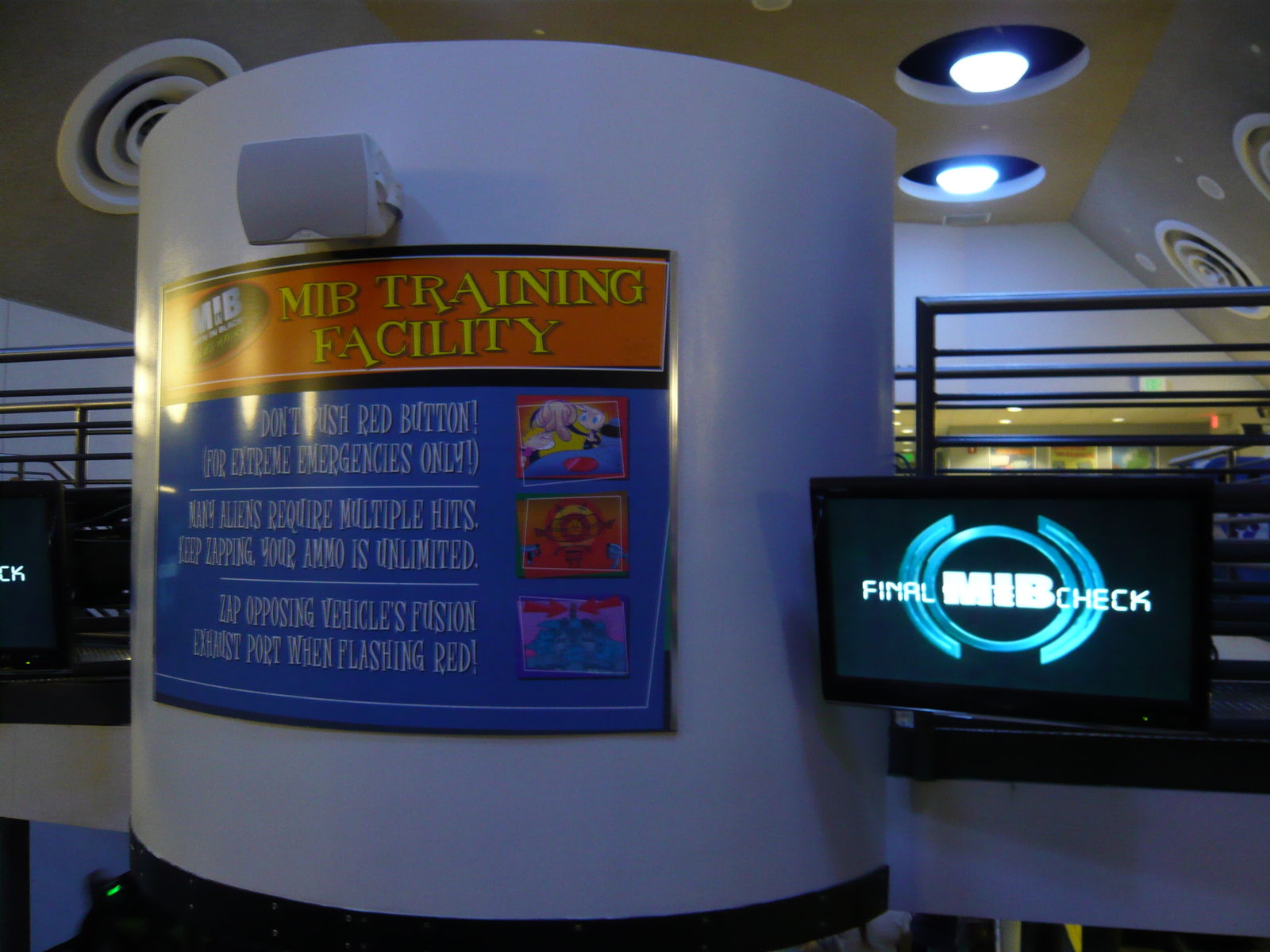 Zum Abschluss gibt es in einem herrlichen Stroboskop-Nebel-Abschnitt nochmals eine grosse Portion Eigenachsendrehung für alle, danach findet Will Smith persönlich, dass wir "cosmically average" geschossen haben. Mit einem aus verschiedenen Filmen bekannten "Erinnerungslöschungs-Stab" wird man dann geflasht und findet sich bald im Aussteigebereich der Attraktion wieder, wo die Pointe des eingangs gezeigten Dokfilms wieder aufgenommen wird: "Are we alone? Of course we are." Hierauf wird man dann durch den Souvenirshop entlassen. Ein einfach sensationeller interaktiver Darkride, genial gestaltet und durch die Gondelrotationen auch sehr actiongeladen! Echt klasse!