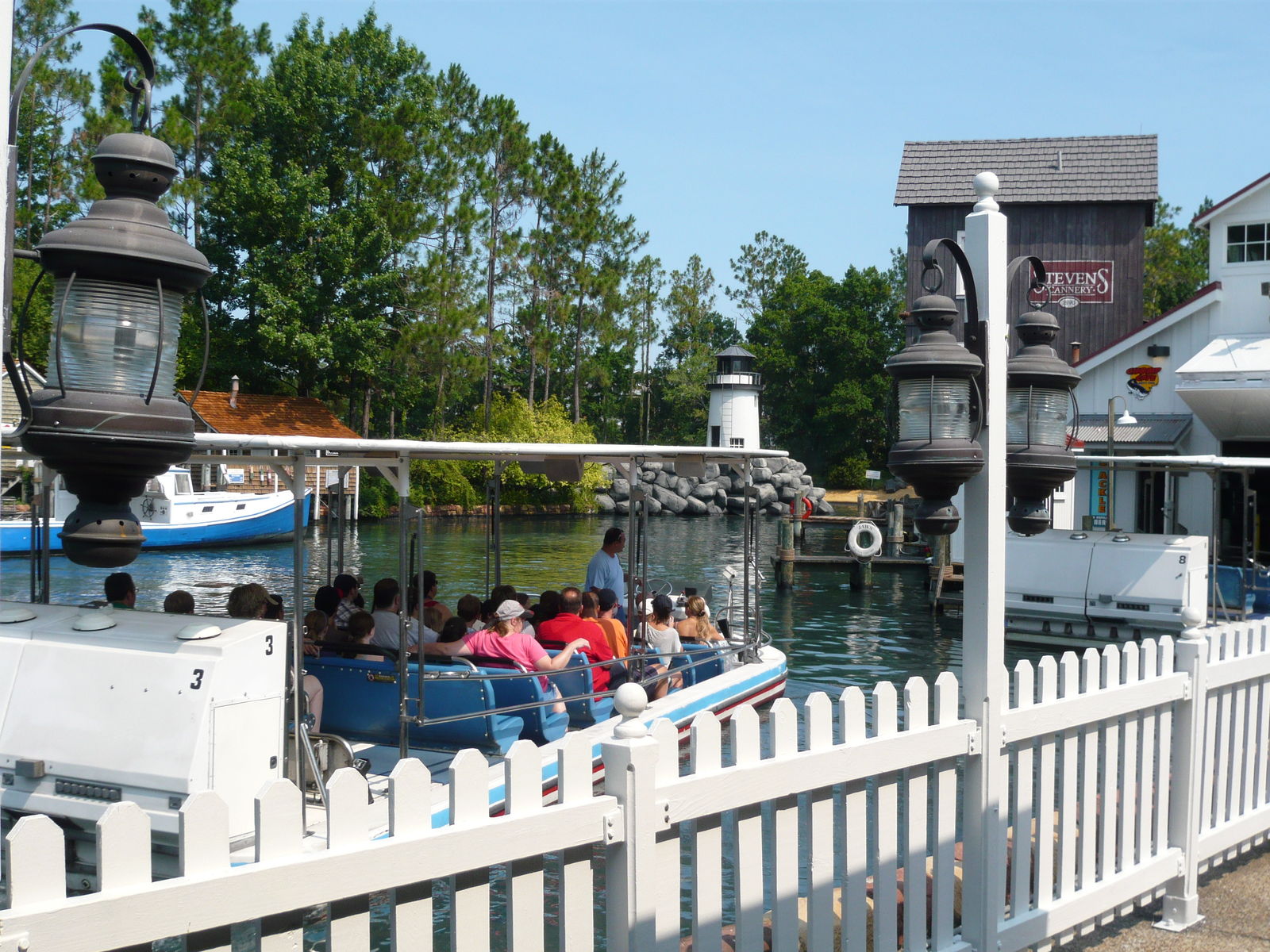 In Hollywood ist dies ein Szenensegment der Tramtour, hier ist es eine eigenständige Bootsfahrt durch einen mit viel Liebe zum Detail nachgestellten Pazifikküstenabschnitt mit typischen Häusern und Hafengebäuden. Der Spass hängt hier im wesentlichen von der Motivation des Bootkapitäns ab, der seinen Fahrgästen eigentlich nur die schöne Gegend zeigen will, aber per Funk immer wieder beunruhigende Meldungen über Haisichtungen erhält. Tatsächlich sieht man, begleitet vom berühmten Filmsoundtrack, immer mal wieder seine Rückenflosse ums Boot herumschwirren und dreimal taucht der heutzutage recht billig aussehende Plastikhai dann auch recht nahe neben dem Boot auf. Ausgewichen wird in in kurz vor der Explosion stehende "Bootsgaragen" und verschiedene Abschnitte, wo sich gerade Öl, Schiesspulver und/oder Dynamit entzünden will. Die vielen heiss spürbaren und grässlich riechenden Feuereffekte und das Spritzwasser, das man ab und zu abbekommt, sind beeindruckend und nebst der tollen Landschaftsgestaltung auch das, was einem von der Fahrt am besten in Erinnerung bleibt - denn das eigentliche Haiauftauchen ist etwas gar billig geraten. Als Gesamtpaket mit dem Themeing und den Spezialeffekten jedoch ein Riesenspass!