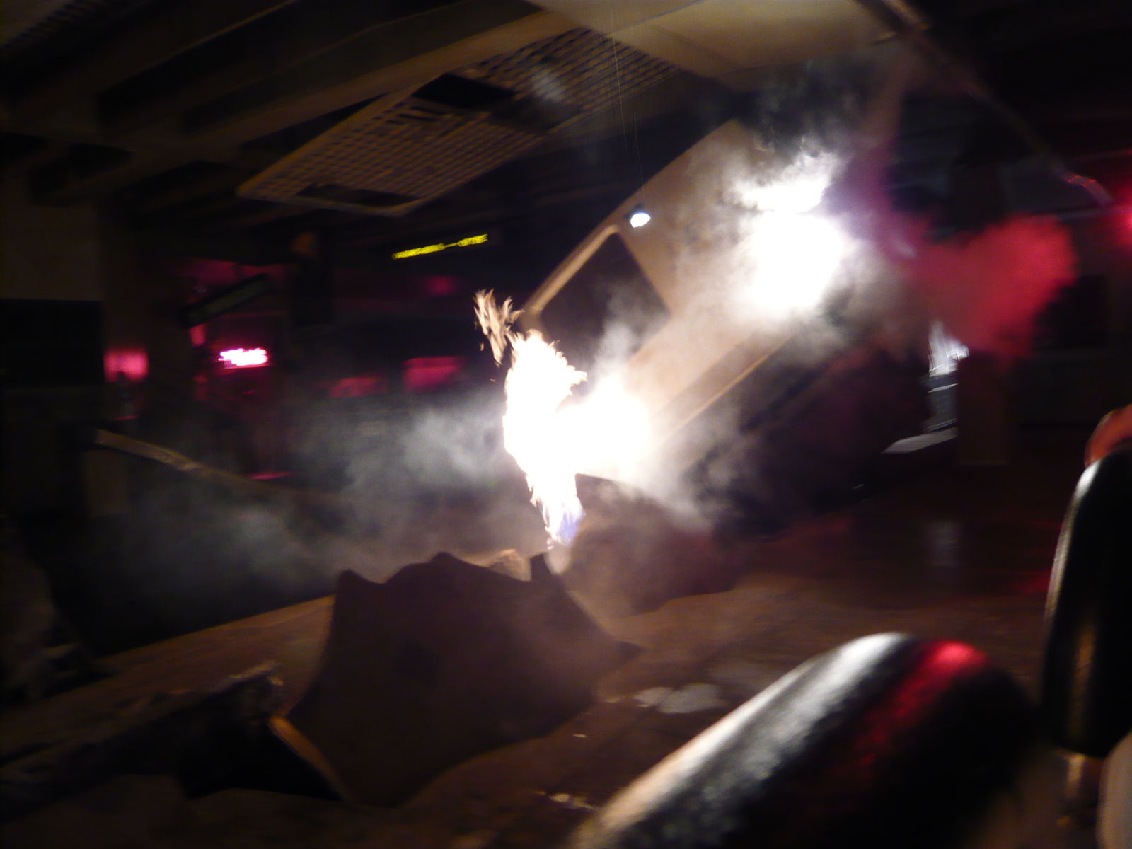Nachdem diese Greenscreen-Aufnahmen dann im Kasten sind, wird die gesamte Besuchergruppe aufgrund des tollen Mitmachens dann in einen Zug verfrachtet, der daraufhin zum Filmset einer U-Bahn-Station rollt. Dort läuft es dann gleich ab wie in Hollywood: Die Erde beginnt zu beben, Balken krachen zusammen, stark nach Chlor riechende Wassermassen rauschen die Zugangstreppen hinab, Dinge explodieren. Die Reaktionen der Zuschauer im Zug werden per Kamera festgehalten, oft wird man zum Schreien und Panikmachen aufgefordert. Irgendwann heisst es dann "Cut!" und der Zug rollt wieder zum ursprünglichen Einsteigebereich zurück.