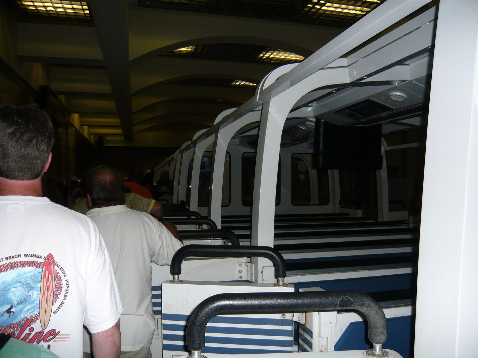 Das riesige Stationsgebäude ist total stylisch gestaltet und bietet viele optische Leckerbissen - vor allem jede Menge glänzende Metallelemente und verschiedenste bunte Lichtquellen in Form von Neonröhren, farbigen Scheinwerfern und dergleichen mehr. Nachts, wenn hier alle Lichter an sind, muss das sicherlich grossartig aussehen! Das in vielen vorab gelesenen Erfahrungsberichten als ebenfalls sehr problembehaftet beschriebene Förderband im Einsteigebereich ist den ganzen Tag über mehr oder weniger störungsfrei gelaufen. Natürlich musste es jedes Mal angehalten werden, wenn die Bahn selbst einen von ihren vielen kurzen Ausfällen hatte (alleine vor unserer ersten Fahrt des Tages zweimal!), aber die Crew weiss inzwischen offenbar wirklich gut damit umzugehen und dirigiert die Fahrgäste in effizienter Manier zu den tollen Fahrzeugen.