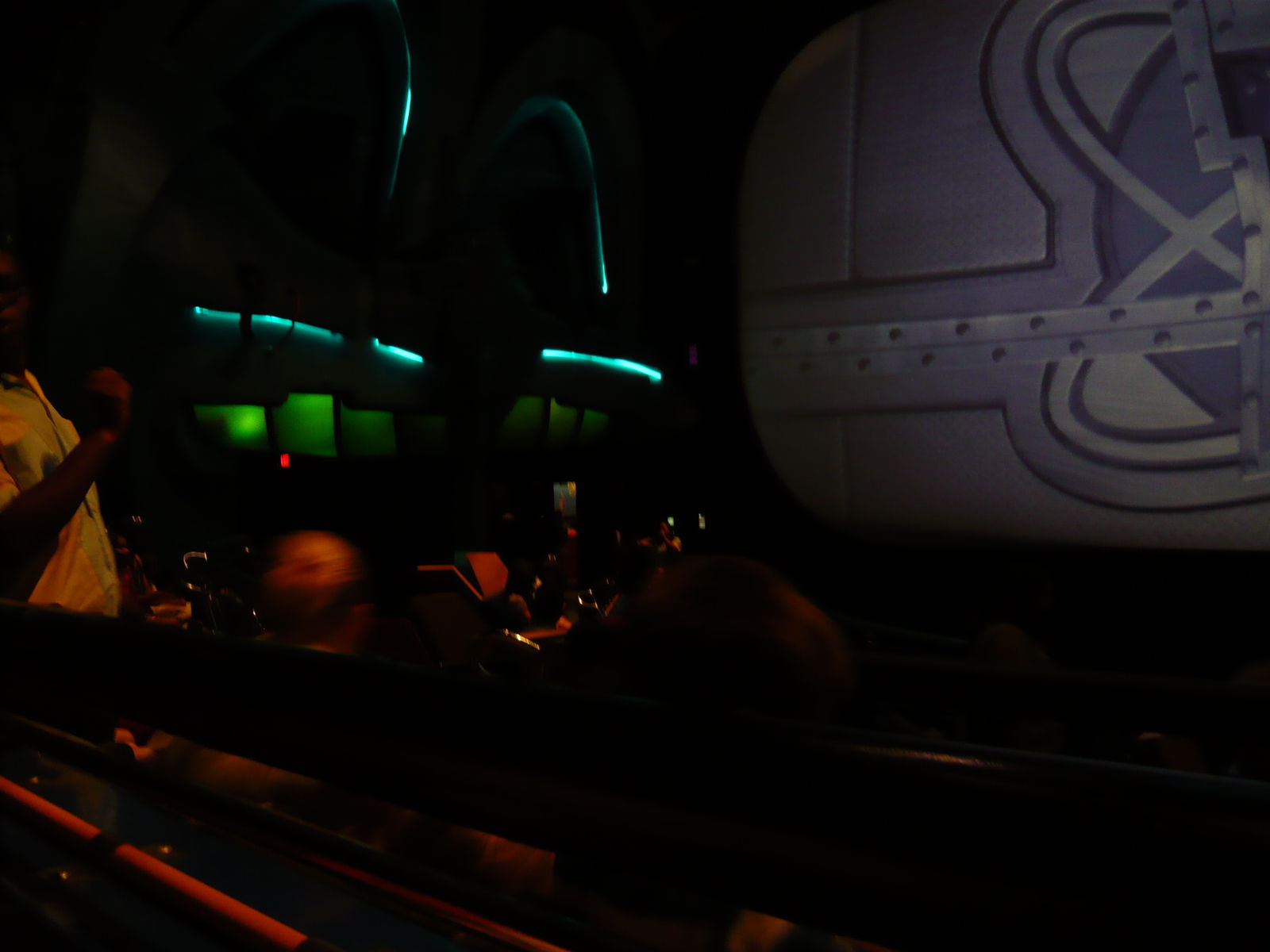 Mit Laserkanonen bewaffnet beginnt dann die eigentliche Fahrt durch ein wirklich toll gemachtes Stadtsetting, wo in allen Fassaden und Ecken gruselige Alienkreaturen lauern. Ein laserpointer-mässiges rotes Pünktchen zeigt dem Fahrgast an, wo er gerade hinzielt. Einige Male drehen sich die Gondeln sehr heftig um die eigene Achse, damit man auch alle Monster erwischen kann. Je weiter Weg das Schussziel, desto mehr Punkte gibt es auch für den jeweiligen Schützen. Viel mehr haben wir von der Fahrt im Voraus eigentlich nicht gewusst, und wer sich ab dieser Beschreibung jetzt fragt, was daran so toll sein soll, dem sei versichert: Vor Ort ist das selbst für die Hasser dieses Films einfach ein Riesenspass, weil das Ganze wirklich gut gestaltet und aufgezogen ist. Viel Dampf, tolle Lichteffekte, Stroboskope und ein genialer Soundtrack machen den Ride zu einem absoluten Knüller! Die Strecke ist doppelspurig, irgendwann kommen die beiden Schienen dann vor einer Art Spiegel zusammen. Durch diesen sieht es so aus, als ob in der parallel auf der anderen Schiene fahrenden Gondel Aliens drinsitzen (funktioniert wahrscheinlich ähnlich wie die Spiegel in den Haunted Mansions oder dem Geisterschloss im Europa-Park, aber doppelseitig). Wenn man es schafft, die rot blinkende "Antenne" über der hinteren Sitzreihe des gegnerischen Fahrzeugs zu treffen, kann man es in rasante Rotation versetzen! Offenbar haben das bei unserer Fahrt beide Seiten geschafft, denn soweit wir das mitbekommen haben hat sich die Gondel auf der anderen Seite kurzzeitig genau so heftig gedreht wie unsere! Und mit heftig meine ich heftig - hier wird man einige Male fest in die Sitzschale und dann wieder gegen den Sicherheitsbügel gepresst.