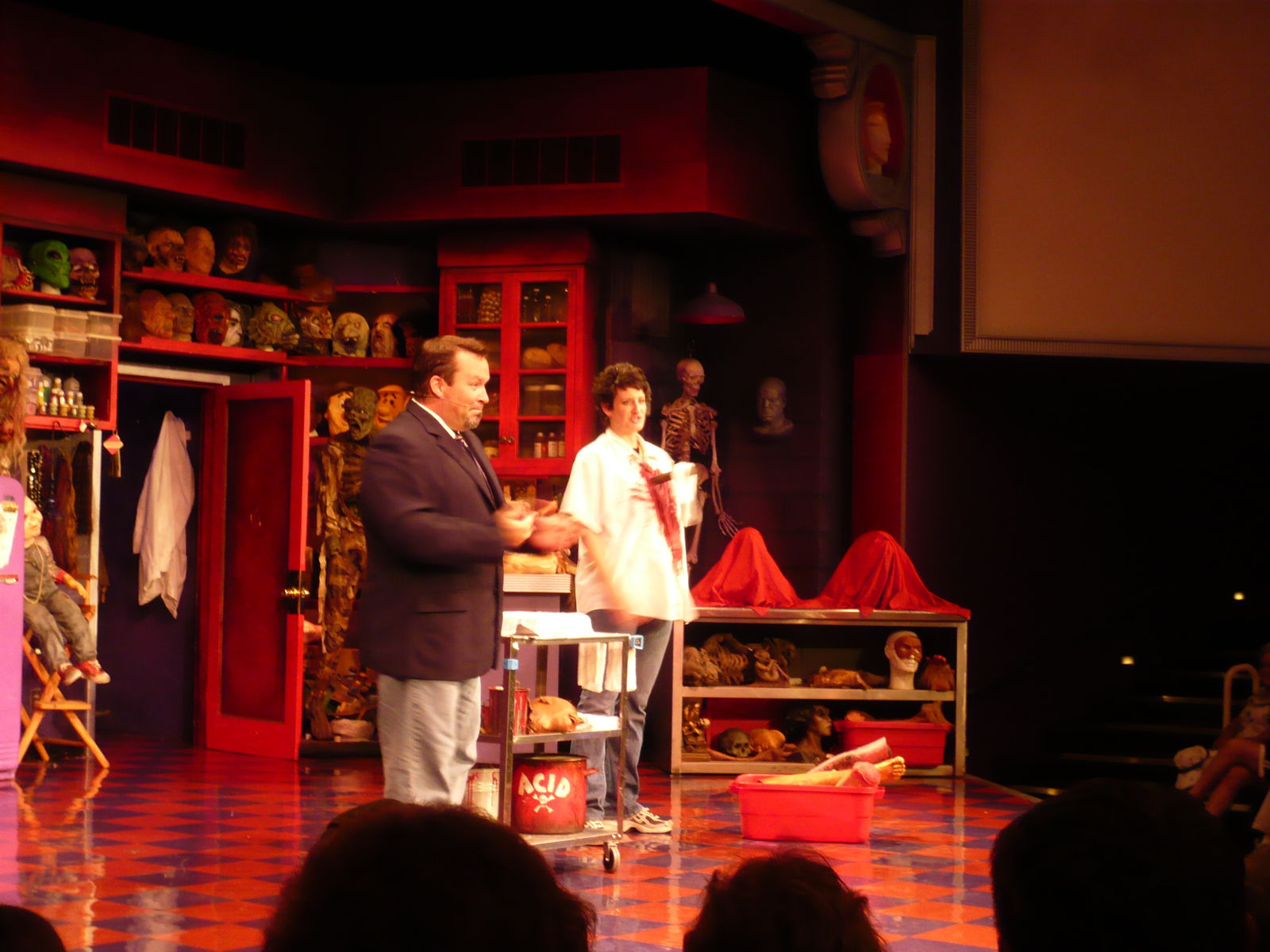 Die eigentliche Show war dann mein persönliches Highlight im Park! Über Make-up und Special Effects hat man zwar herzlich wenig und eigentlich nicht viel mehr gelernt, als man den Infotafeln in der Empfangshalle entnehmen kann, aber die Publikumsinteraktion war einfach zum Schiessen! Auf Schweizer Dialekt würde man sagen, dass die weibliche Gastgeberin ein unglaubliches "Beeri" ist. Als sie zu Beginn der Show mit einem Kunstmesser im Bauch röchelnd auf der Bühne erschien, hat sie die lächerlichsten Quietschlaute von sich gegeben, dabei aber stets einen süssen Typen im Publikum noch breit angelächelt und hat ihn hauchend um Hilfe gebeten. Als dabei dann aber nichts Fruchtbares zurückgekommen ist, hat sie ihn die ganze Show durch immer mal wieder angeschnauzt und in ihre Kommentare eingebaut. Eigentlich hat sie sich mit jedem, der sie irgendwie schief angesehen hat, die ganze Show über angelegt. Vor allem ein Typ mit "Justin Bieber-Frisur" namens Moss war immer wieder der Arsch bei ihr. Immer mal wieder hiess es: "And then: Blood! Horror! Despair! Violence! Terror! Mooosss!", "Kinda like you there, Moss!" oder auch "With the exception of Moss, who likes his shiny Justin Bieber hair!"