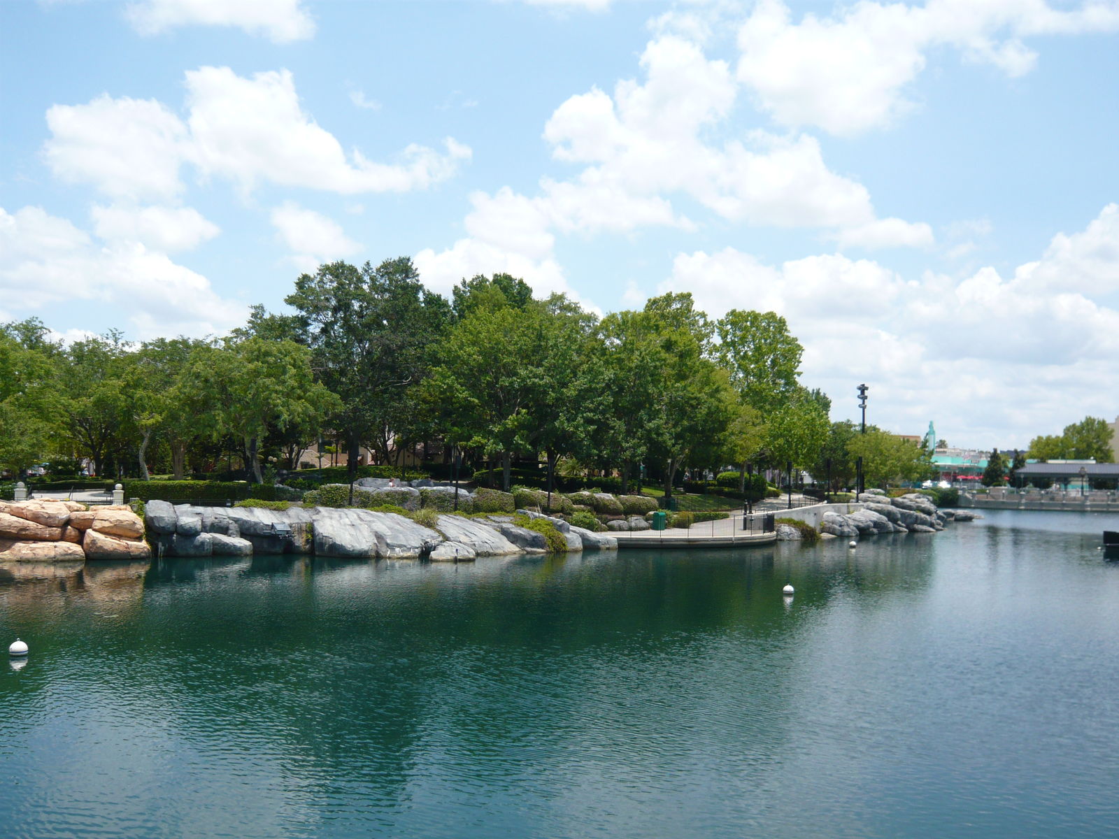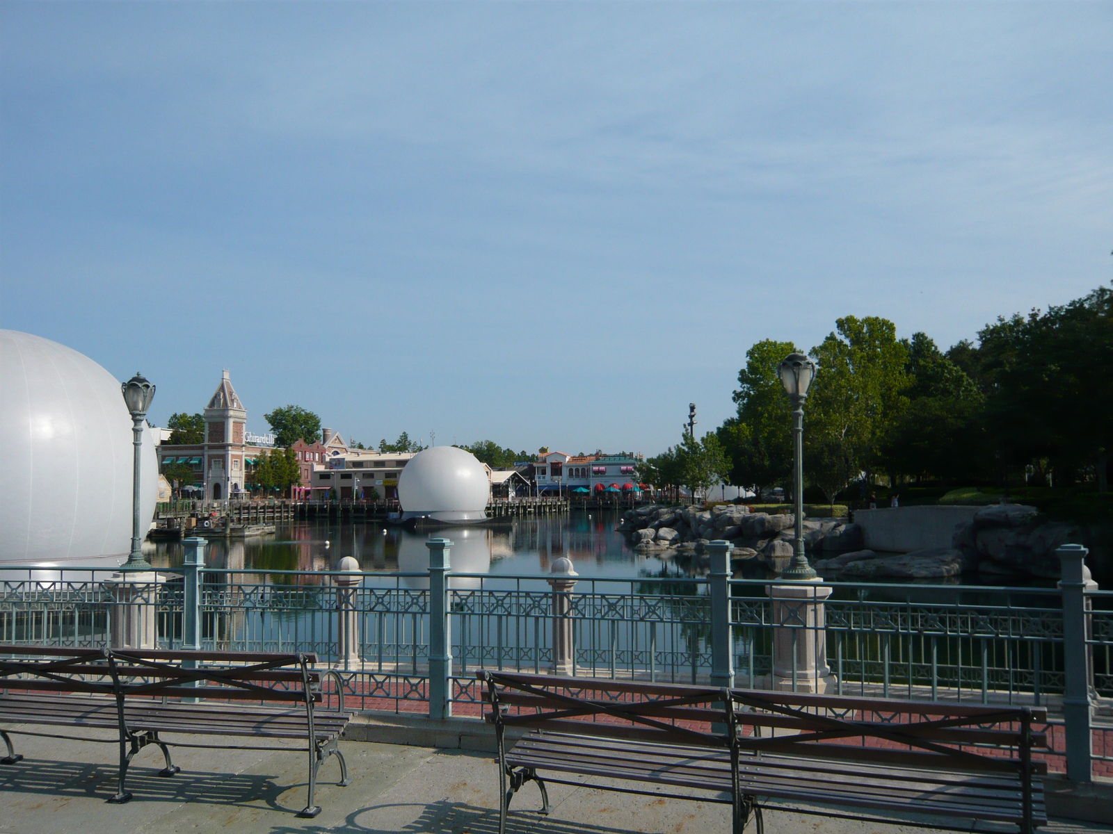 Als Abschluss dieses wieder elends lange geratenen Berichts habe ich noch ein paar Bilder vom See in der Mitte des Parks, um den sich mehr oder weniger alle Themenbereiche und Attraktionen gruppieren. Die weissen Kugeln sind für eine abendlich stattfindende Multimedia-Lichtshow installiert, angeblich werden dann Filmausschnitte darauf projiziert.