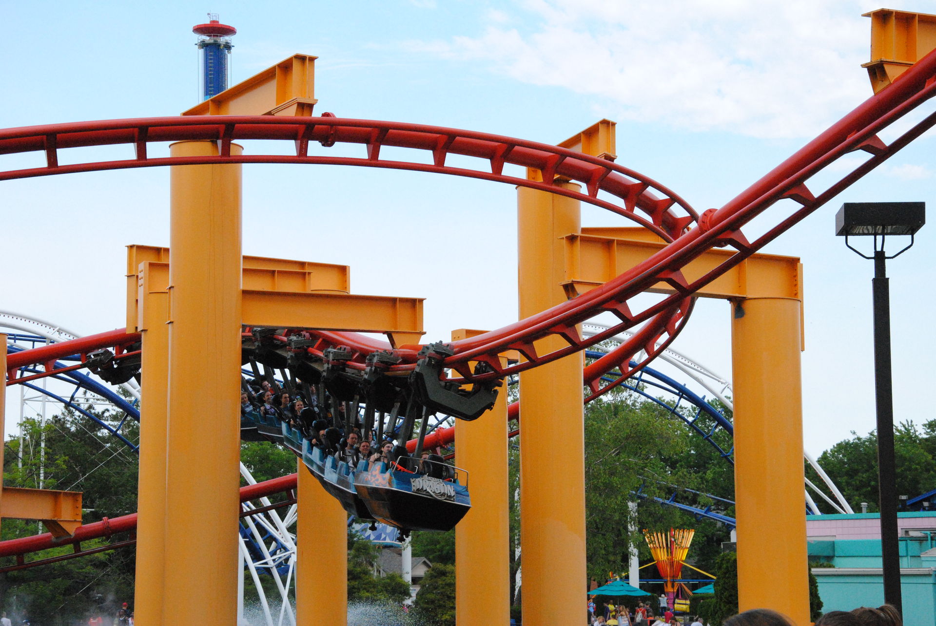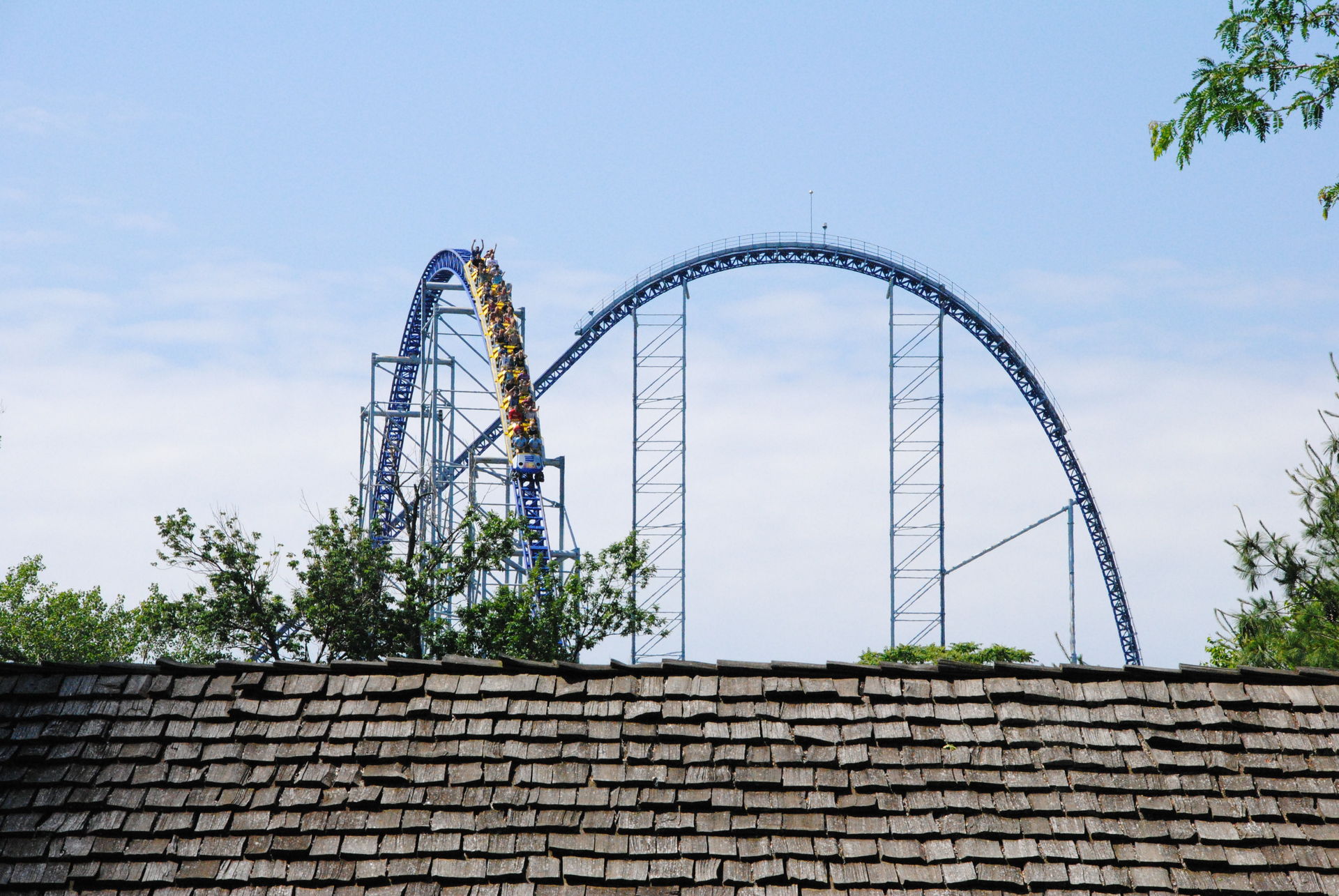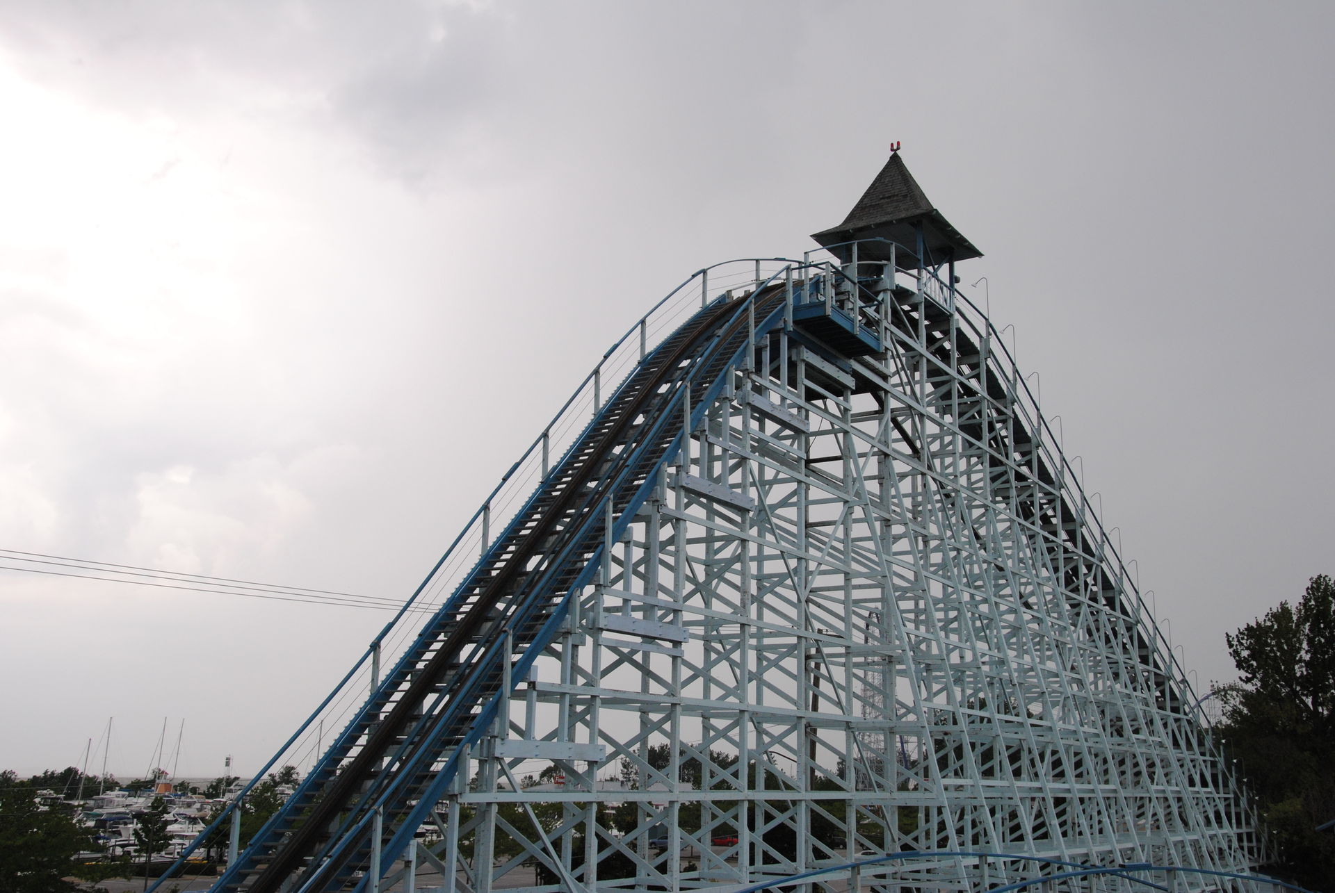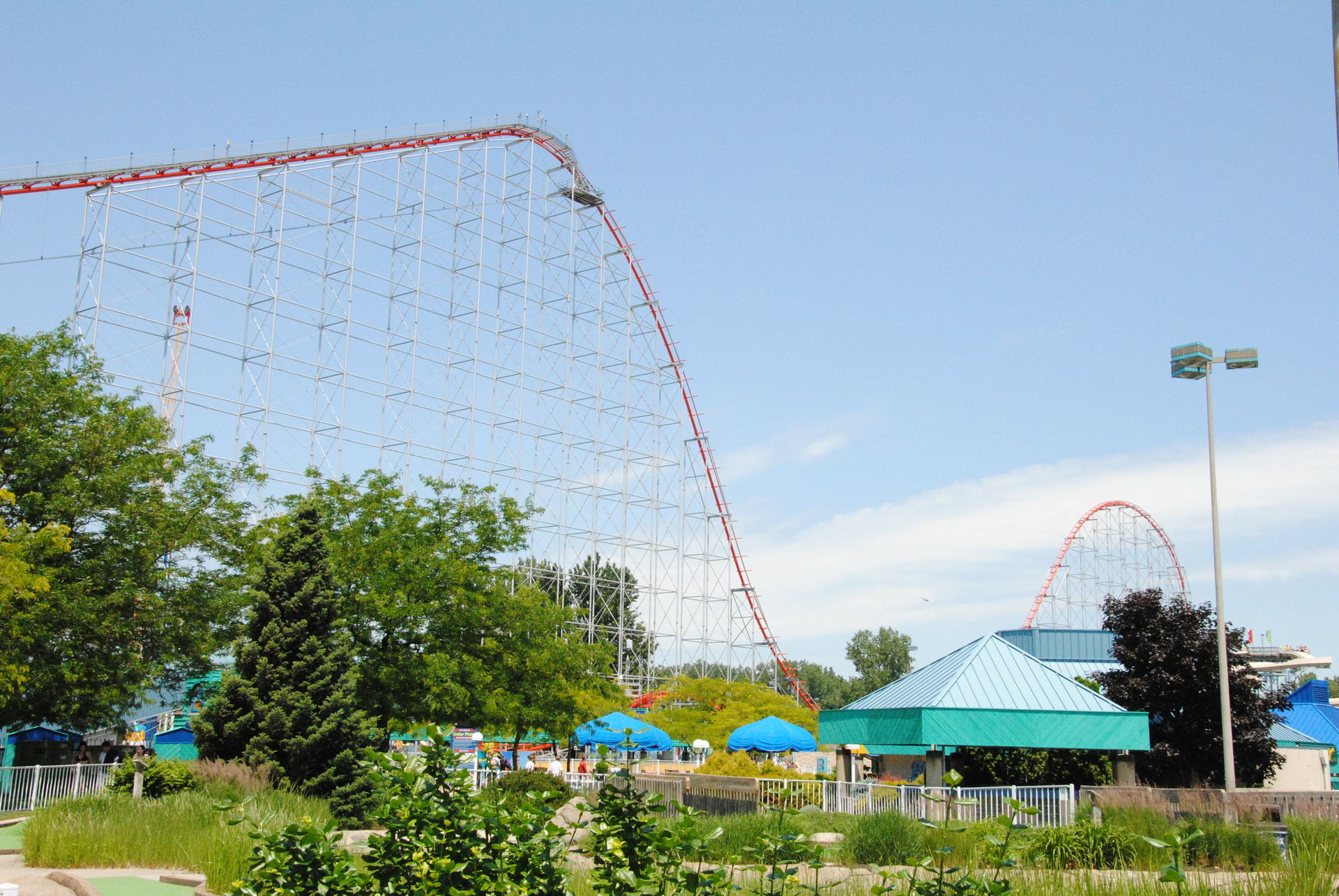 Weiter ging es mit der ältesten aktiven Bahn in Cedar Point, der Holzachterbahn Blue Streak. Das Out und back Layout verläuft entlang des Parkrandes und erlaubt auch einige Blicke auf die benachbarte Marina. Ohne jegliche Wartezeit konnte man hier sofort einsteigen und den Parcours mit den zahlreichen Camelbacks absolvieren. Diese sorgen durchaus für ordentliche
