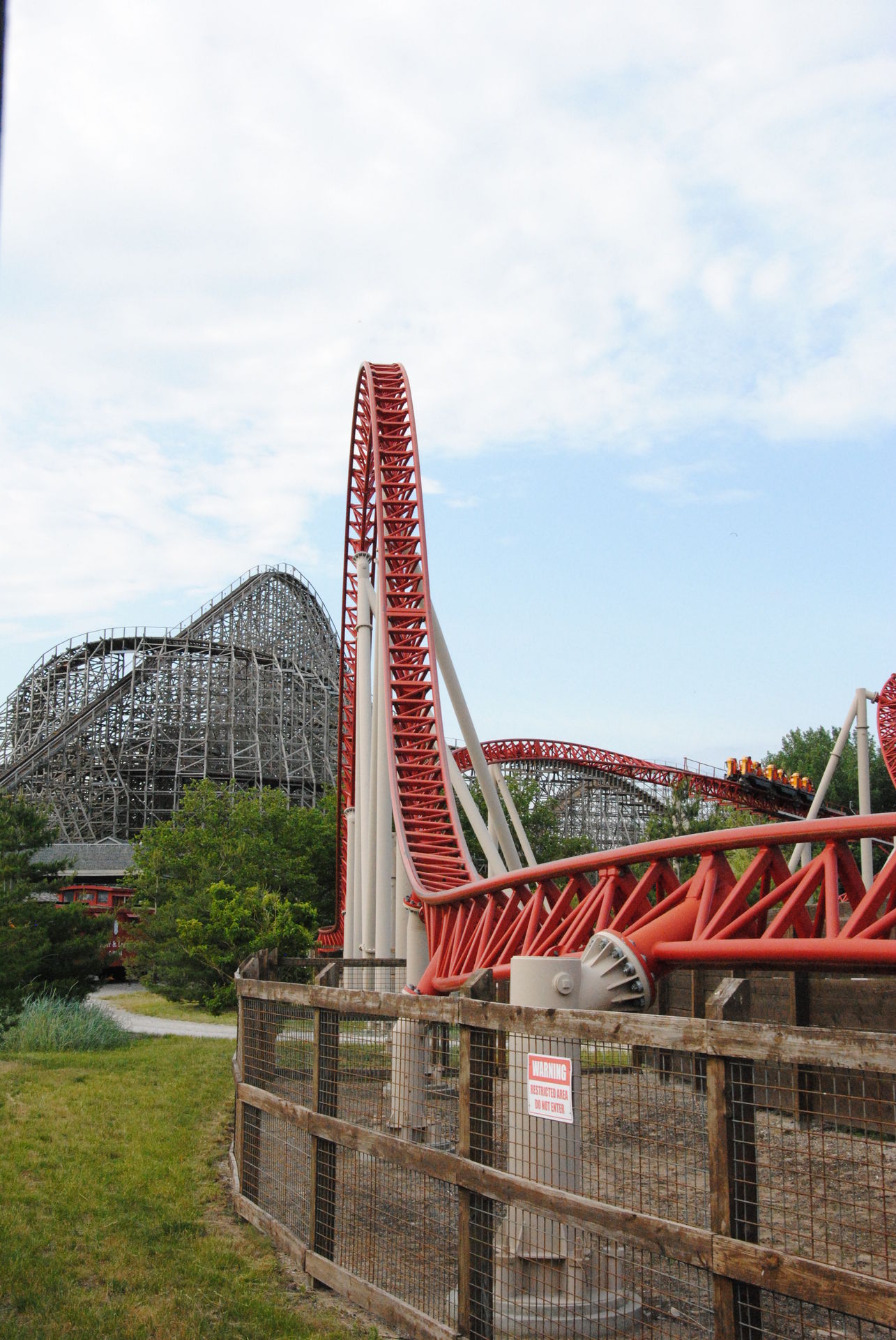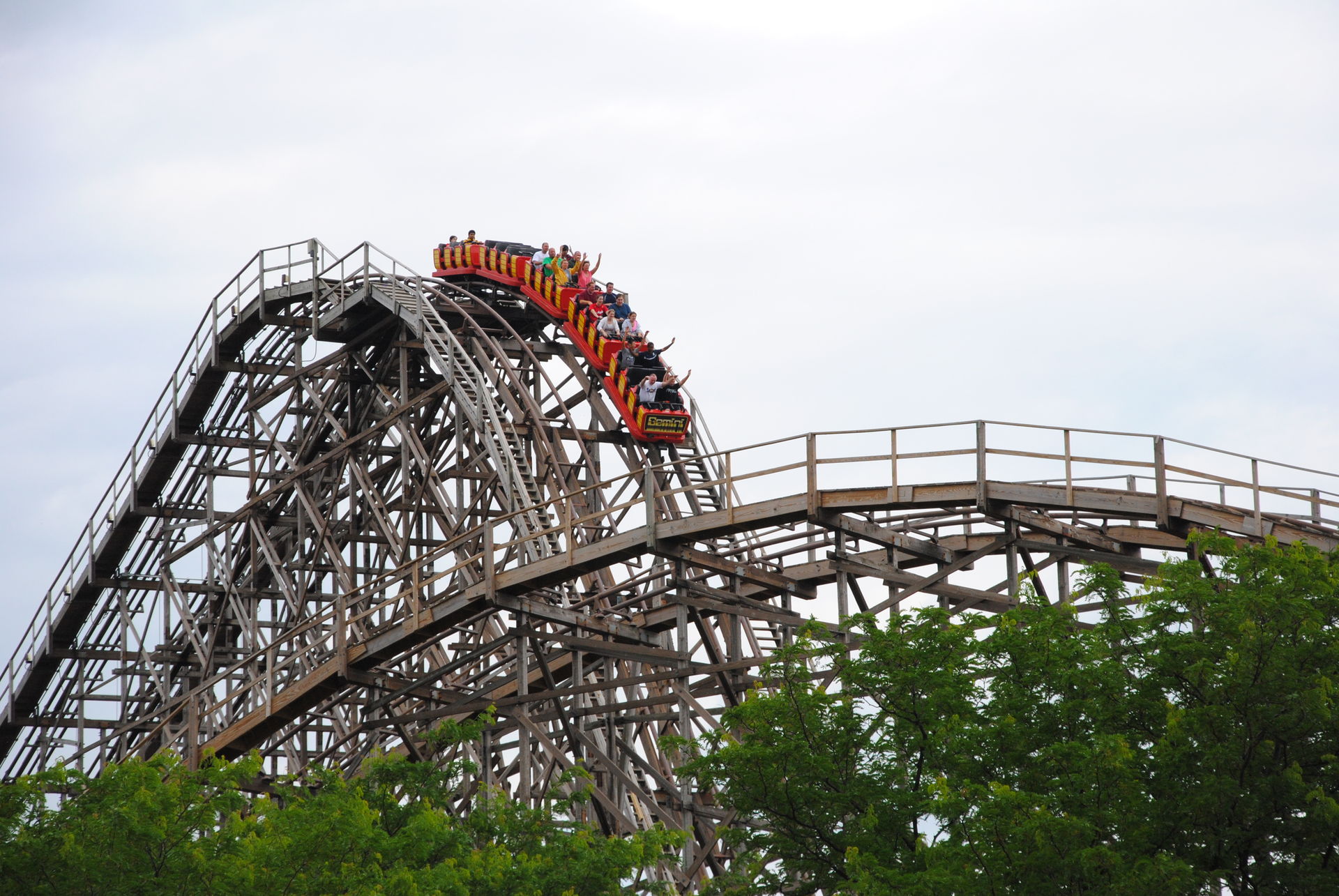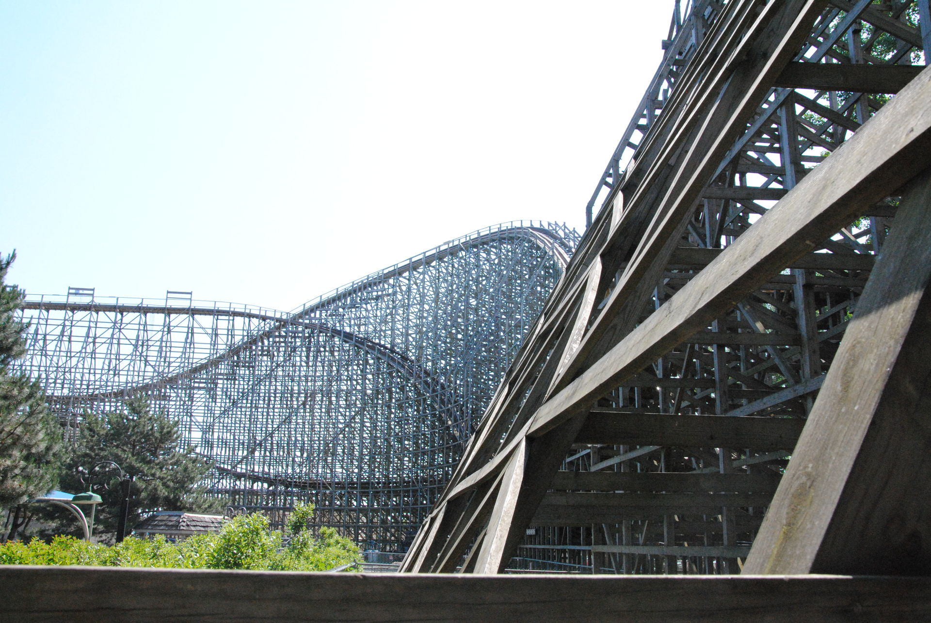 Wir gehen nur wenige Meter und landen bei Gemini, einem doppelspurigen Hybrid mit Holzstruktur und Stahlschiene. Hier gab es gravierende Unterschiede ob man auf oder neben der Achse saß, letzteres war deutlich angenehmer. Der Racing-Effekt kommt bei der Bahn Richtung gut zum Tragen, da die Züge sich mehrmals während der Fahrt gegenseitig überholen und man bis zur Ziellinie nicht weiß, wer gewinnt. Zeitweise war auch nur eine Spur in Betrieb.